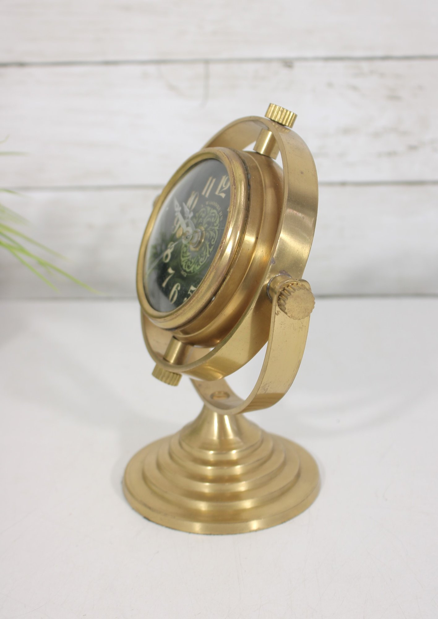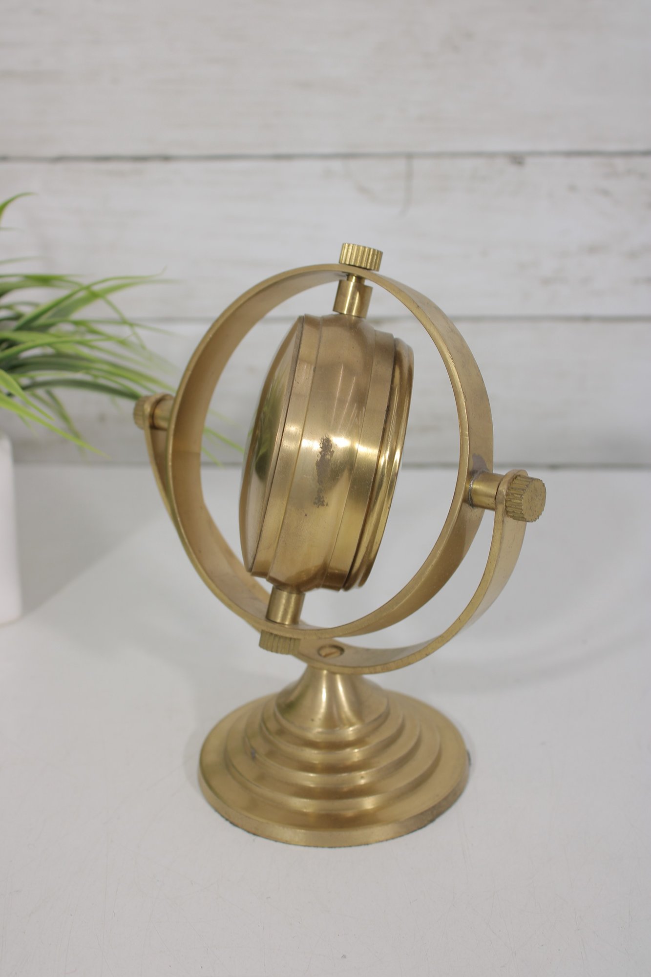 The pedestal base adds stability and elegance, making this a standout decorative piece for desks, shelves, or mantels. Its distinctive design blends vintage charm with a slightly industrial, nautical feel.