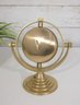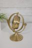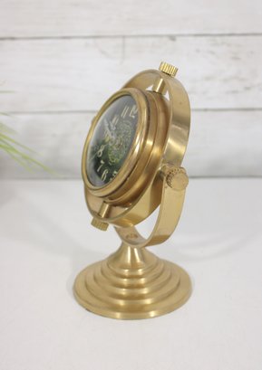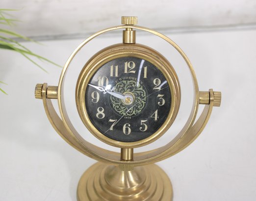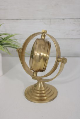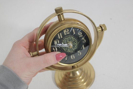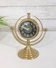 Unique vintage-style brass table clock featuring a striking gyroscope-inspired design. The clock face is suspended within a circular frame, allowing it to tilt and rotate for adjustable viewing angles. The black dial with ornate detailing and bold Arabic numerals provides a classic contrast against the warm brass finish.