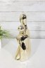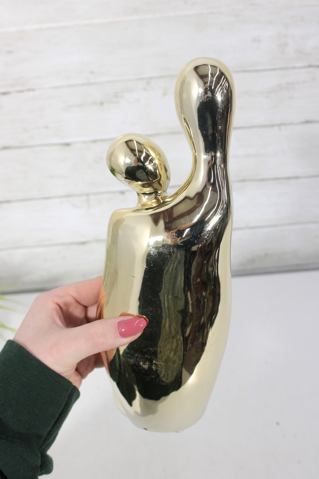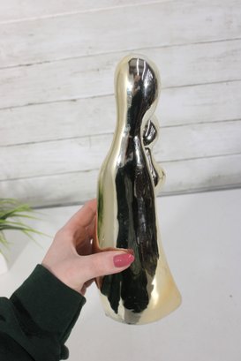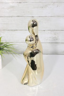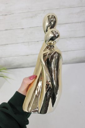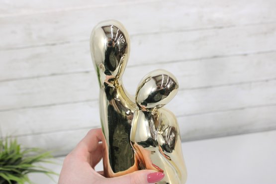 Striking vintage brass tone sculpture depicting a stylized mother and child in a graceful, modernist form. The smooth flowing lines and polished brass finish create an elegant and timeless design that symbolizes love, protection, and family.