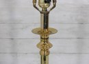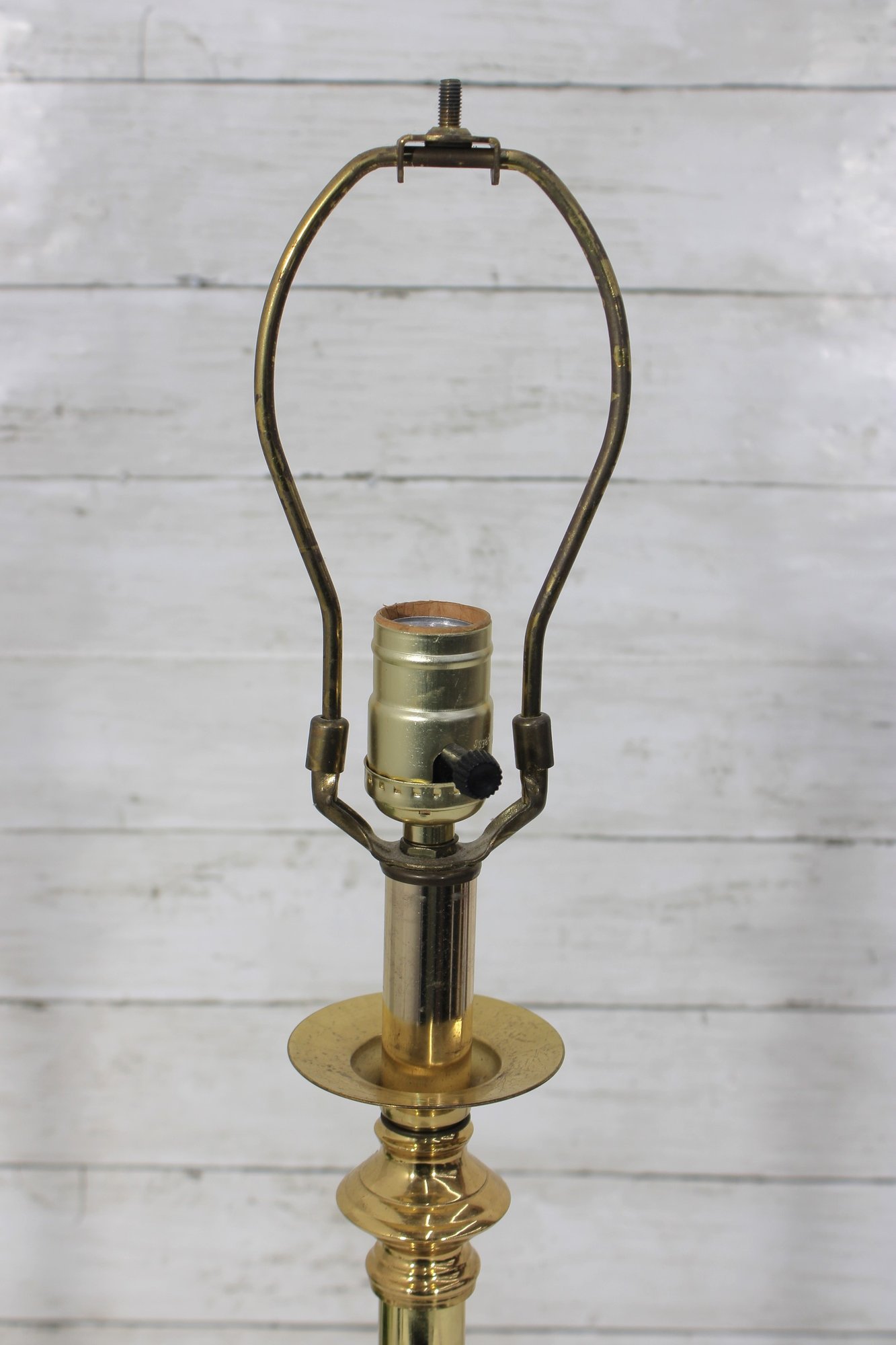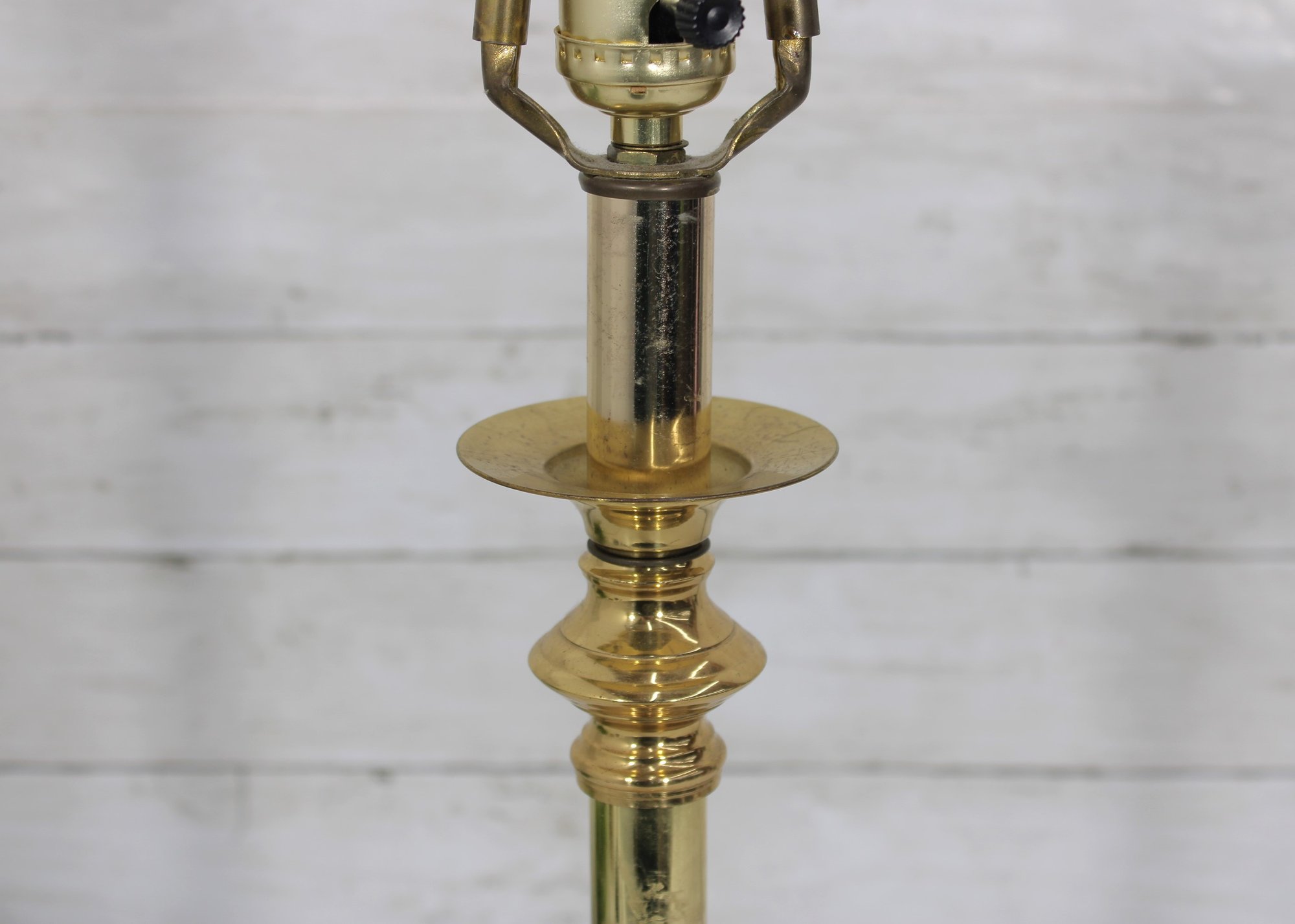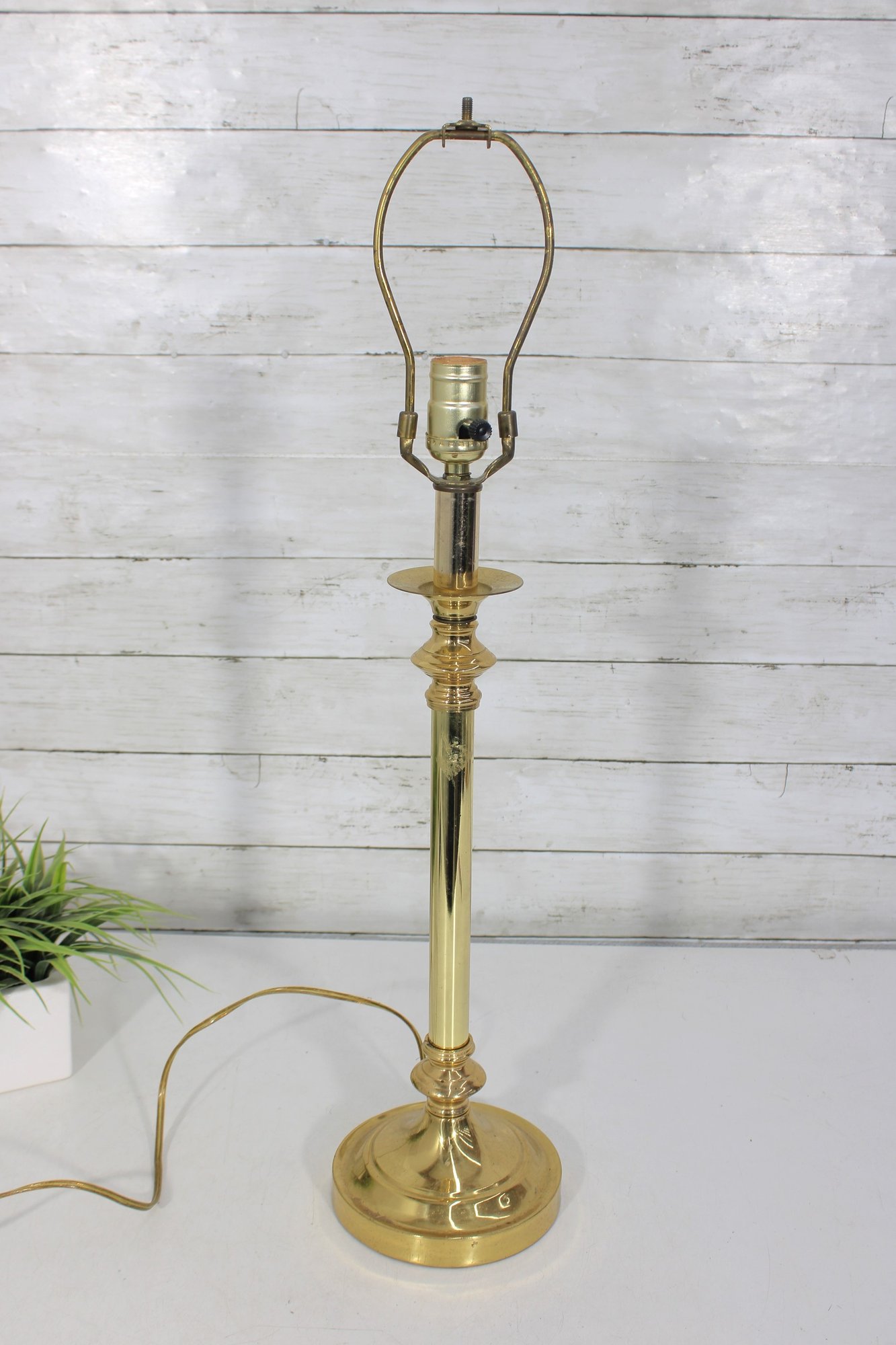 Classic vintage brass-tone table lamp featuring an elegant candlestick-style design with a round weighted base and traditional profile. The timeless look makes this lamp a versatile addition to traditional, vintage, or transitional décor settings.