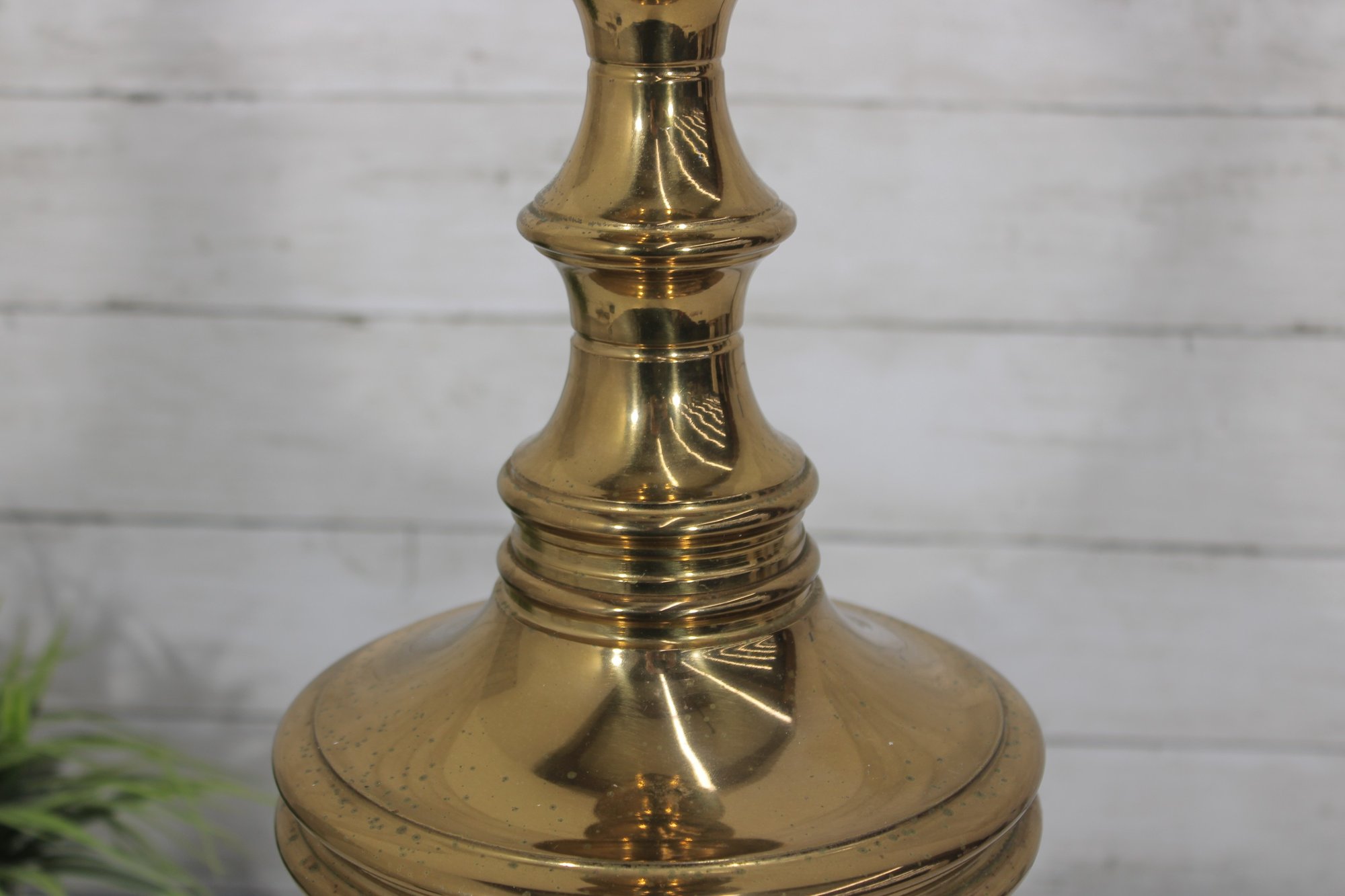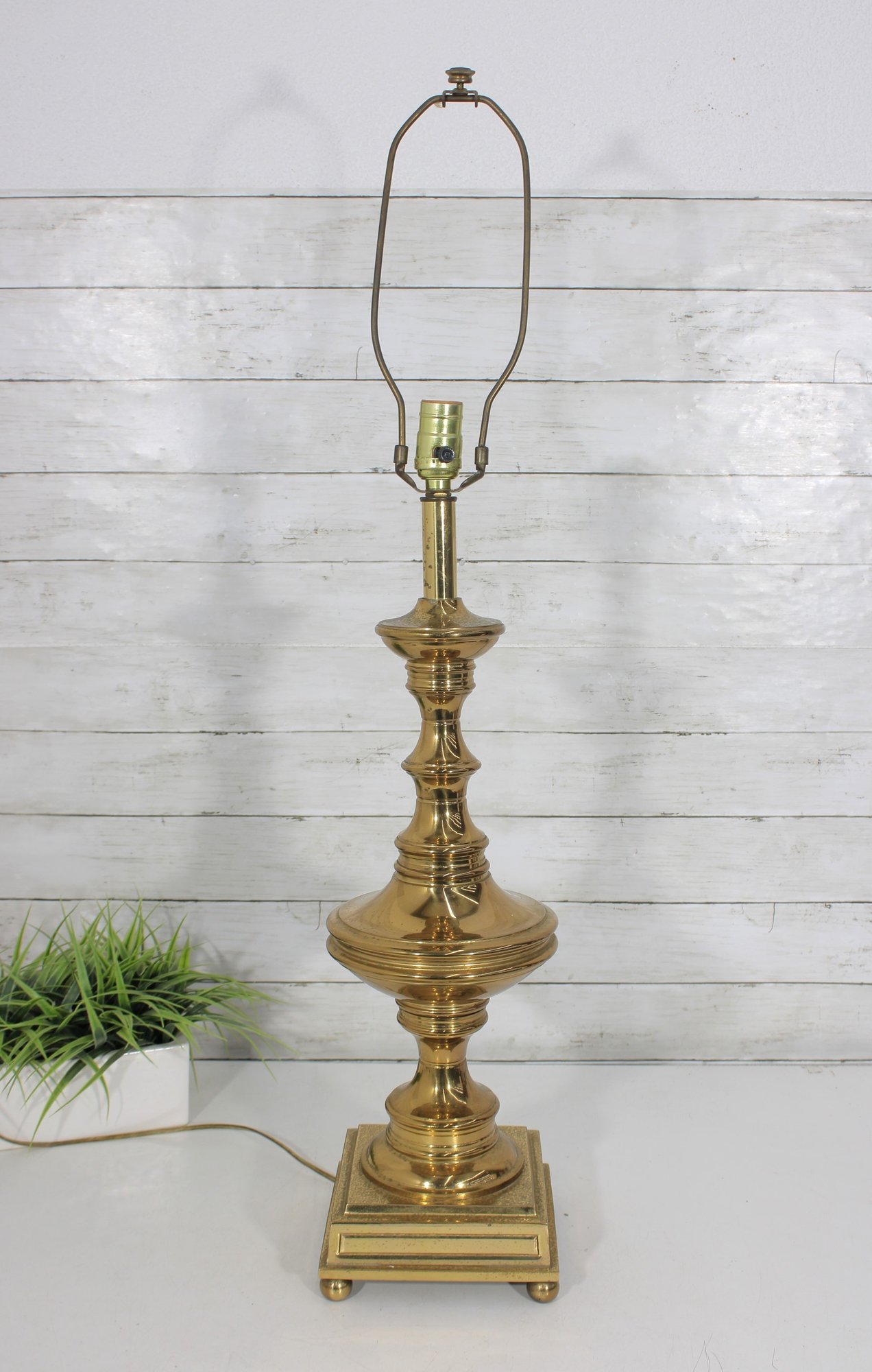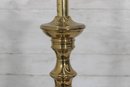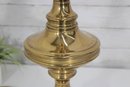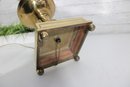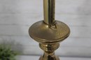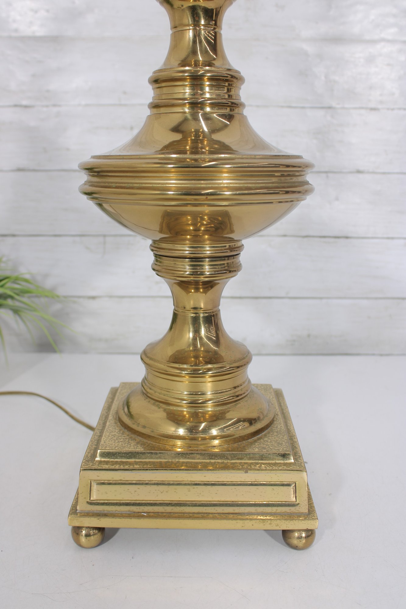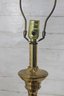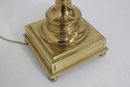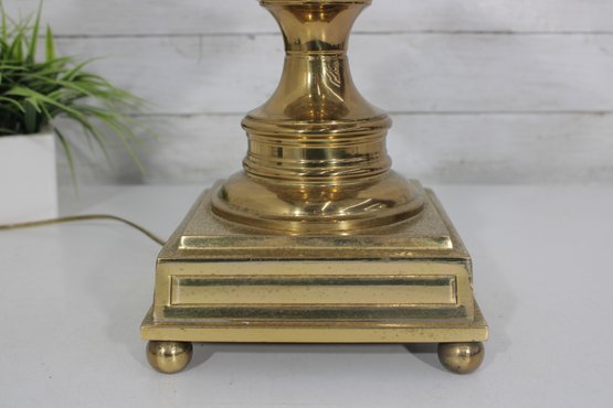 Classic vintage brass-tone table lamp featuring a traditional pedestal column design with a square stepped base and decorative ball feet. The elegant silhouette and polished finish give this lamp a timeless look that pairs beautifully with traditional, vintage, or transitional décor.
