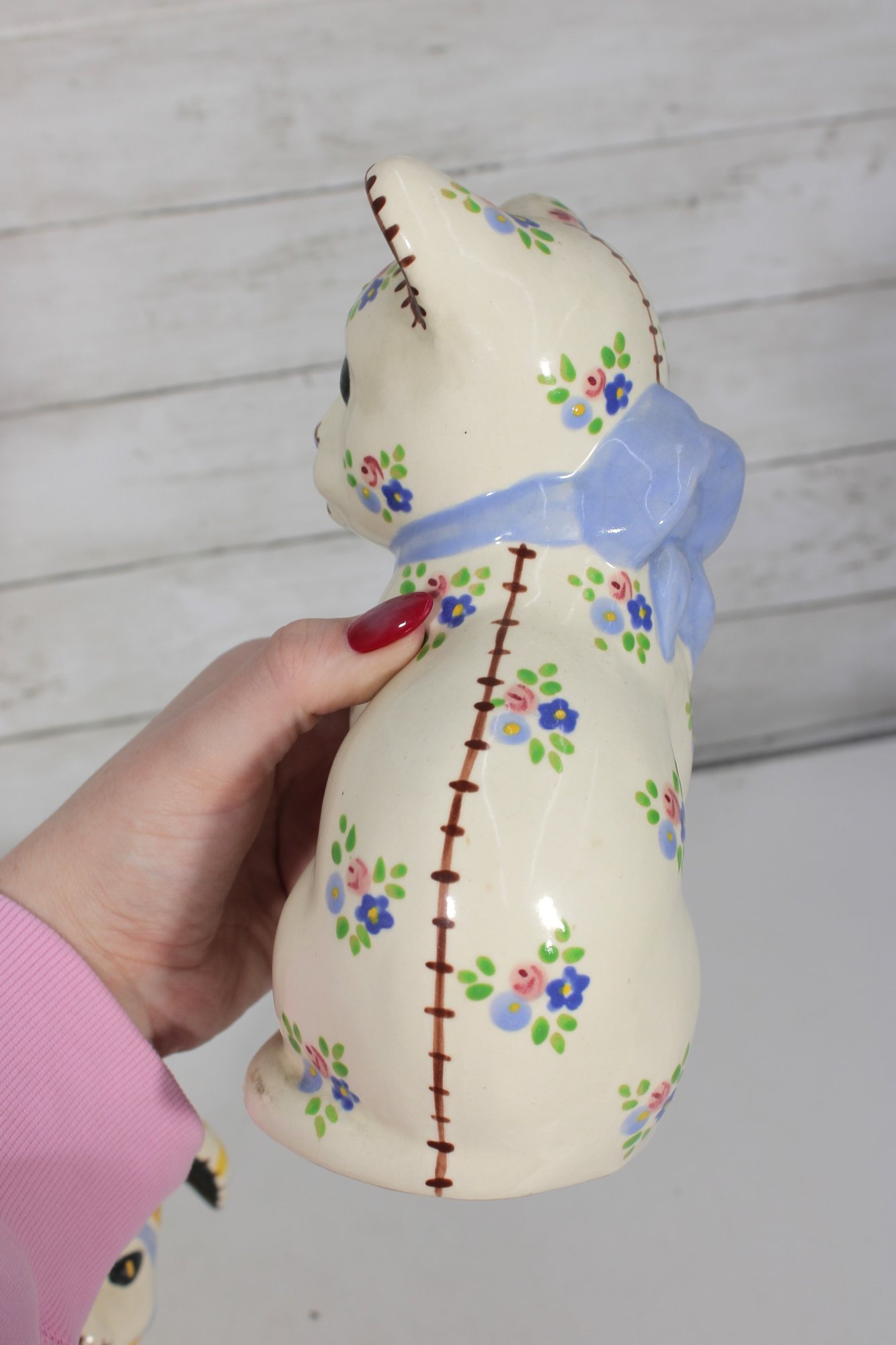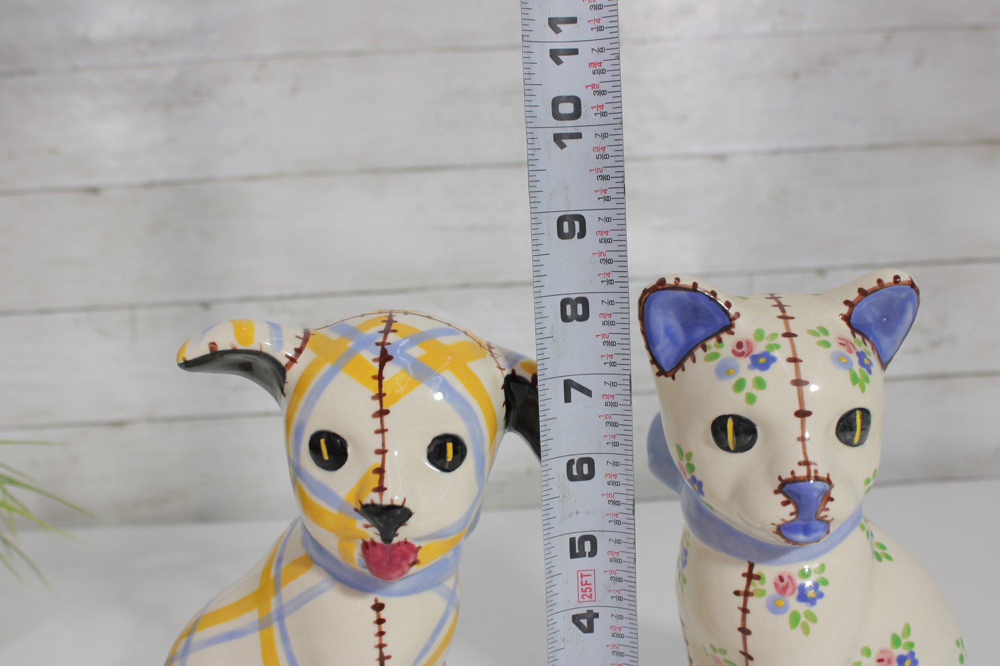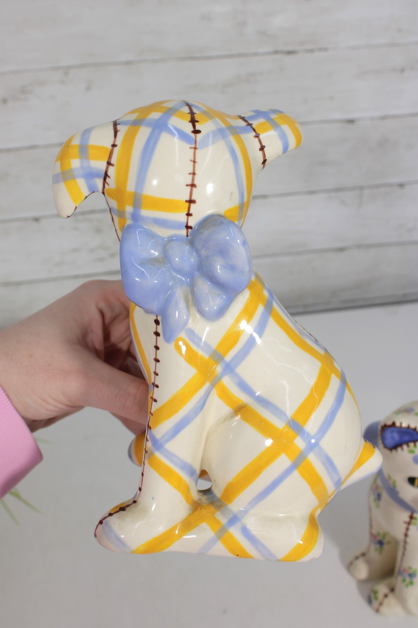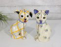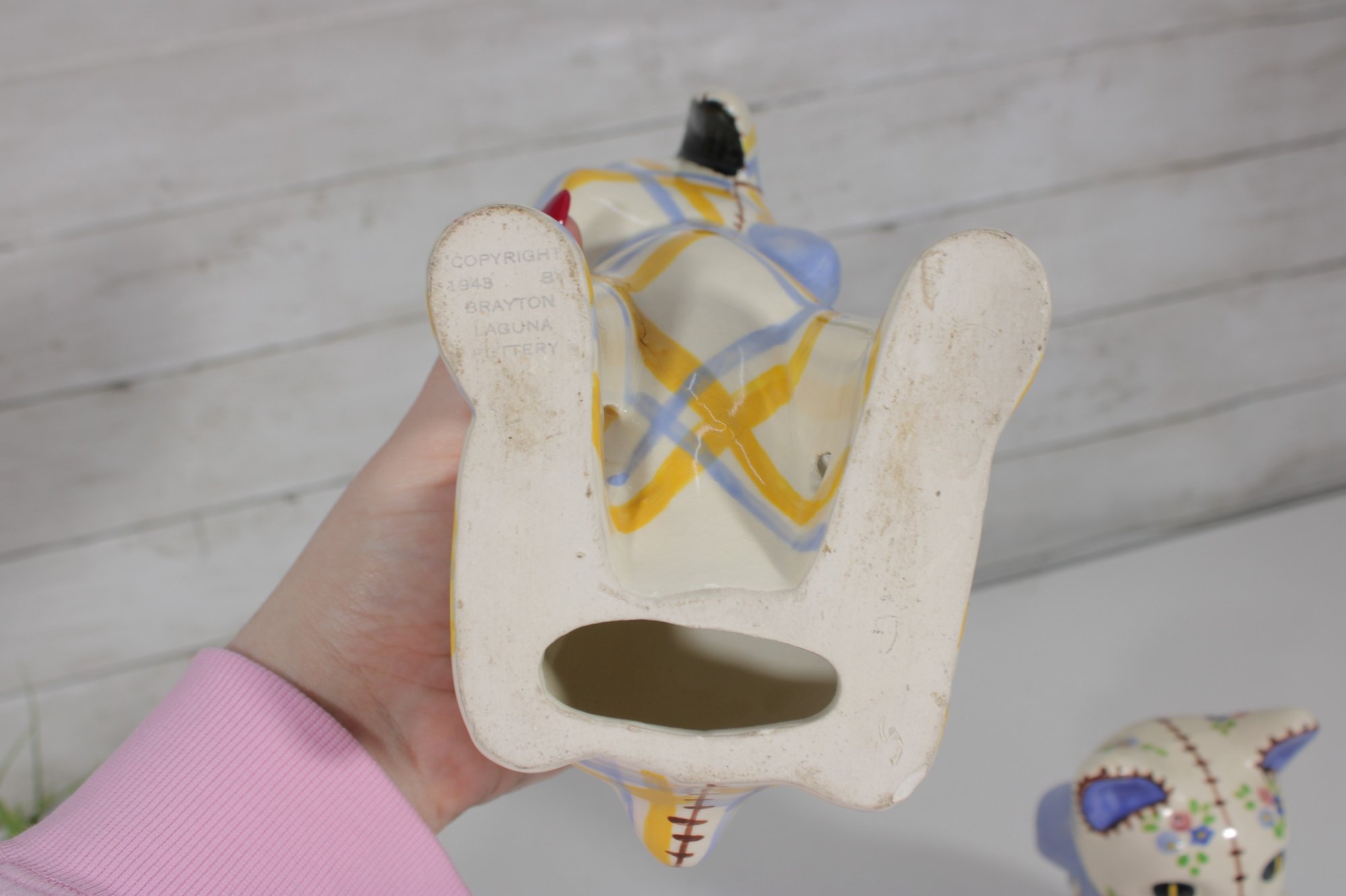 pair of vintage Brayton Laguna Pottery cat figurines, each beautifully hand-painted with charming and unique designs. One cat features a bold yellow plaid pattern, while the other is decorated with delicate floral motifs in soft pastel colors—both showcasing the whimsical artistry Brayton Laguna is known for.