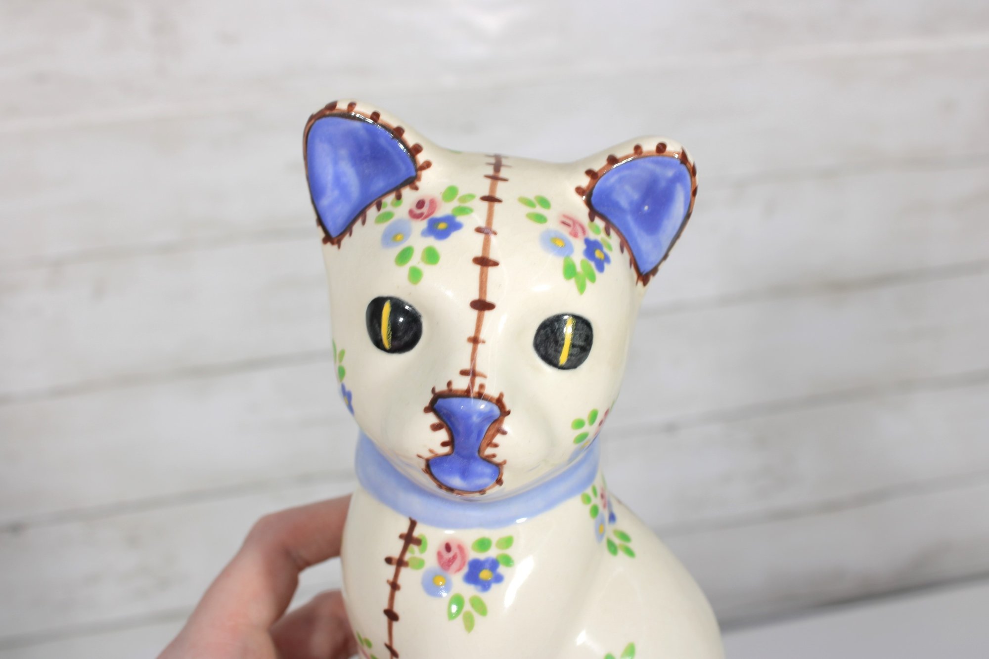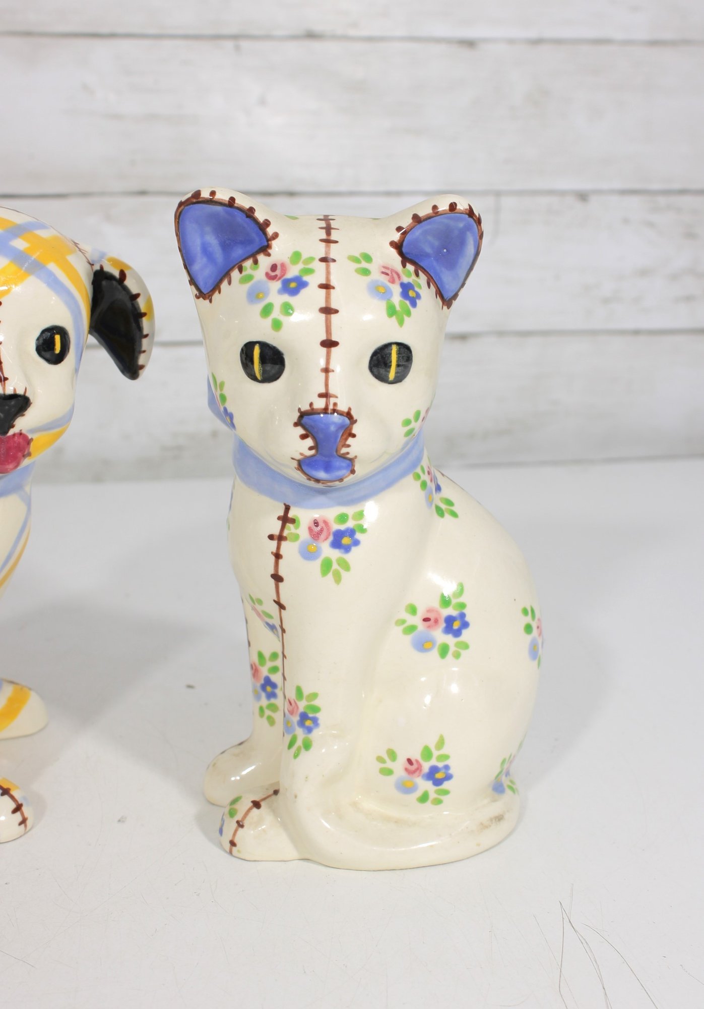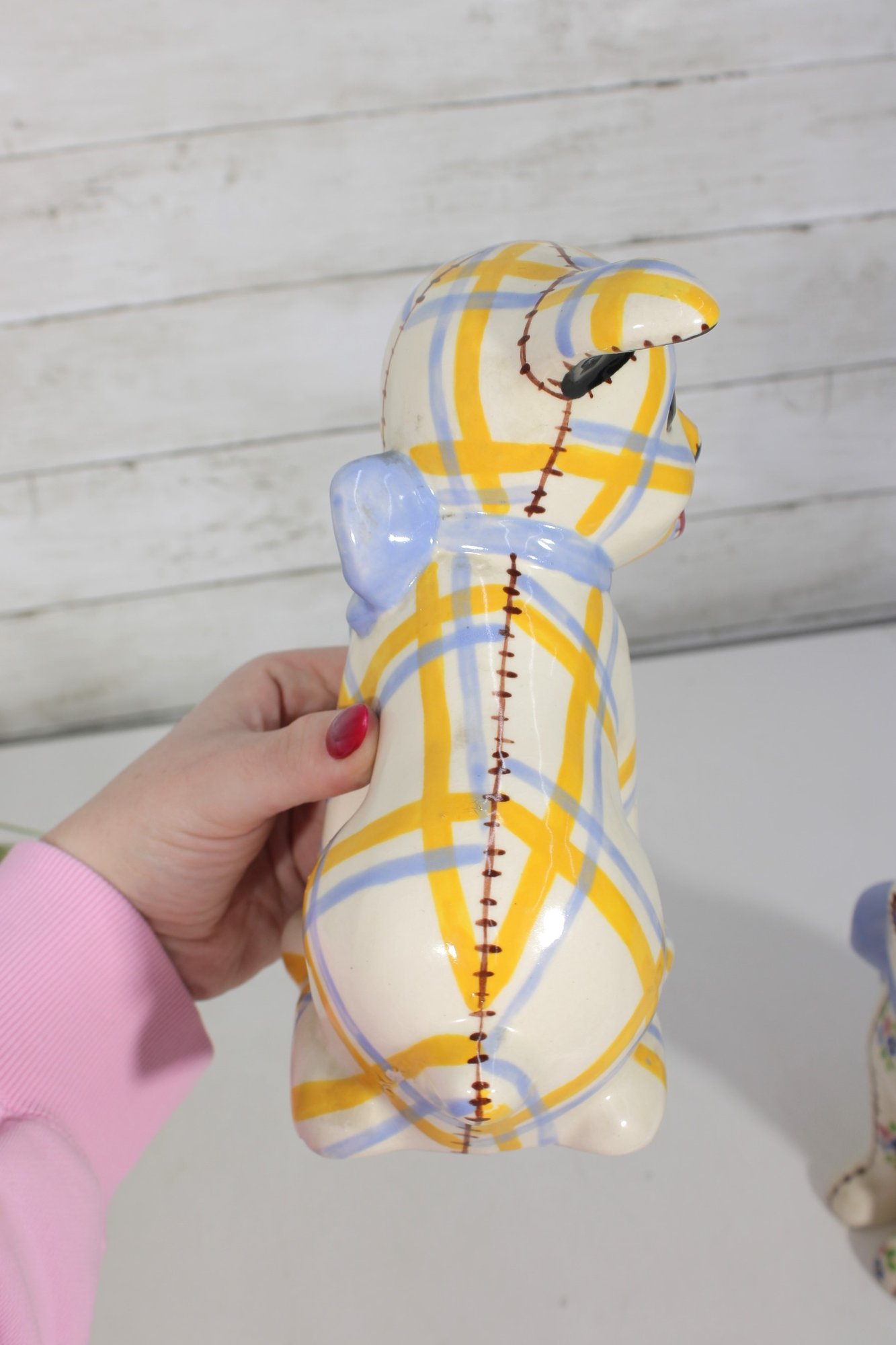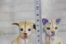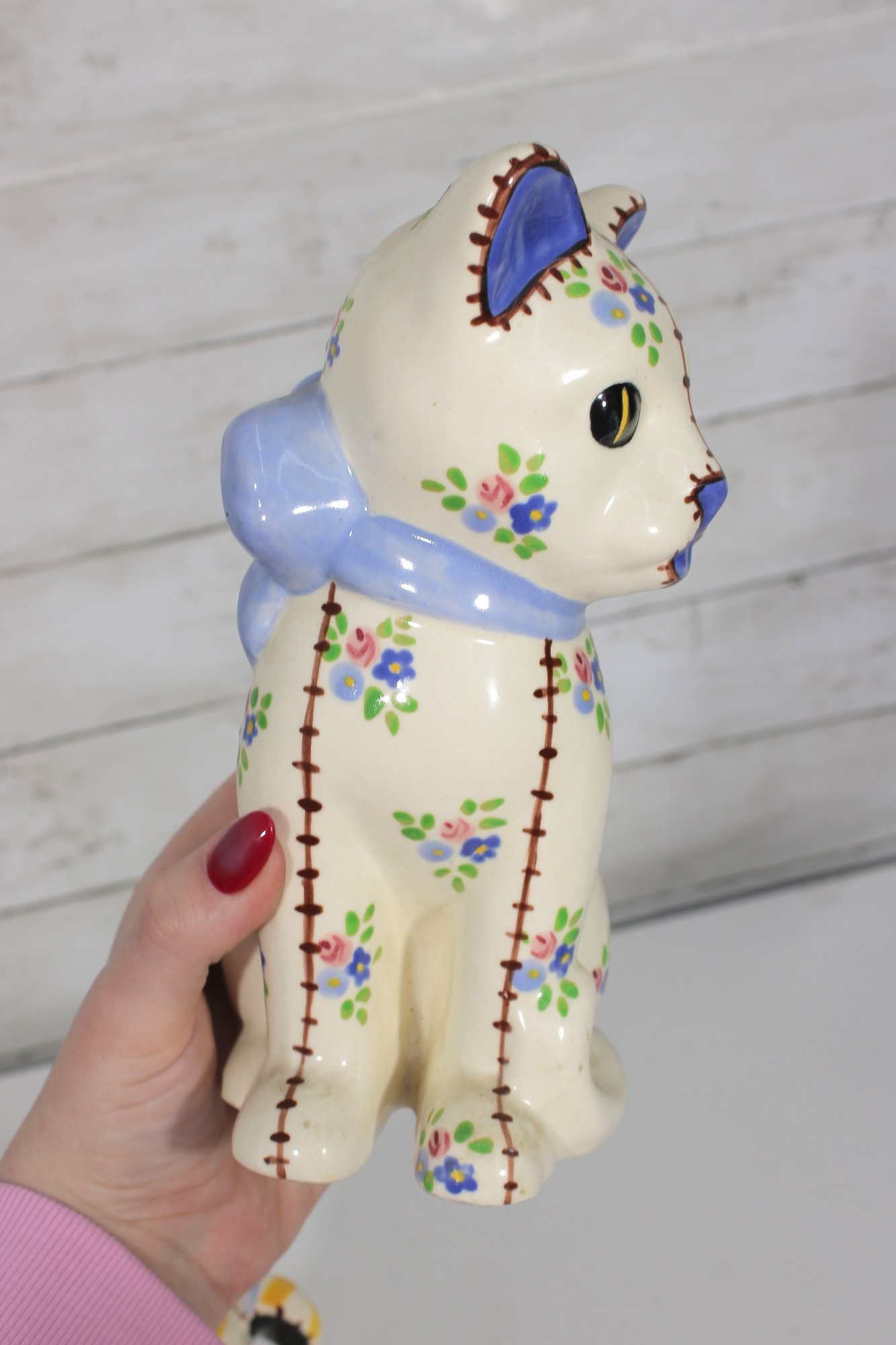 pair of vintage Brayton Laguna Pottery cat figurines, each beautifully hand-painted with charming and unique designs. One cat features a bold yellow plaid pattern, while the other is decorated with delicate floral motifs in soft pastel colors—both showcasing the whimsical artistry Brayton Laguna is known for.