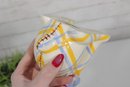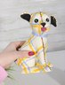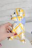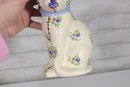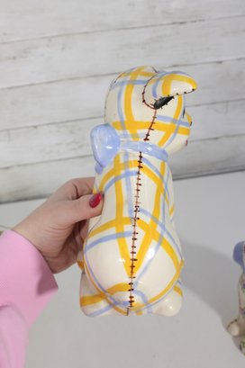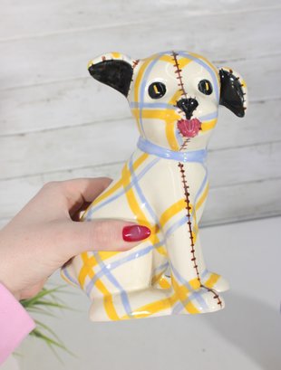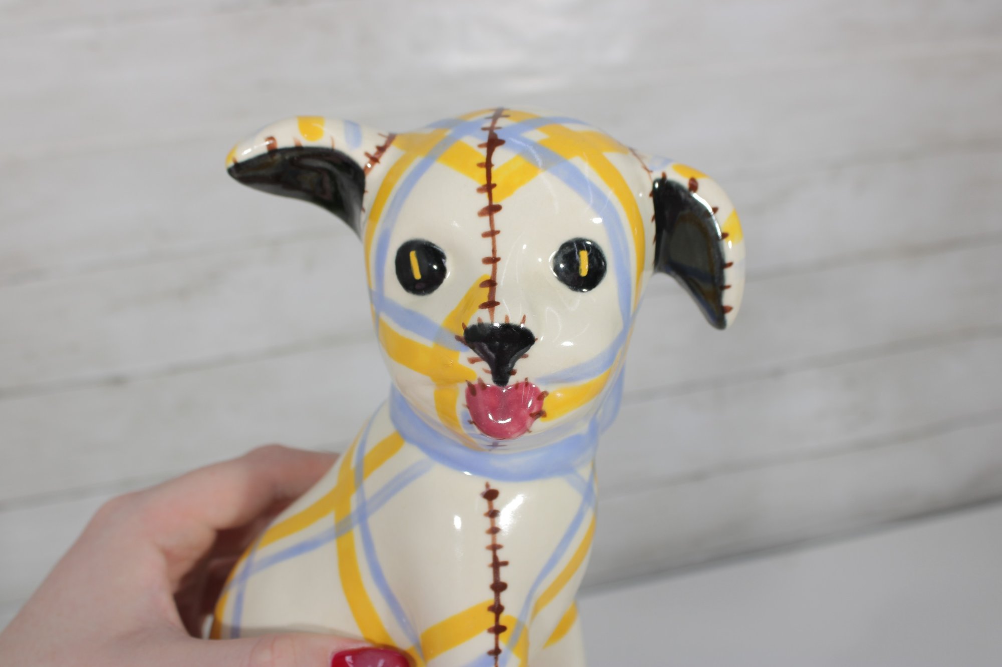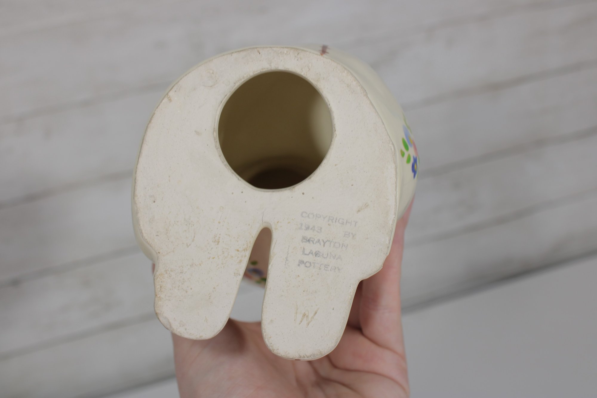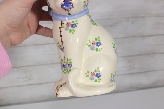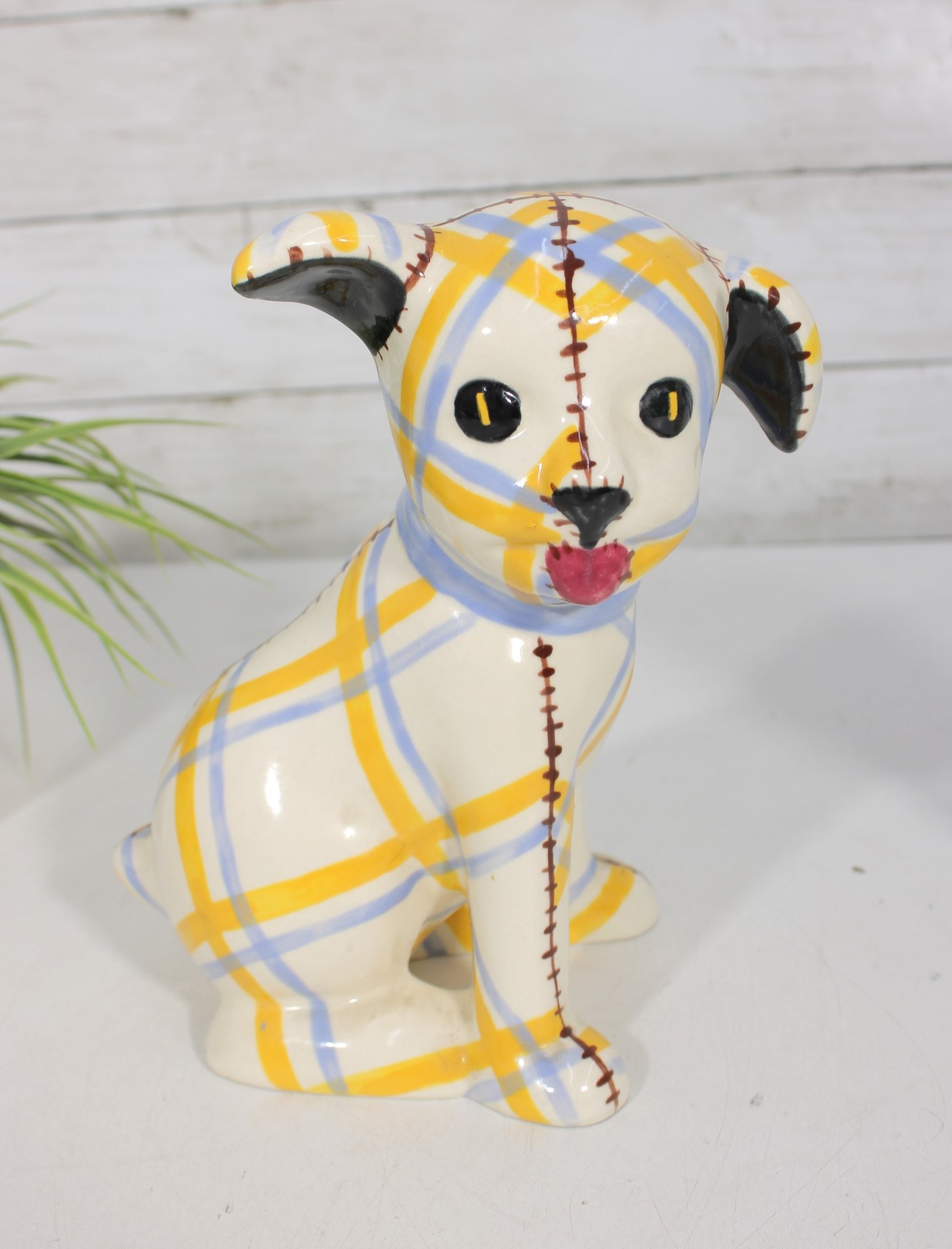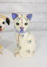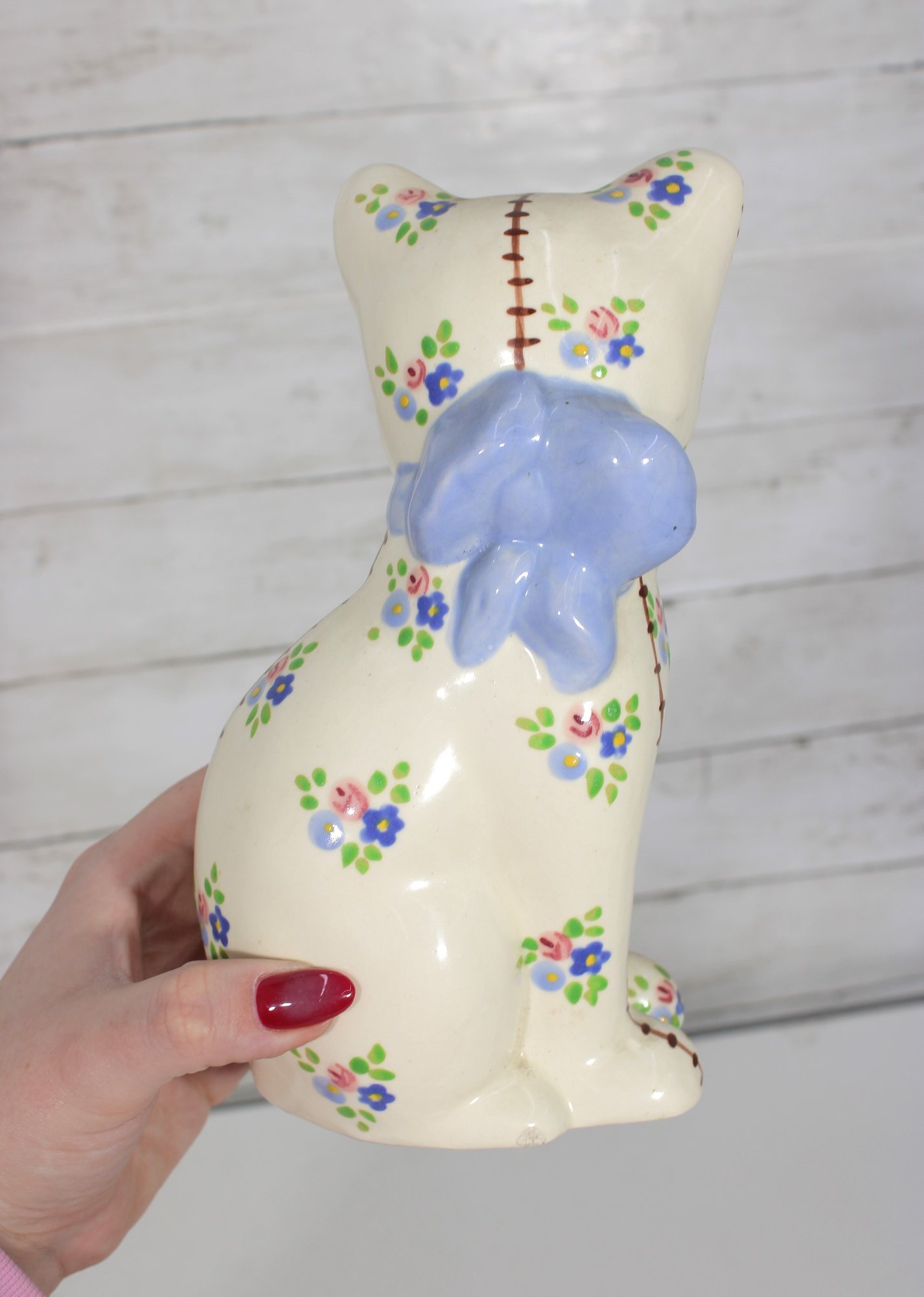 pair of vintage Brayton Laguna Pottery cat figurines, each beautifully hand-painted with charming and unique designs. One cat features a bold yellow plaid pattern, while the other is decorated with delicate floral motifs in soft pastel colors—both showcasing the whimsical artistry Brayton Laguna is known for.