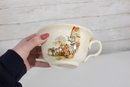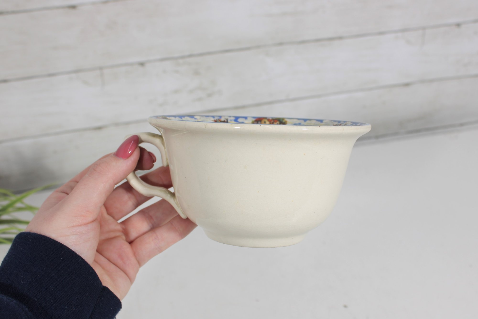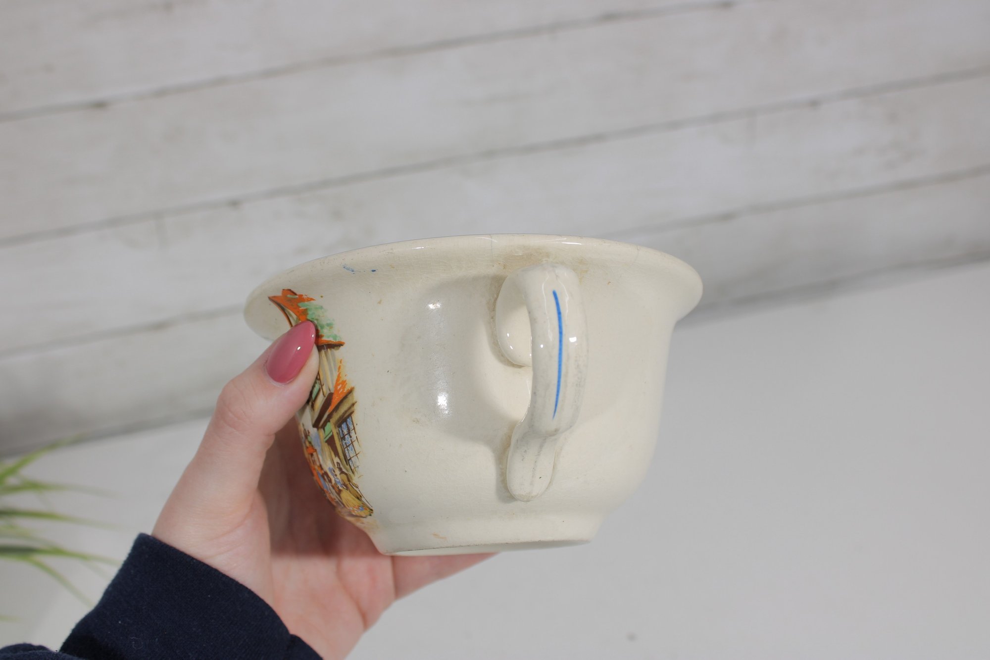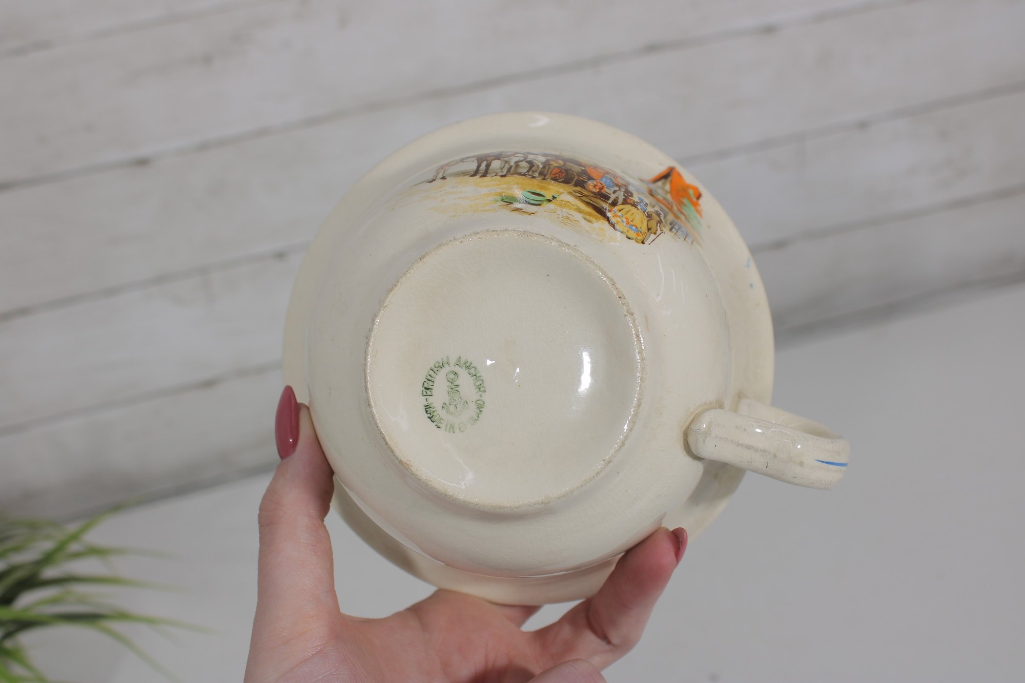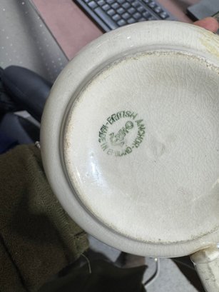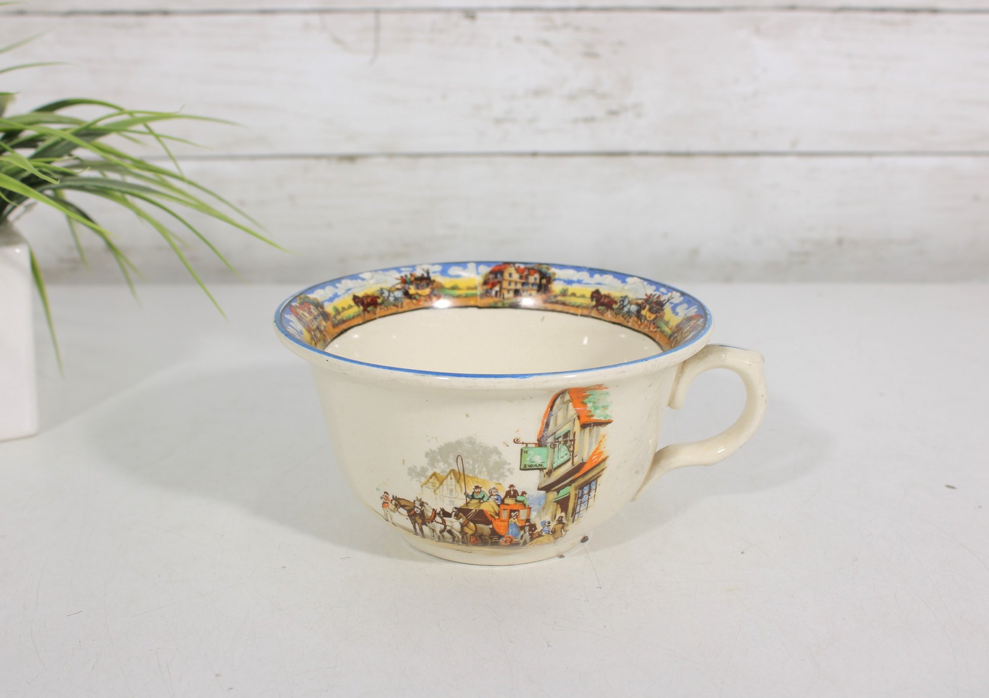 Made in England by British Anchor, this charming collectible features detailed transfer decoration and a traditional chamber pot form with a side handle. Pieces in this pattern are popular with collectors of English transferware, vintage bathroom antiques, and decorative pottery.