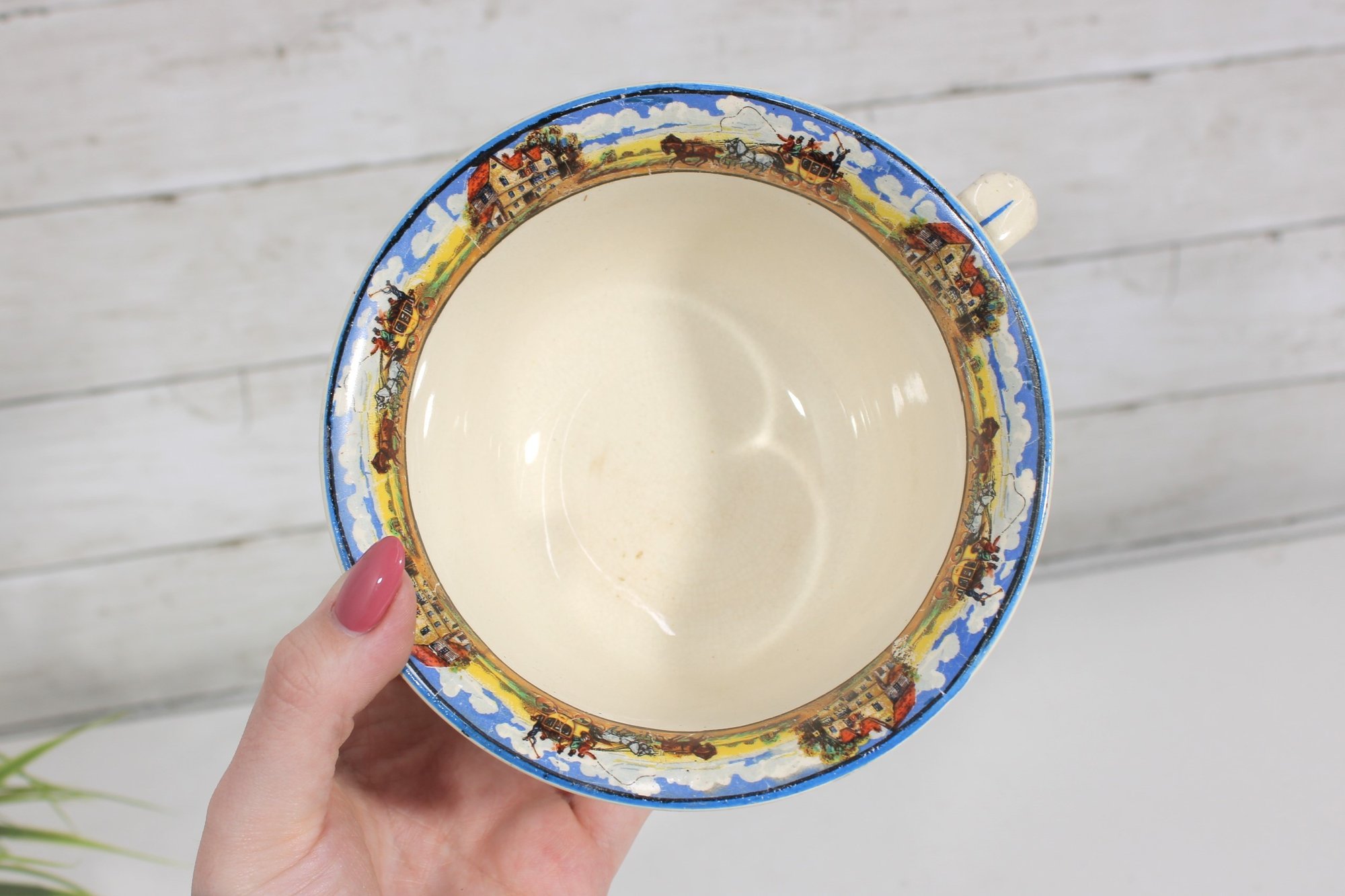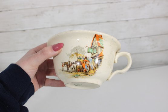 Vintage British Anchor pottery chamber pot featuring the classic Old English Coaching Scenes transferware design. The piece displays colorful scenes of horse-drawn coaches and figures in traditional countryside settings, along with a decorative border around the rim.
