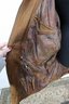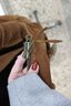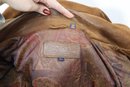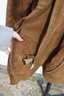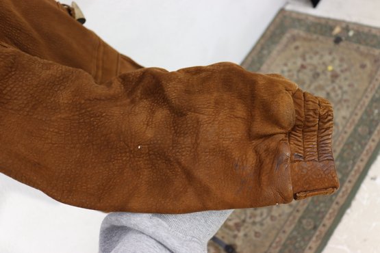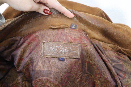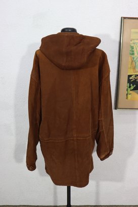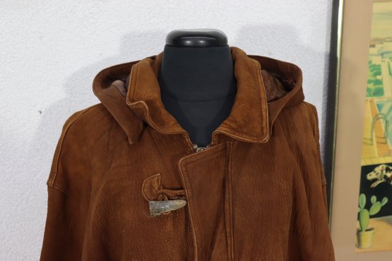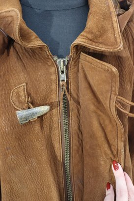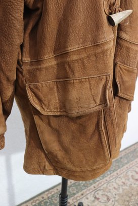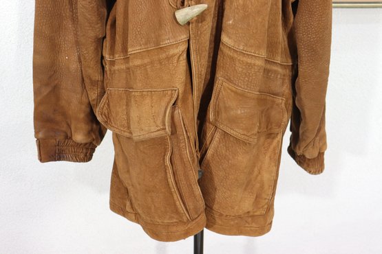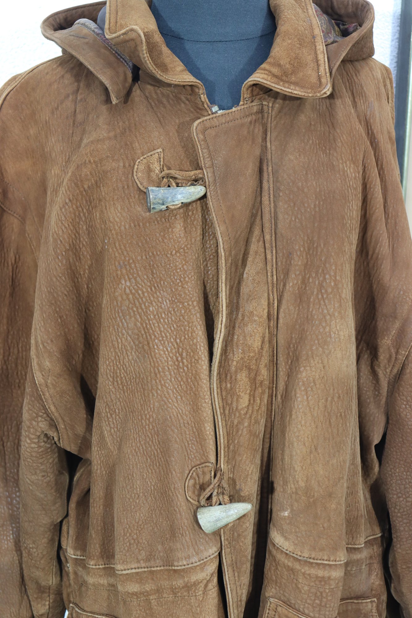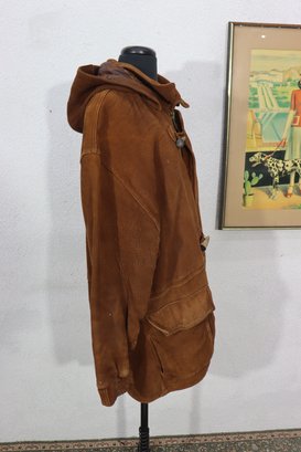 a vintage men’s hooded leather coat in size Large. This is a rugged, heavy suede leather parka style coat featuring classic toggle closures along with a zipper front, large utility style pockets, and a paisley style interior lining. Excellent vintage outdoor heritage Eddie Bauer piece.