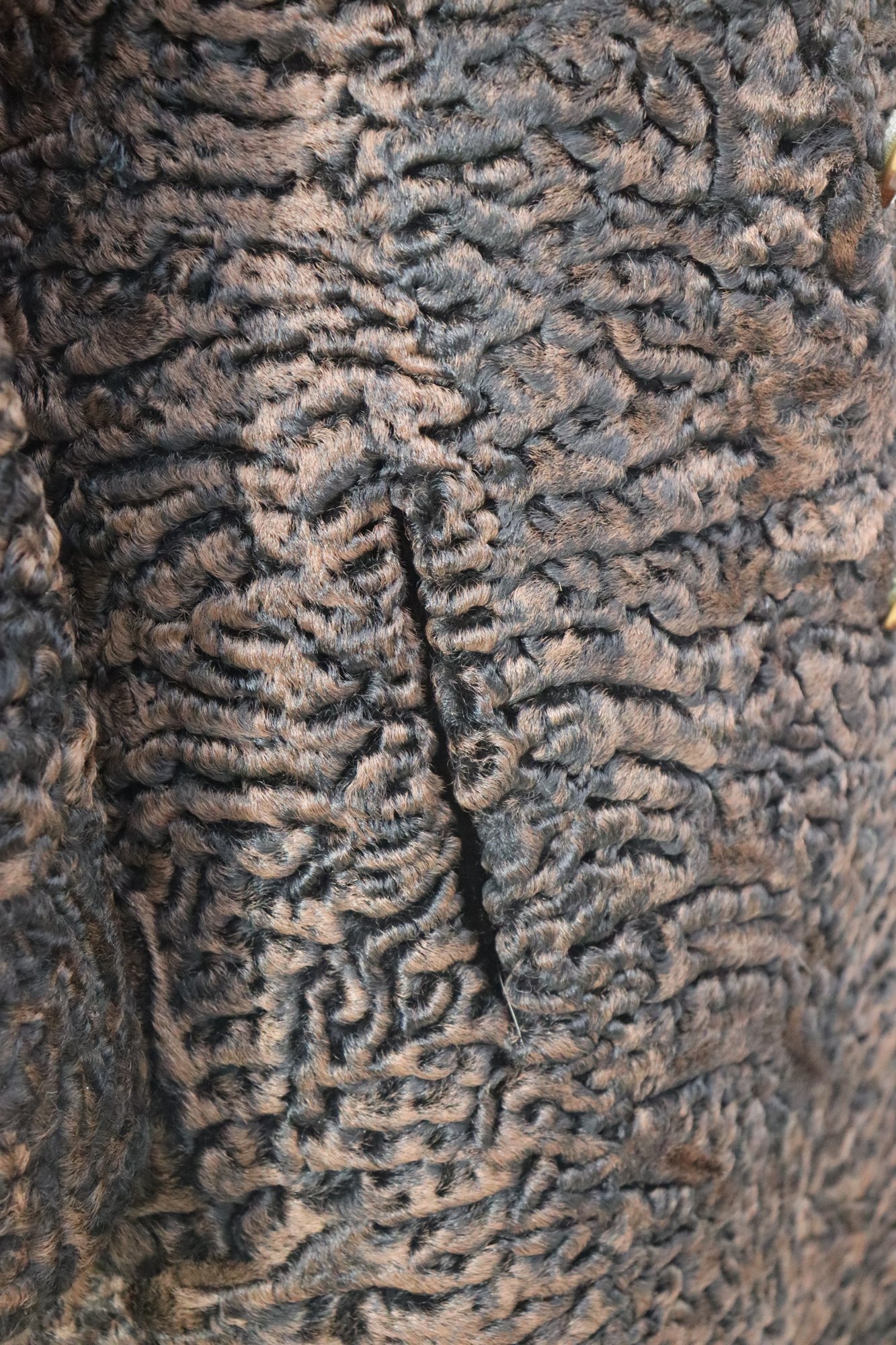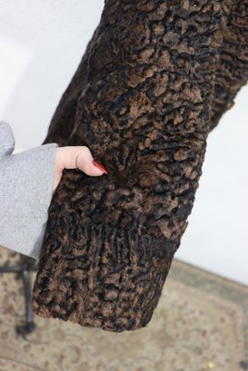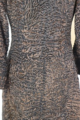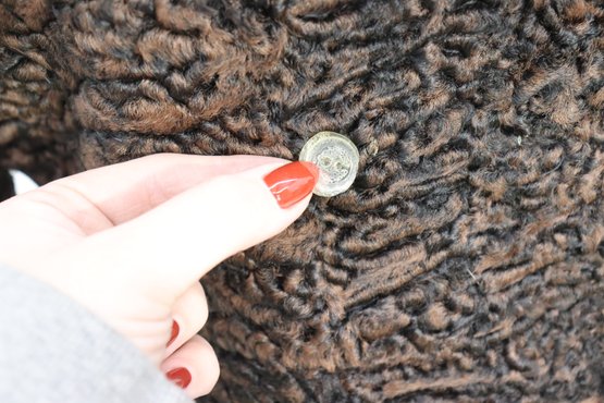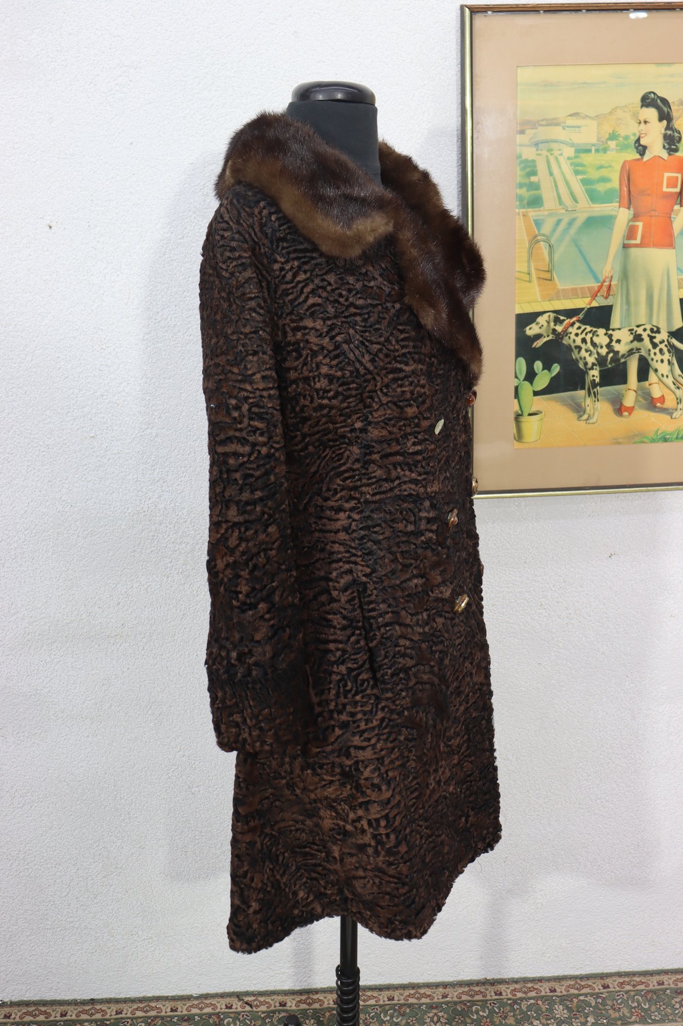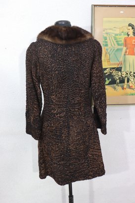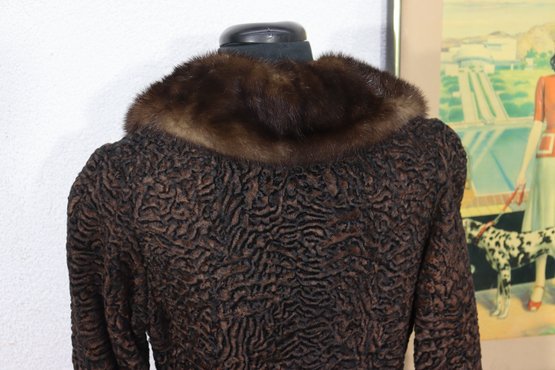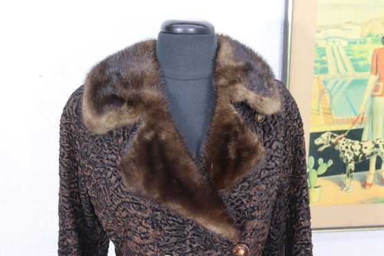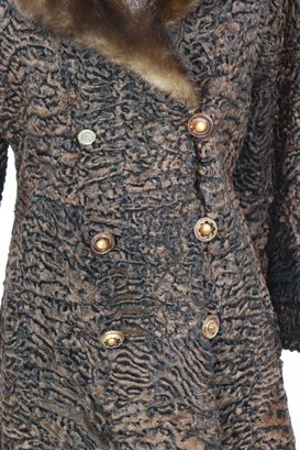 A sophisticated piece of mid-century fashion, this vintage brown Persian lamb fur coat features a luxurious mink collar and timeless double-breasted silhouette. Beautifully crafted, it combines rich texture with refined tailoring, perfect for the collector or vintage fashion lover.