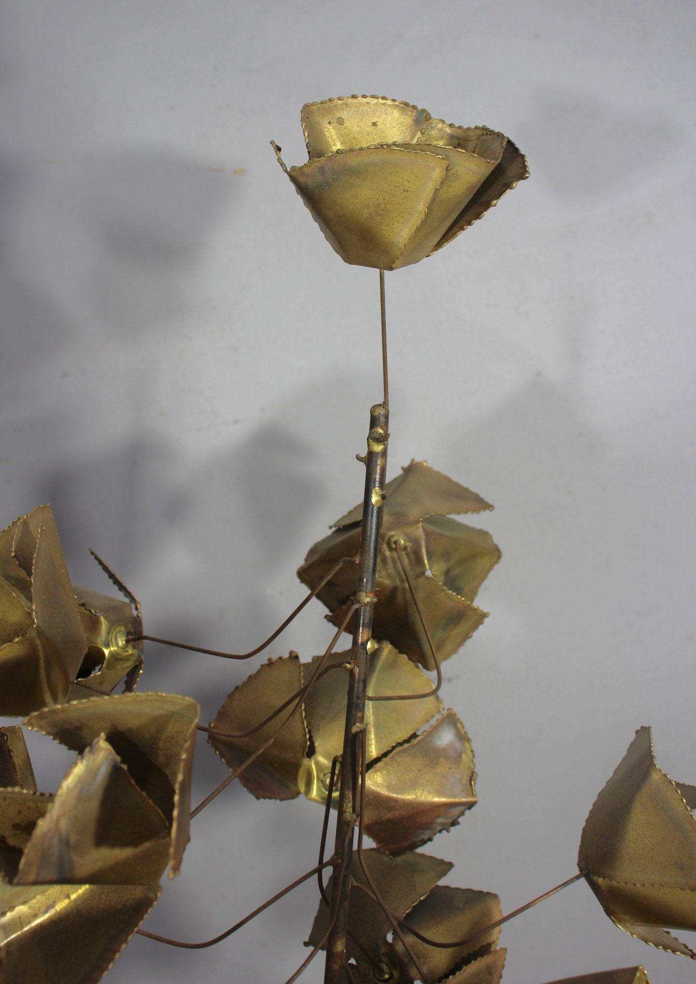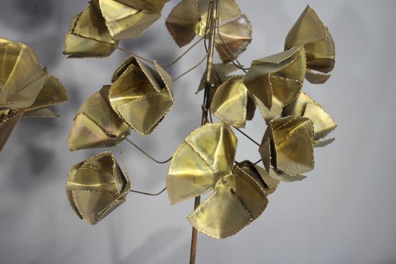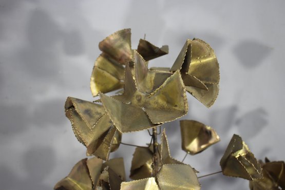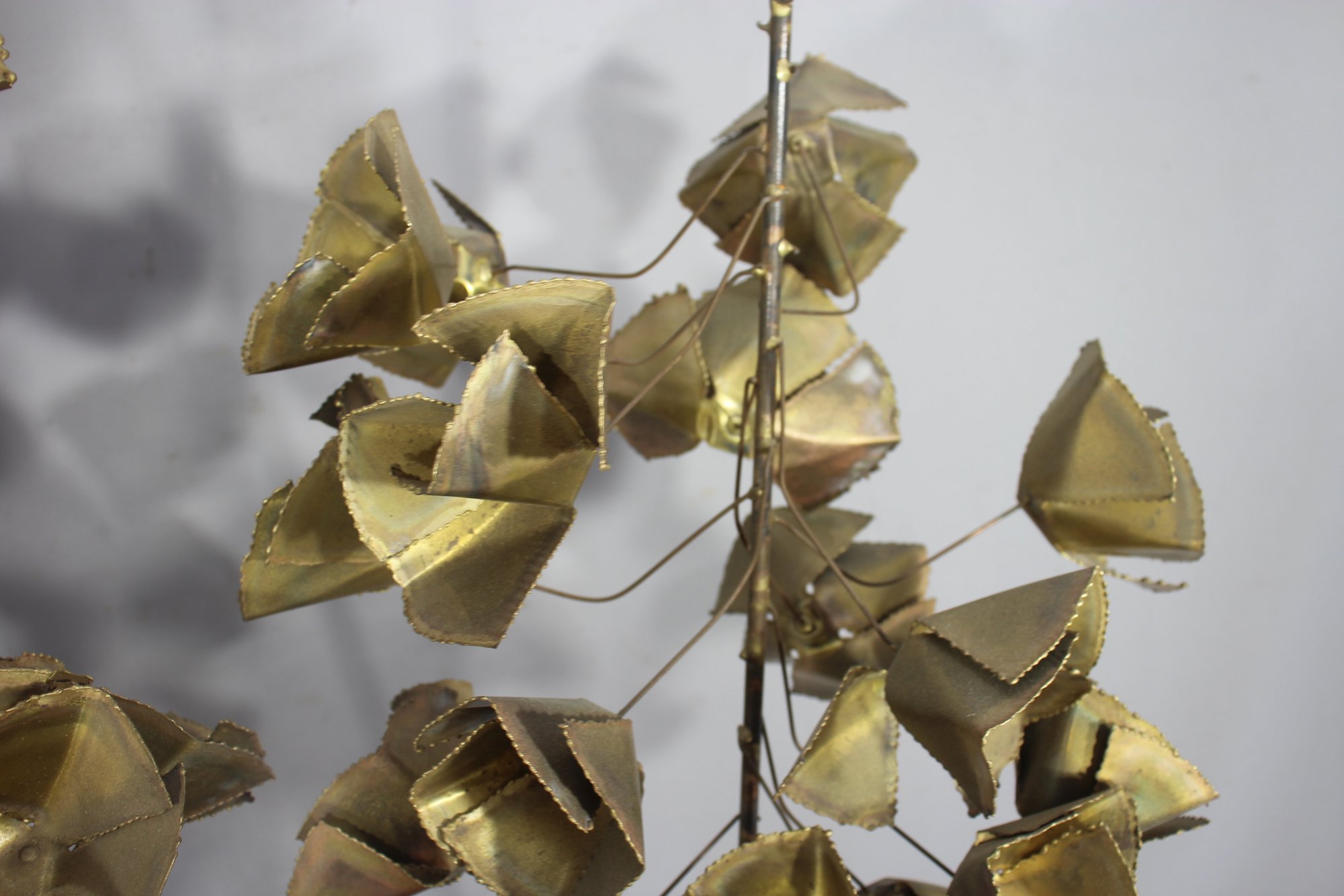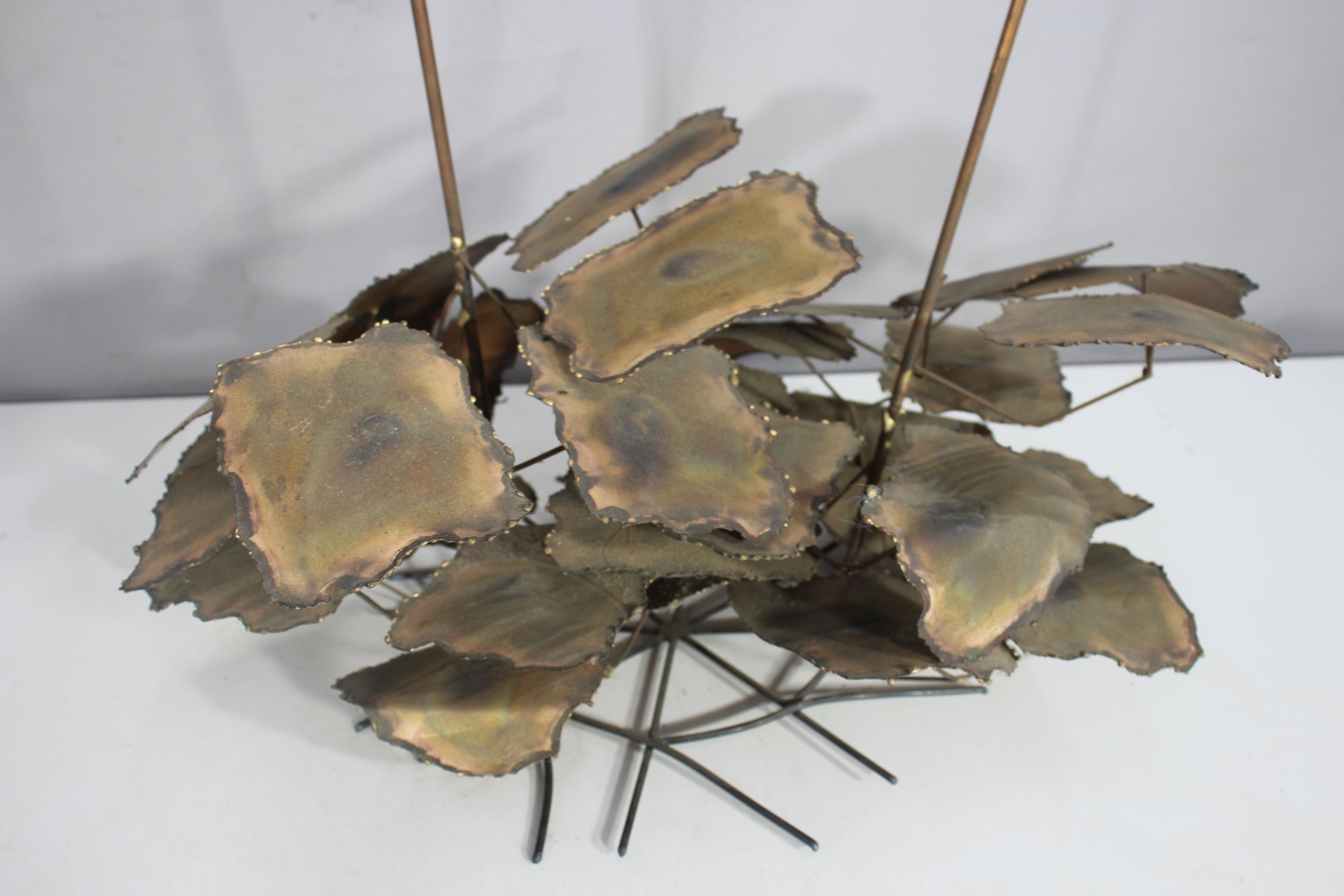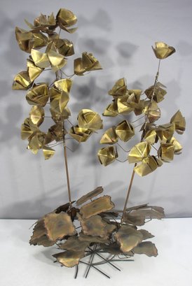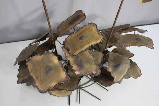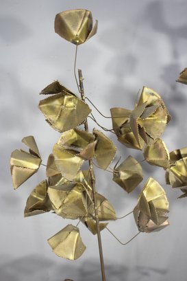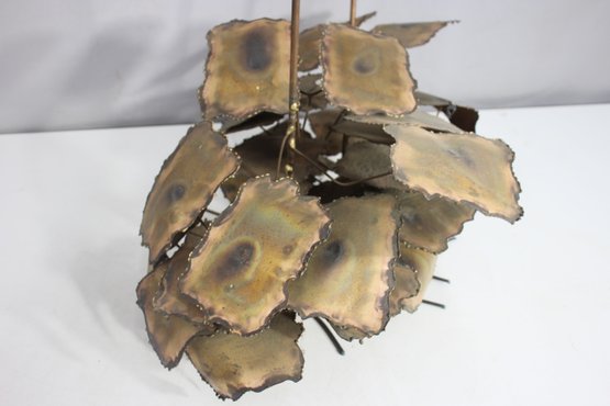This stunning vintage Brutalist metal sculpture features an intricate design resembling ginkgo leaves or abstract floral forms, crafted from hand-cut and welded metal sheets with a raw, organic texture. The gold-toned leaves contrast beautifully with the darker patina of the base, creating depth and visual interest.