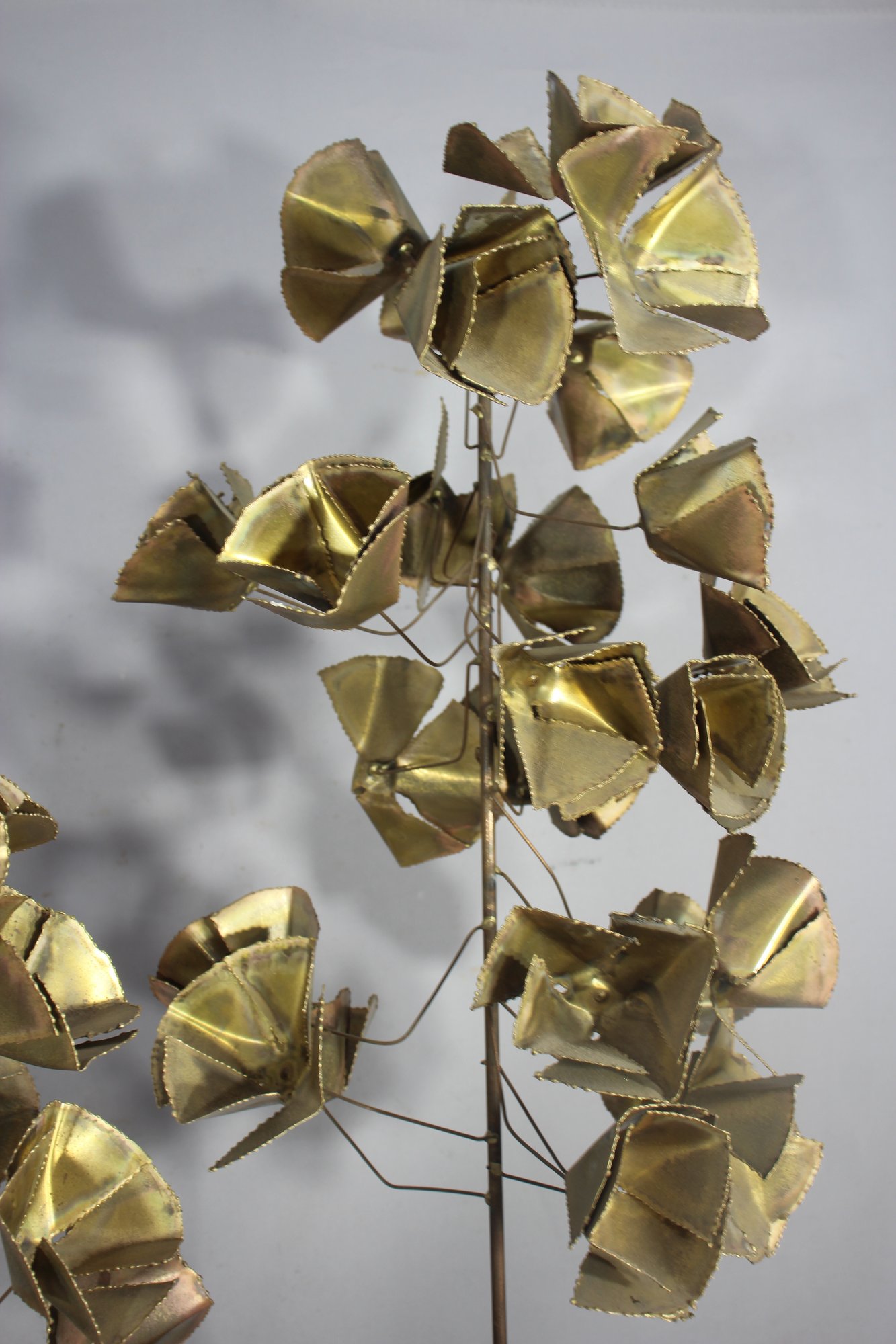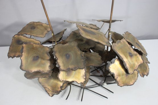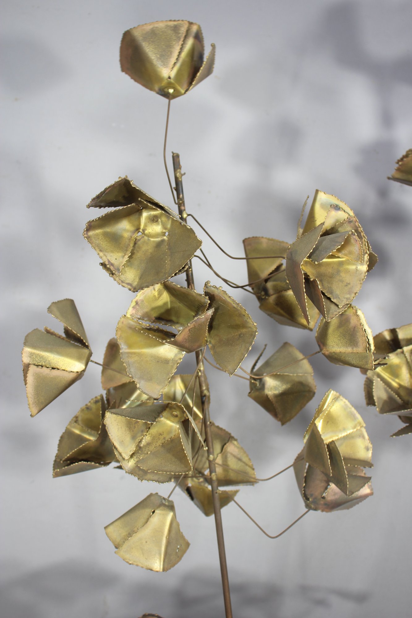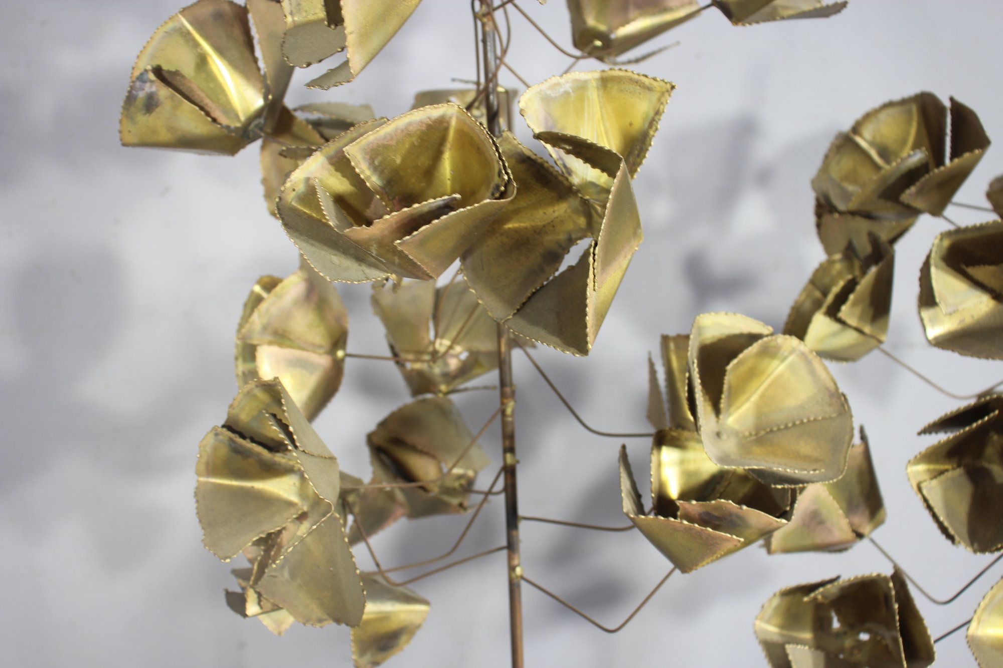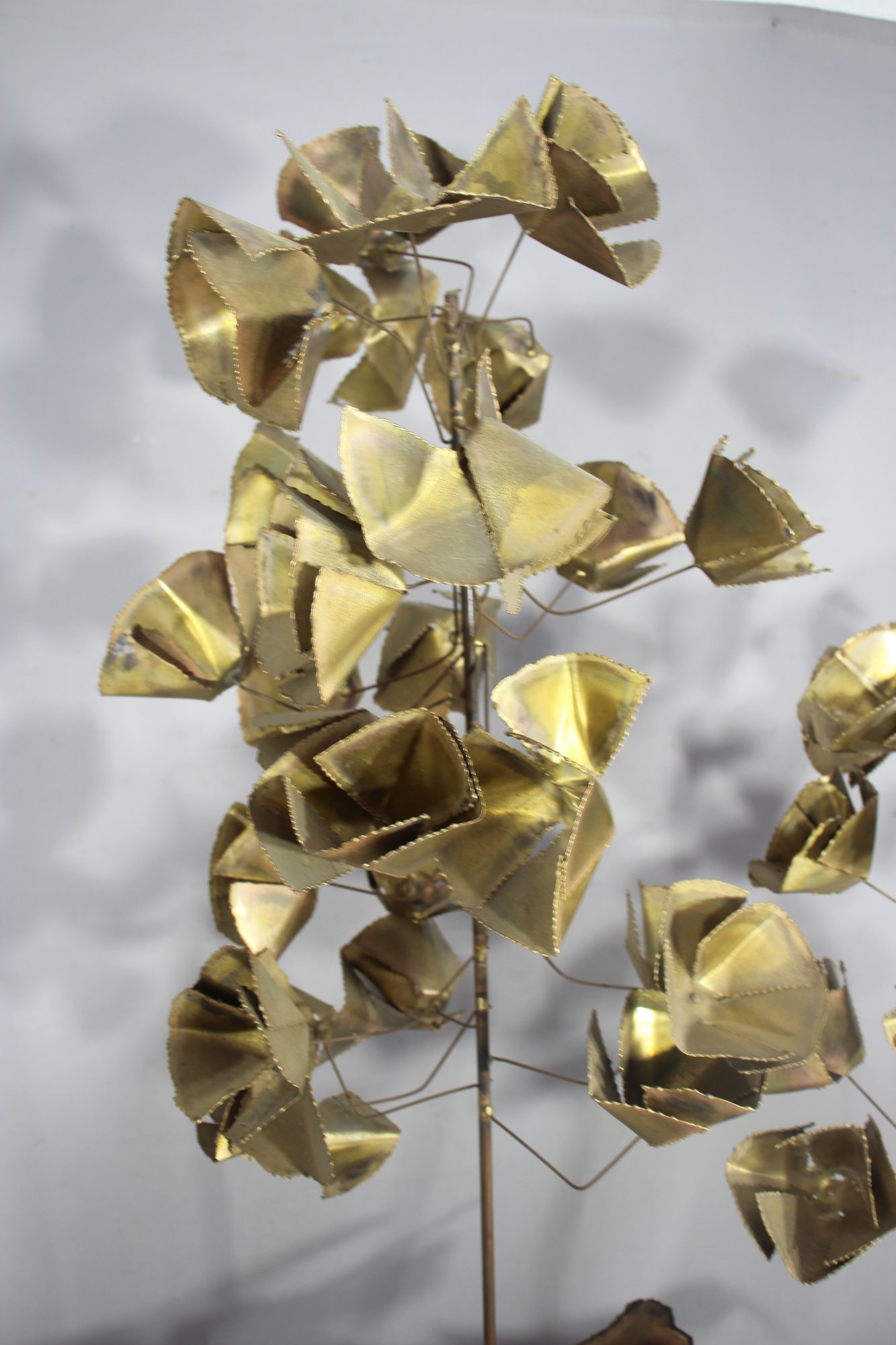This stunning vintage Brutalist metal sculpture features an intricate design resembling ginkgo leaves or abstract floral forms, crafted from hand-cut and welded metal sheets with a raw, organic texture. The gold-toned leaves contrast beautifully with the darker patina of the base, creating depth and visual interest.
