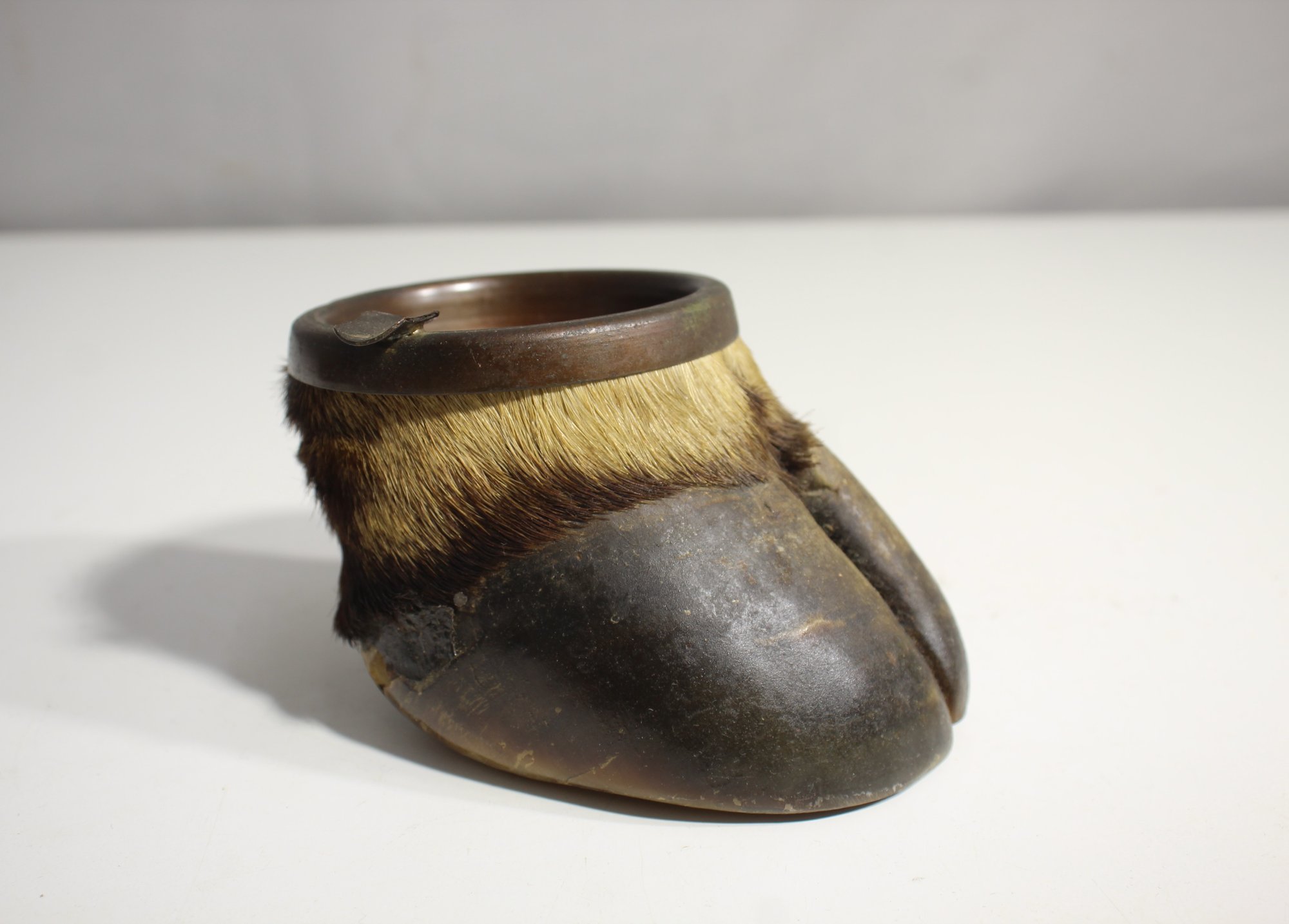 This unique and intriguing vintage snuff mounted as a ashtray complete with natural hair and hoof detailing. The holder is fitted with a small spout on the rim, likely used for dispensing or holding small items. The unusual and rustic design gives it a one-of-a-kind appeal,