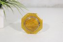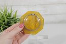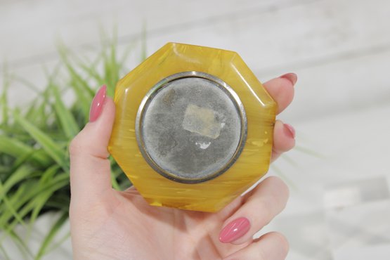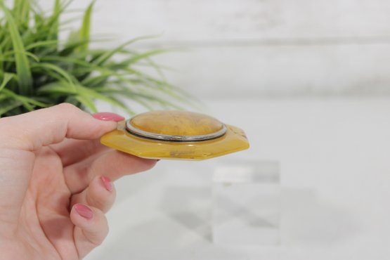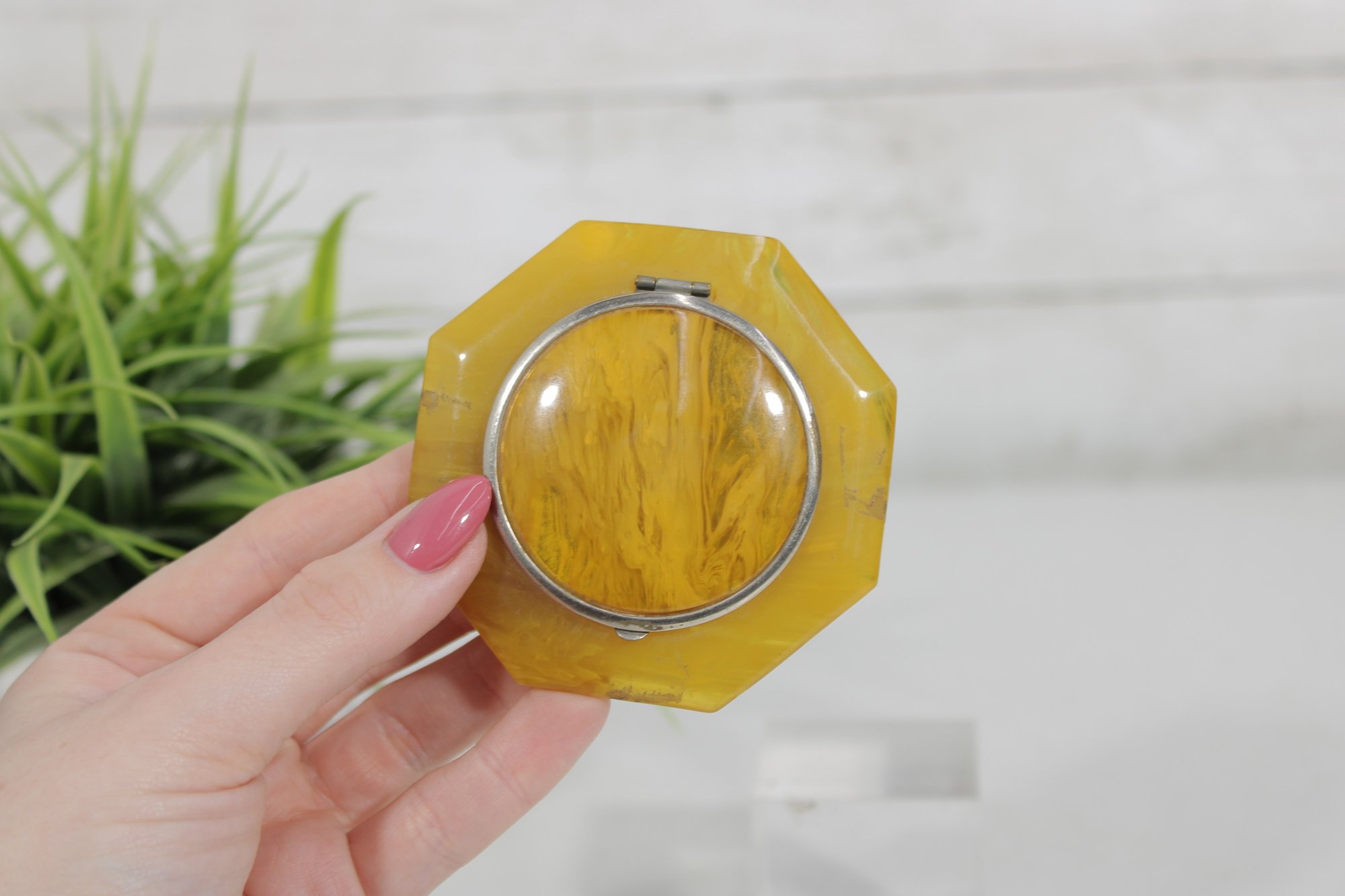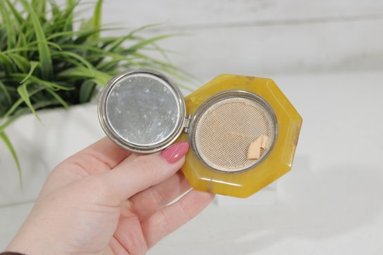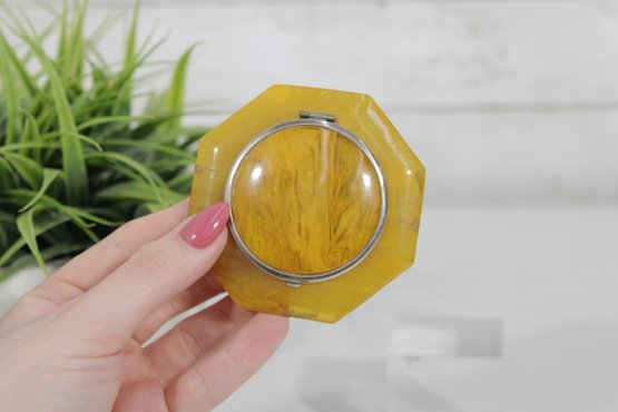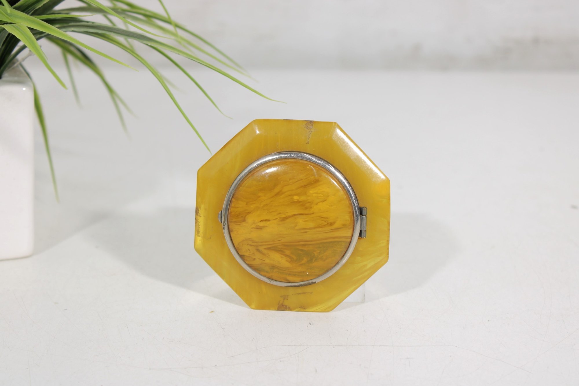 a beautiful vintage butterscotch Bakelite powder compact featuring a distinctive octagonal shape and warm marbled Bakelite coloring. The compact has a classic mid-century vanity design with a silver-tone hinged lid and interior mirror.