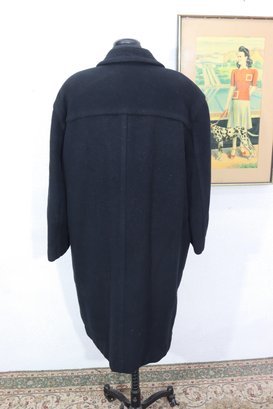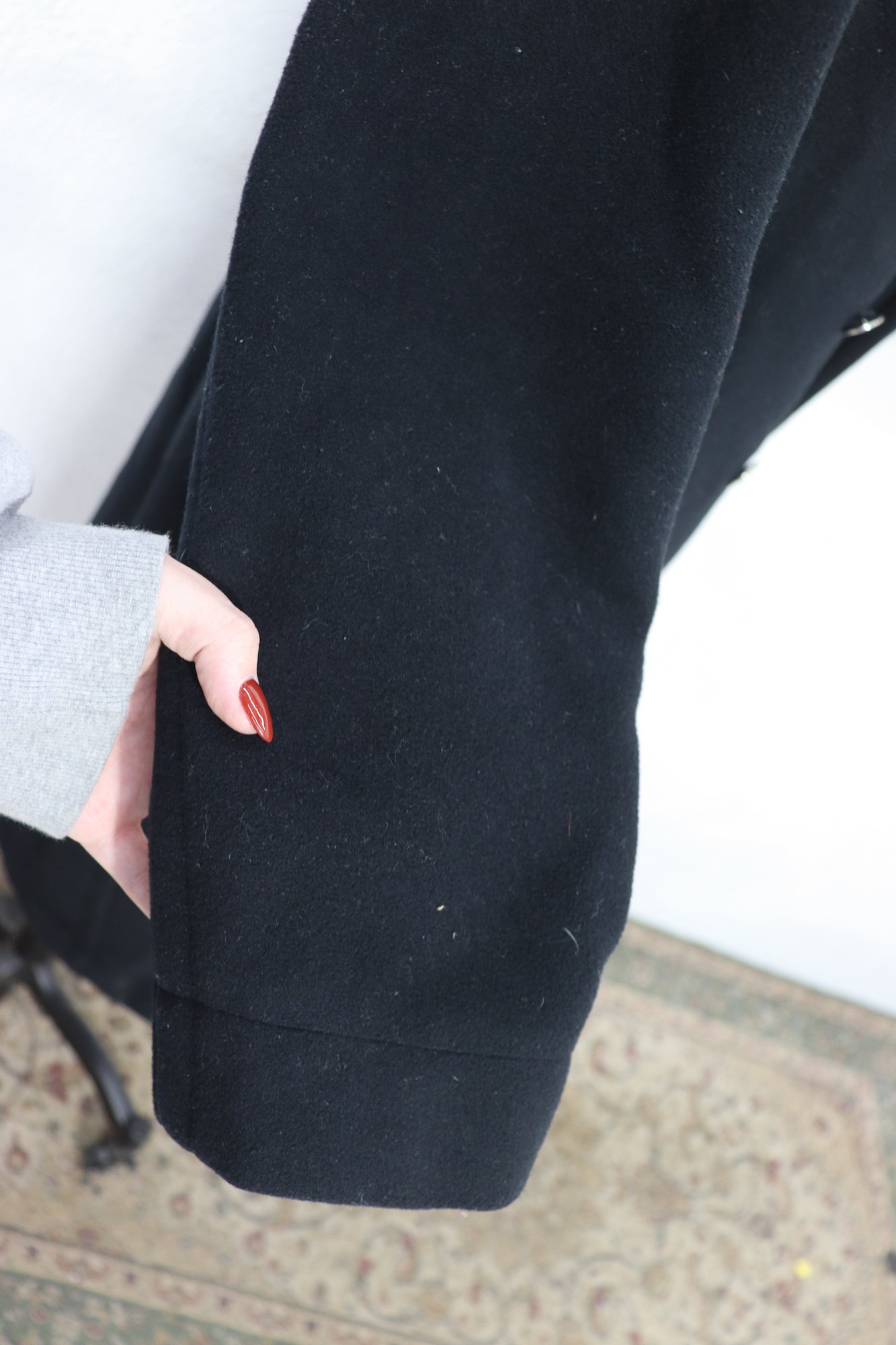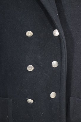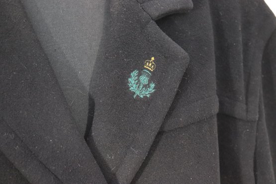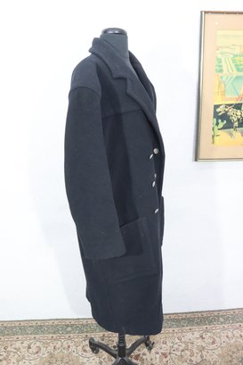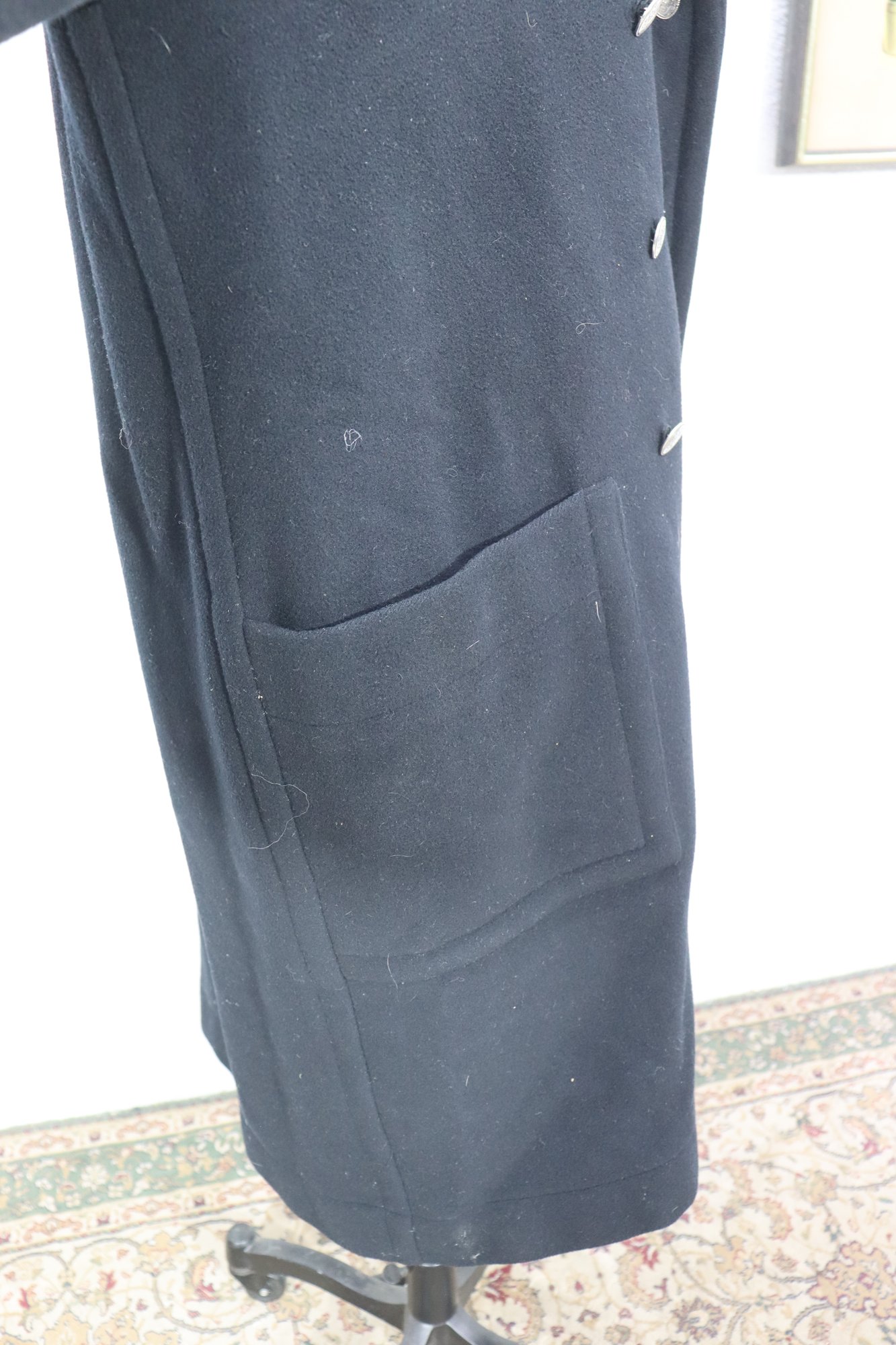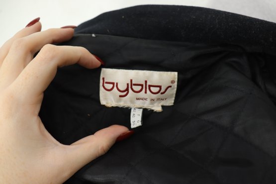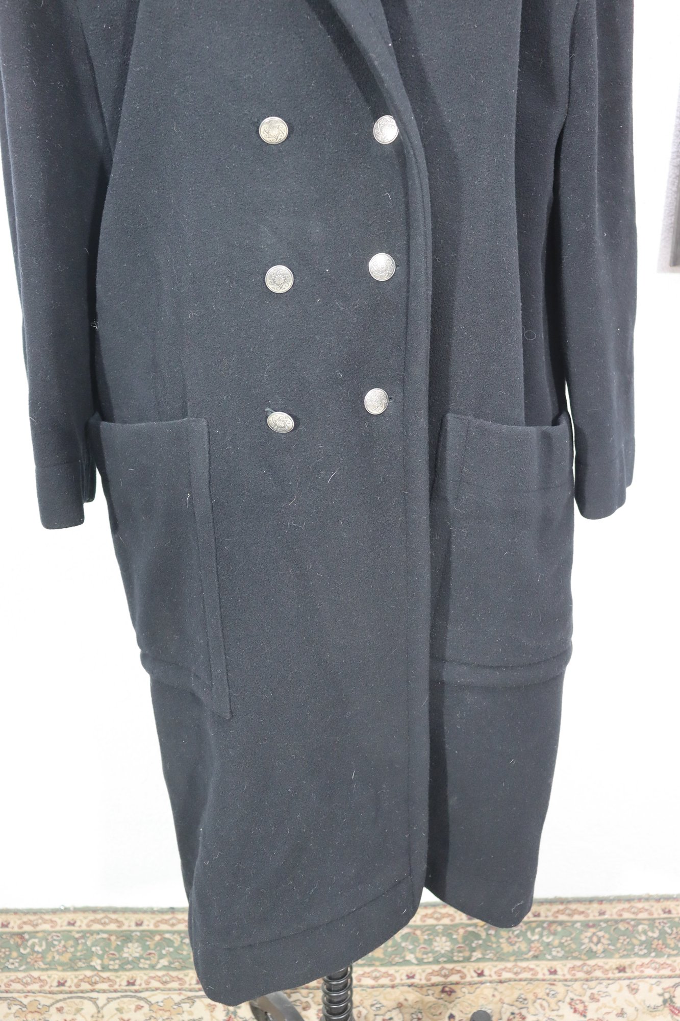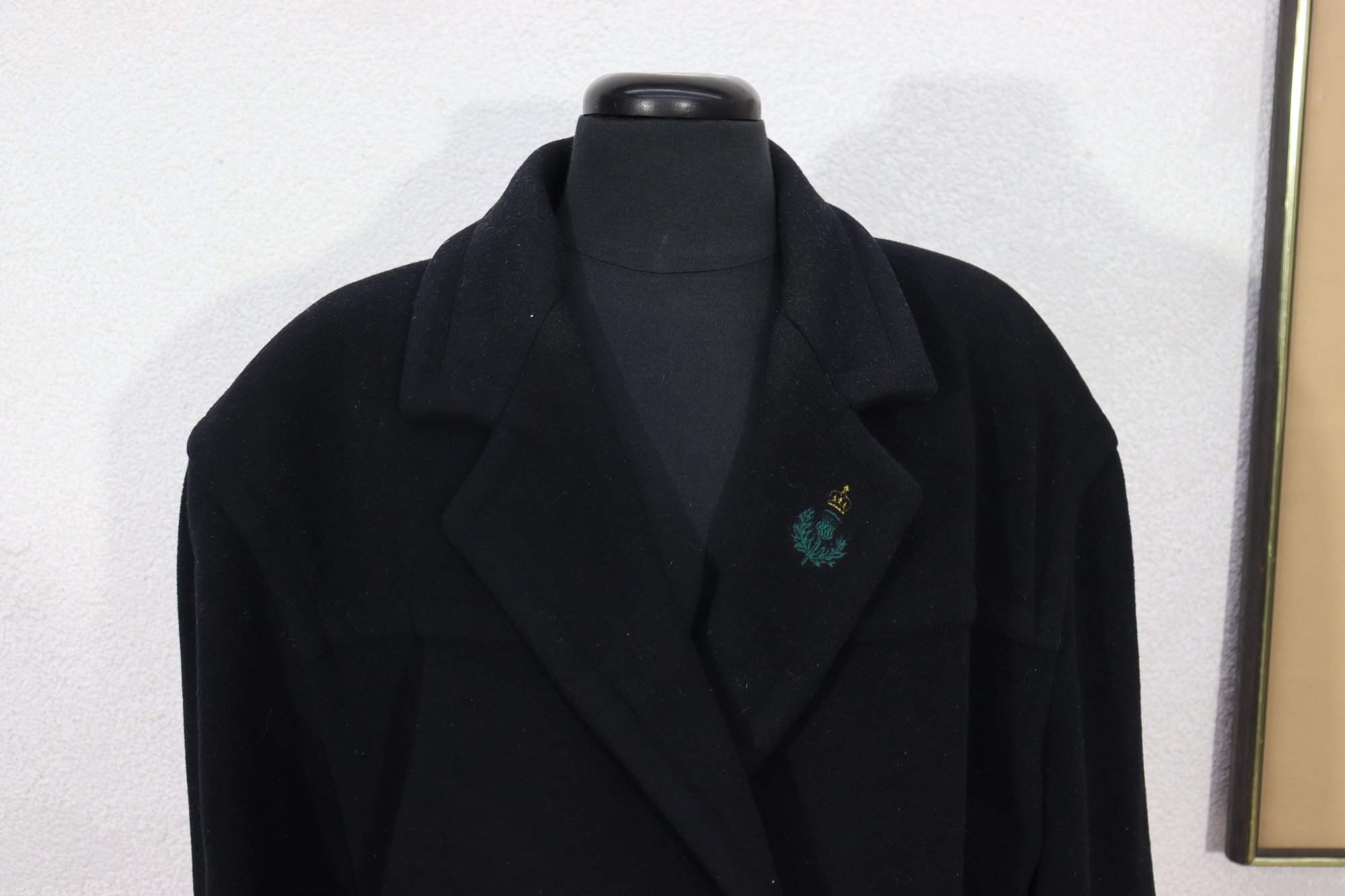 a vintage Byblos men’s long wool overcoat, made in Italy, size 42. This stunning coat features a classic double-breasted front with metal style crest buttons and embroidered crest detail on lapel. Beautiful Italian tailoring and structure throughout.