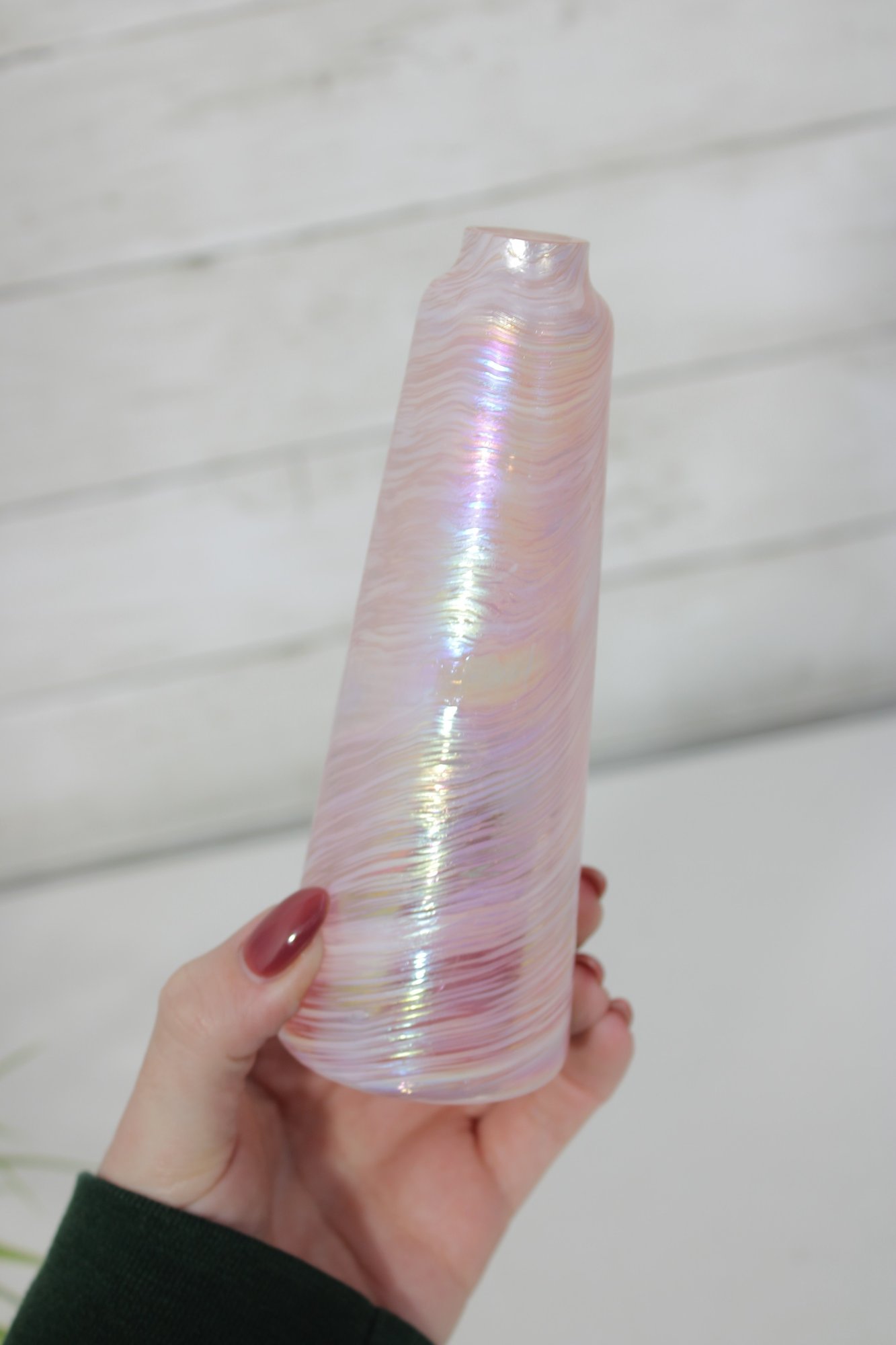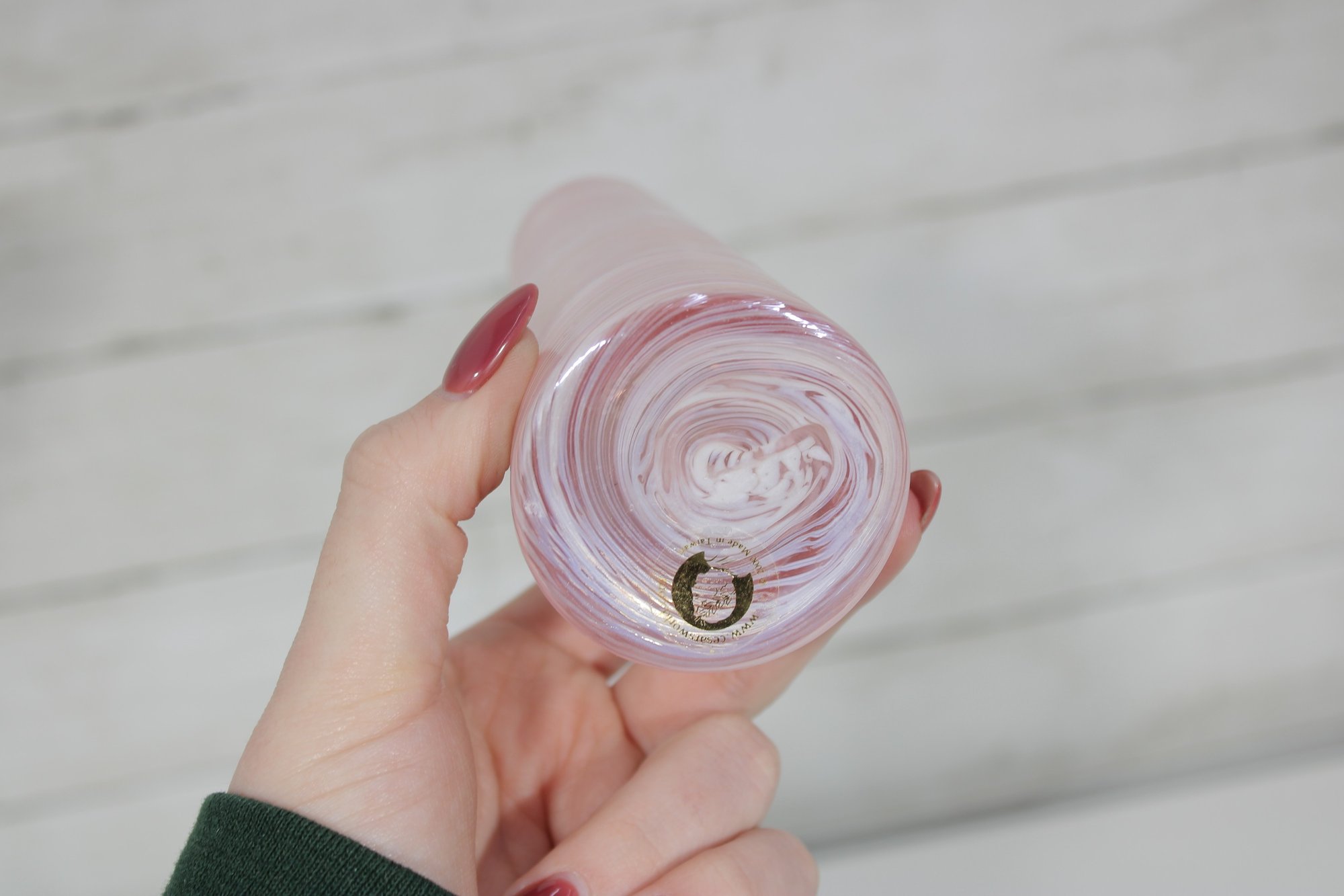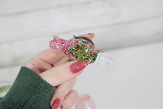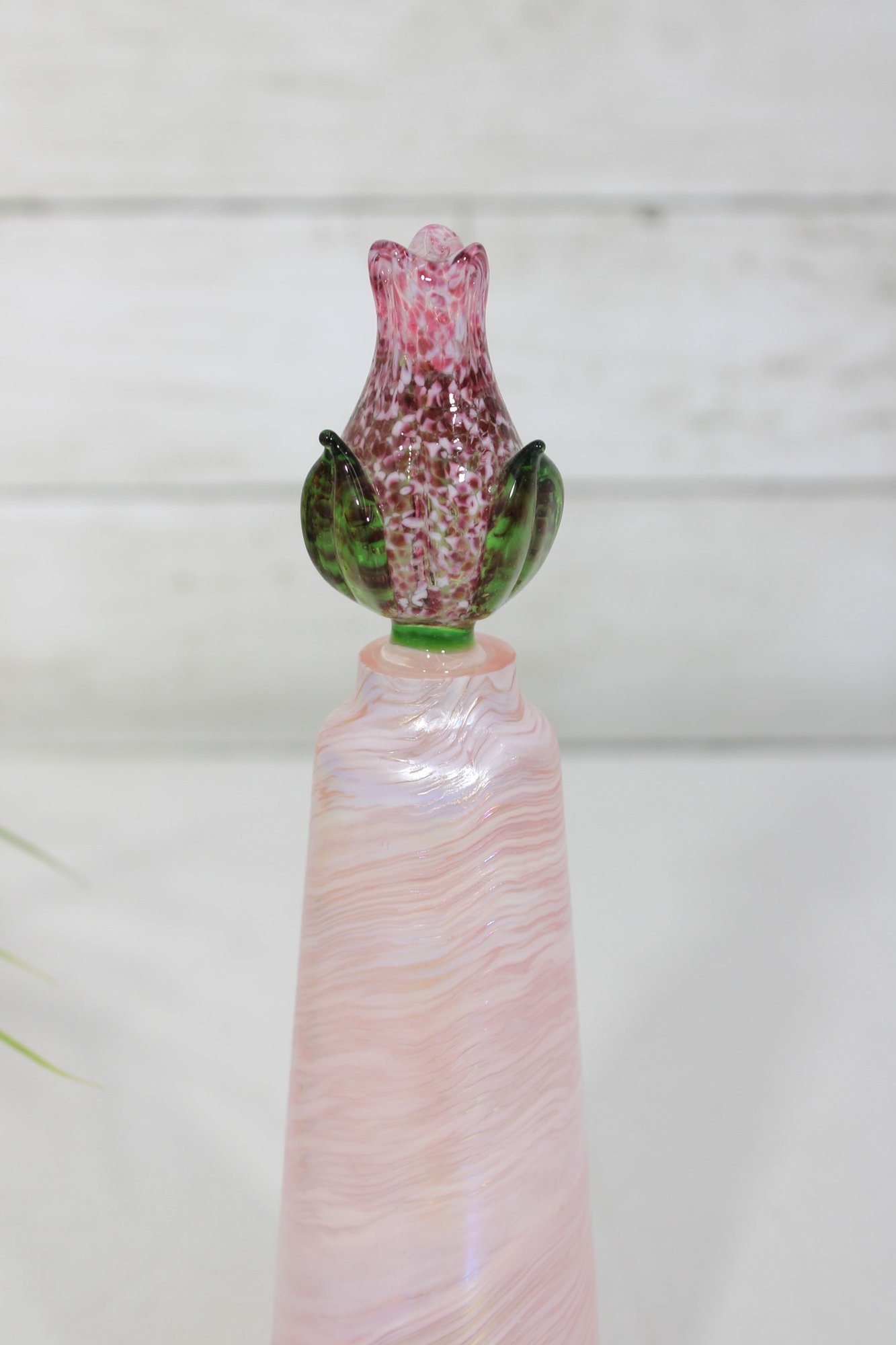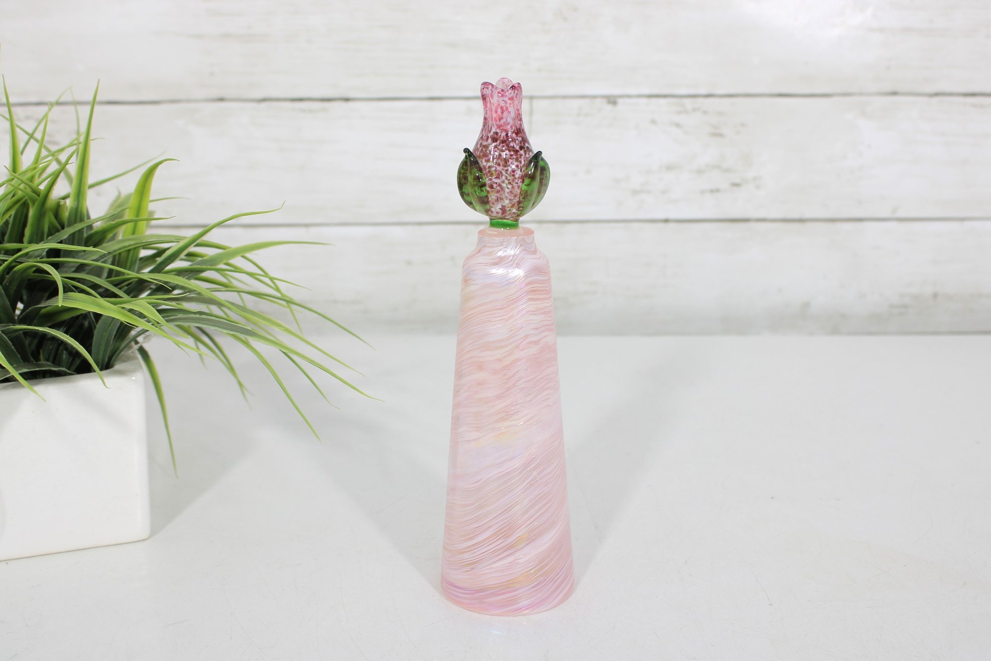 This elegant piece showcases a tapered cylindrical form with luminous opalescent tones that shimmer in the light. The matching stopper is crafted in the shape of a blooming rose, detailed in pink glass with green leaves and a clear stem. The base retains its original Caesar World label (see photos).