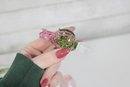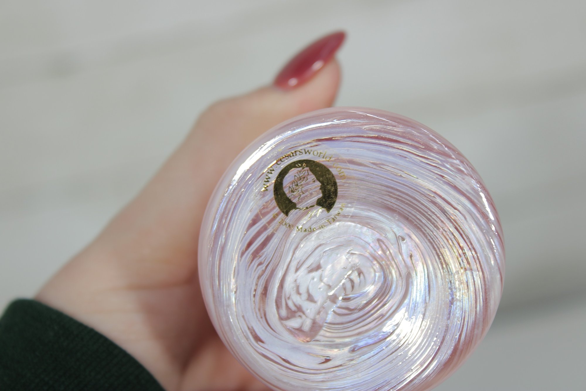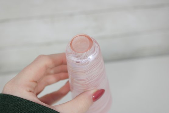 Stunning vintage Caesar World tall art glass perfume bottle featuring a beautiful pink iridescent swirl body and an ornate rose-shaped stopper.