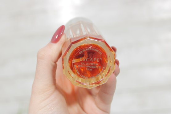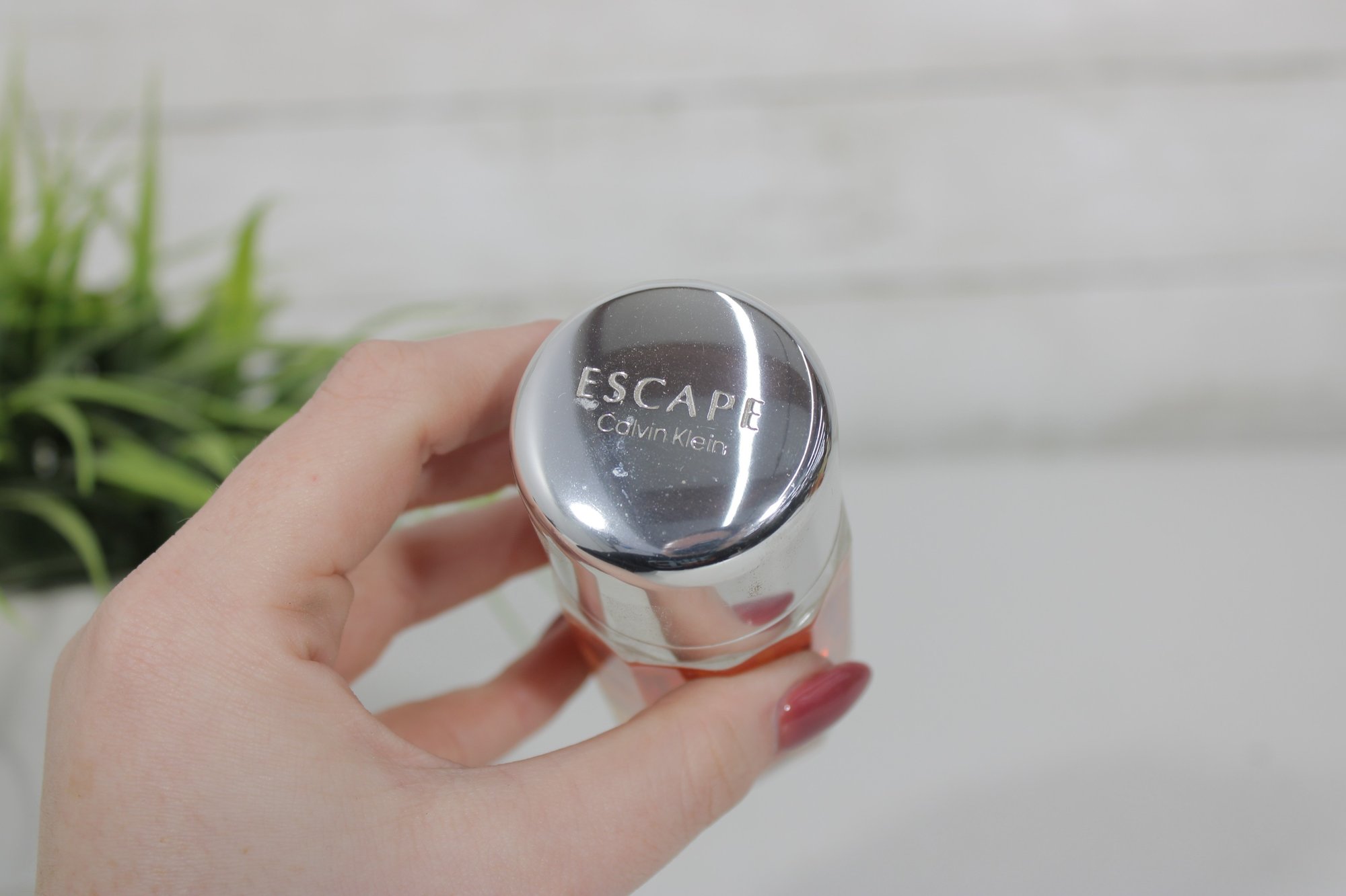 This elegant cylindrical bottle features the signature silver-tone cap engraved with “Escape Calvin Klein” and showcases the rich amber-colored fragrance inside.