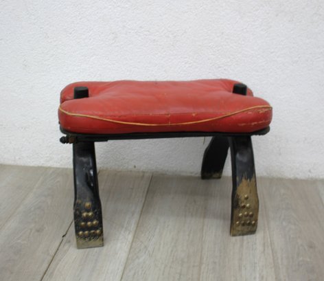 This unique vintage camel saddle features a striking red leather seat with decorative brass studs on the legs. The saddle is mounted on a sturdy wooden stand, making it a fantastic conversation piece or decorative item for your home. The red leather shows signs of wear, adding to its vintage charm.