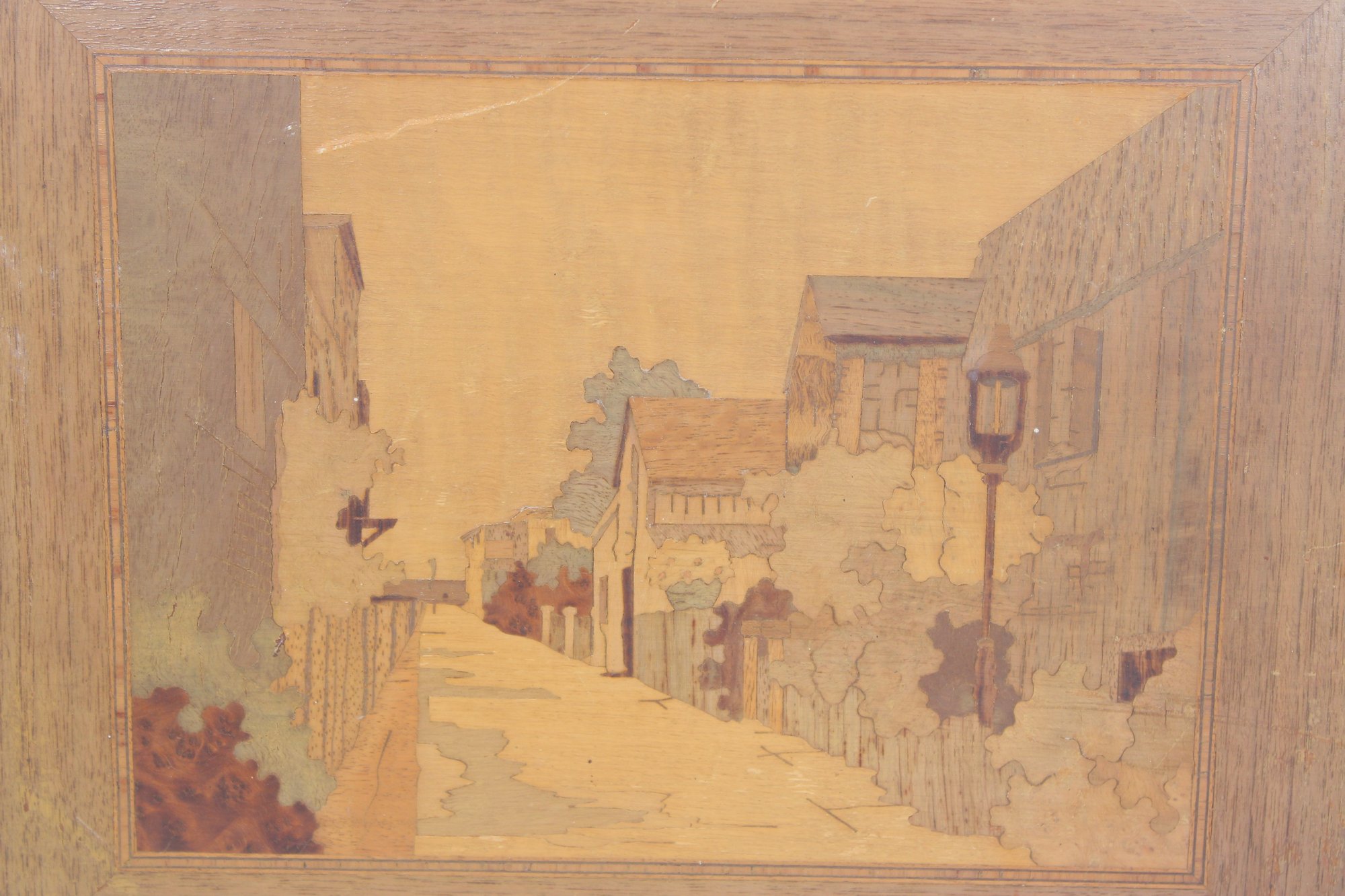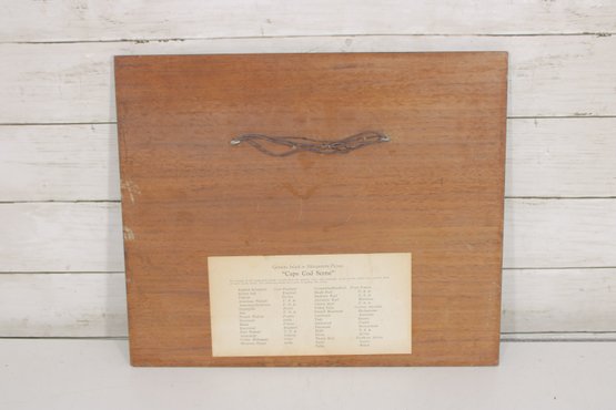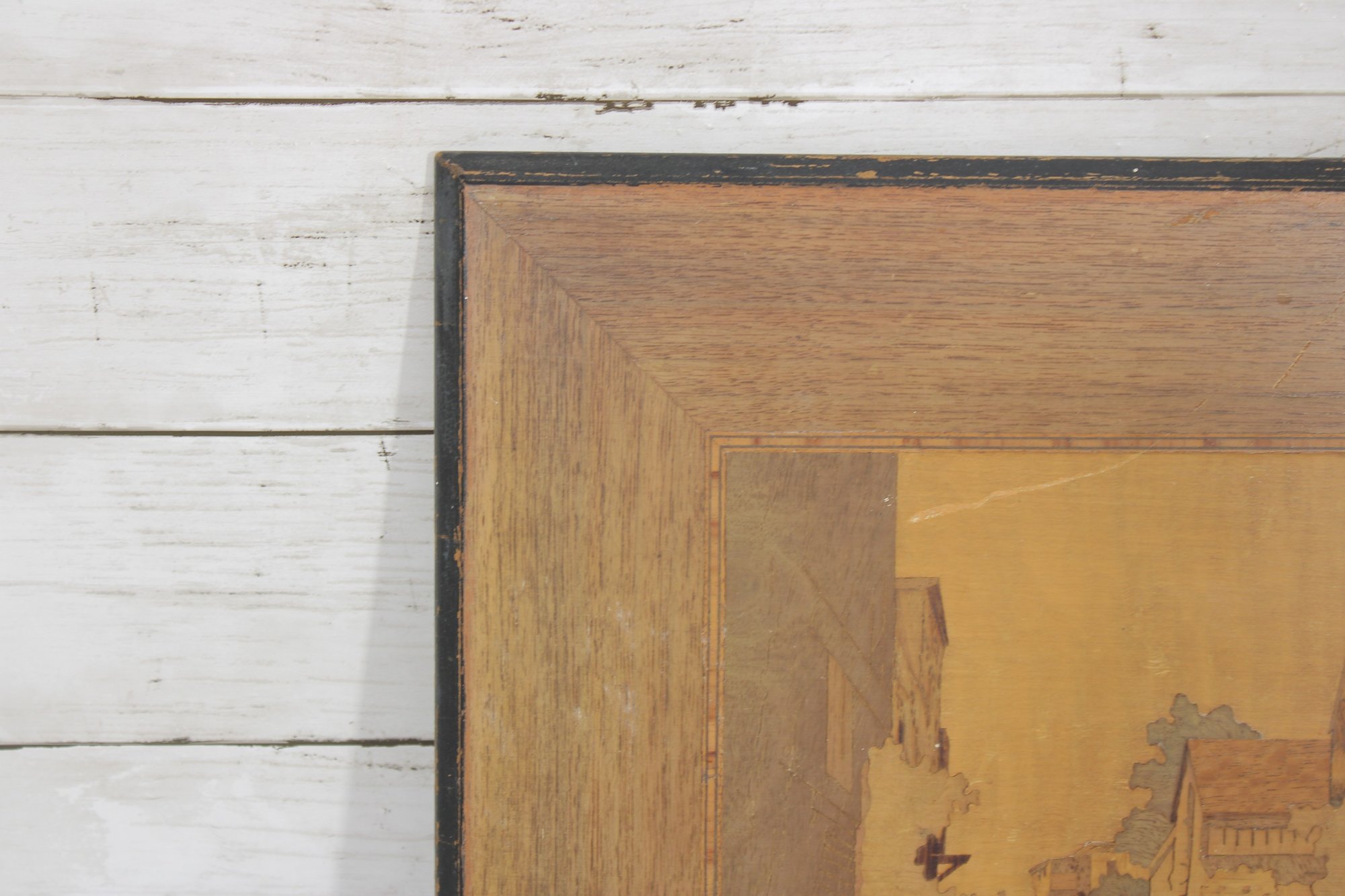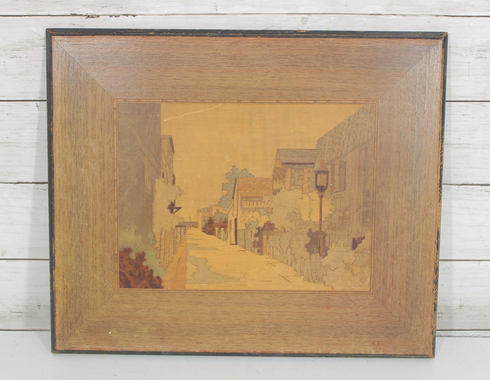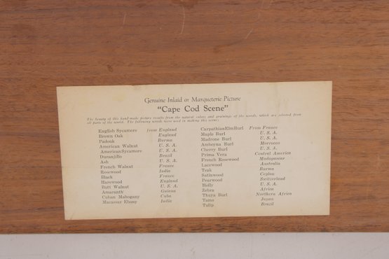 a vintage “Cape Cod Scene” wall art piece, crafted in a marquetry-style wood inlay design.