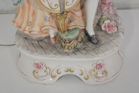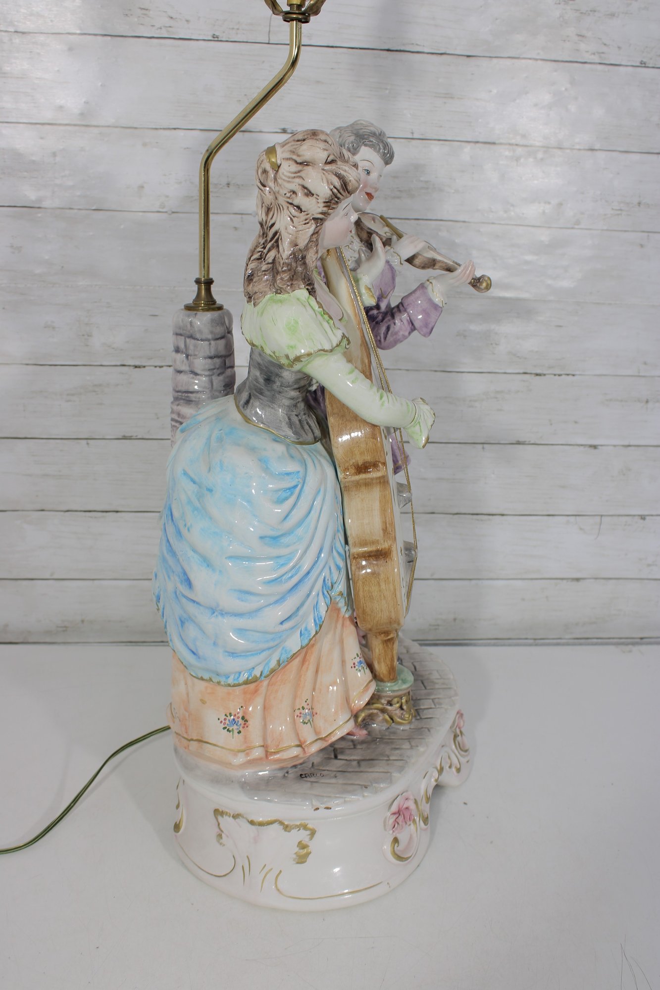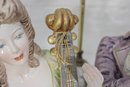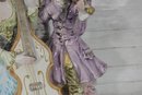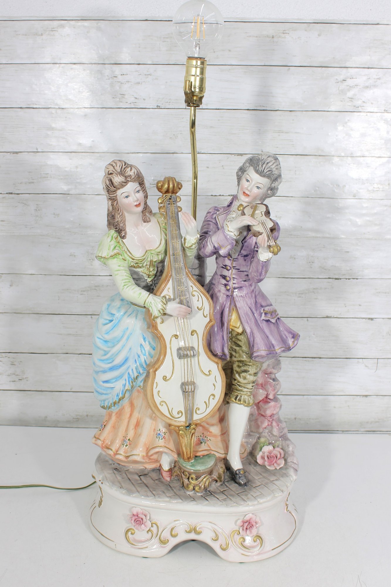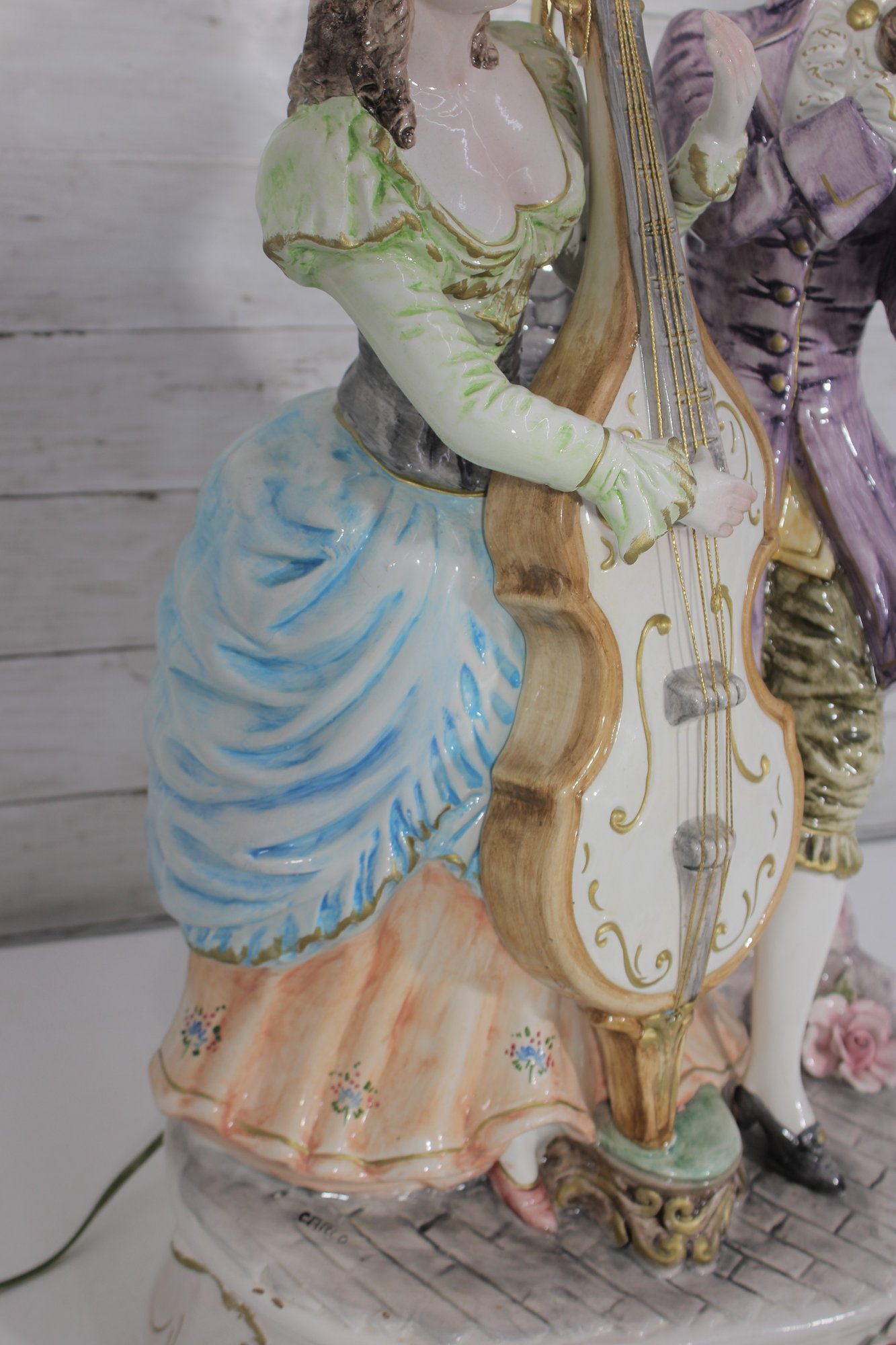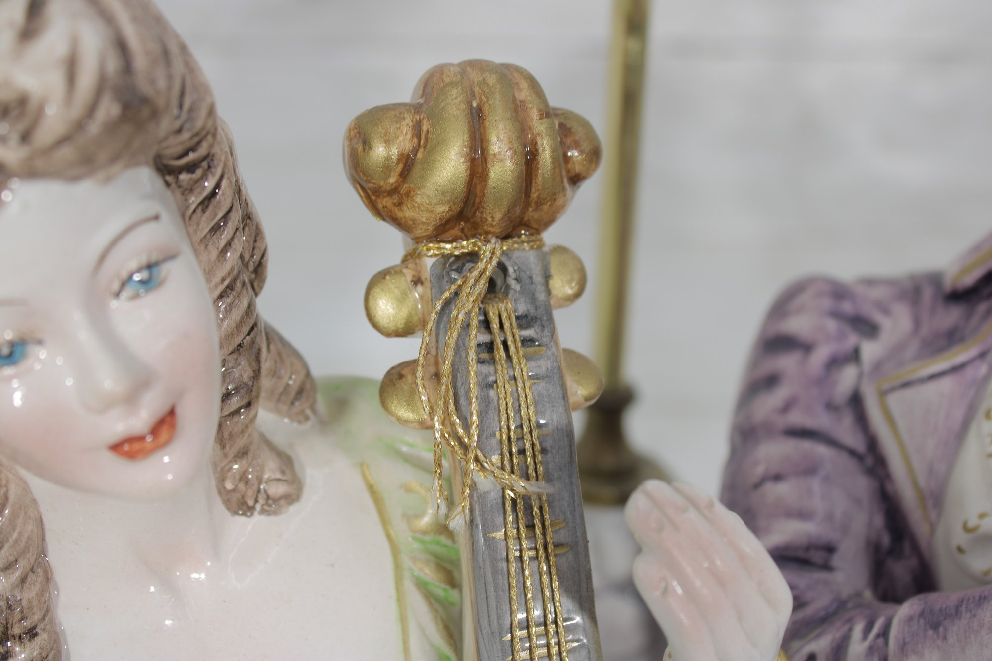 vintage Capodimonte porcelain figural lamp featuring a beautifully detailed courting couple dressed in romantic period attire. The pair stands beside a decorative lute, finished with soft pastel colors, hand-painted floral accents, and gold-tone detailing that highlight the classical European design.