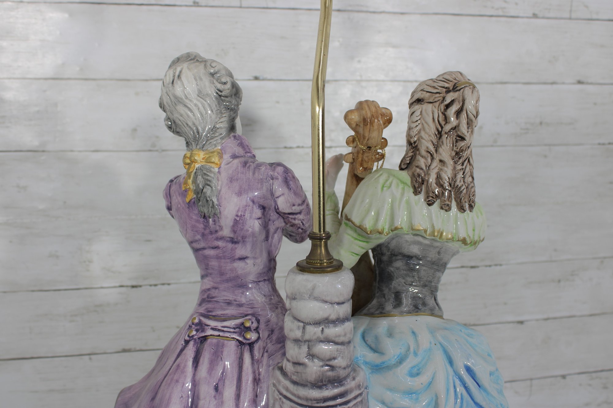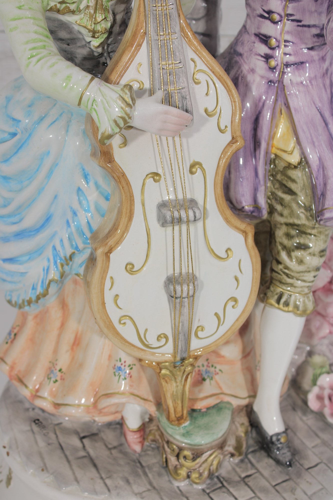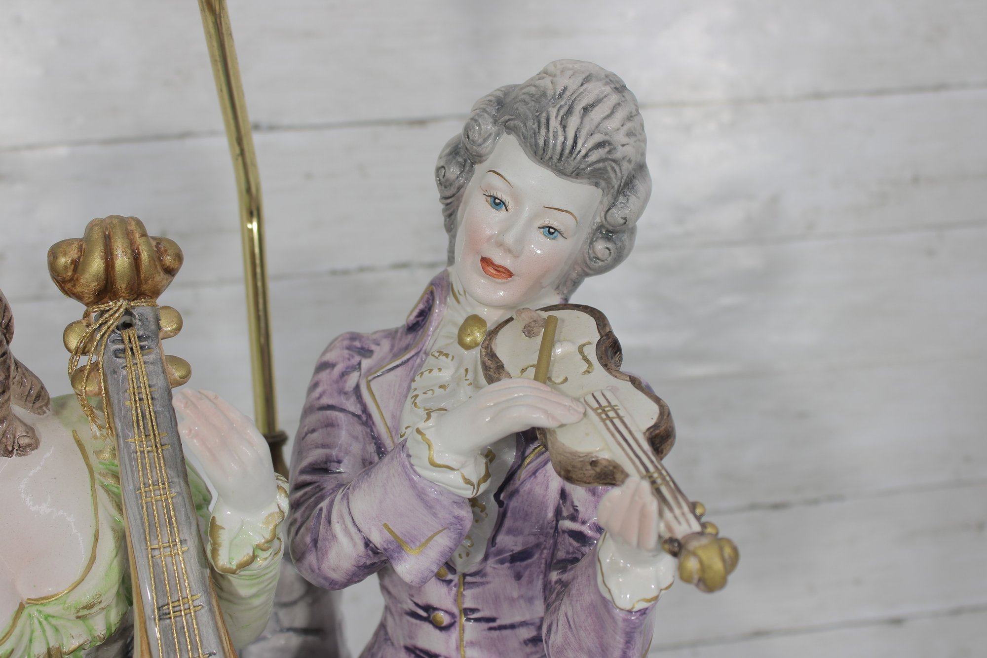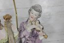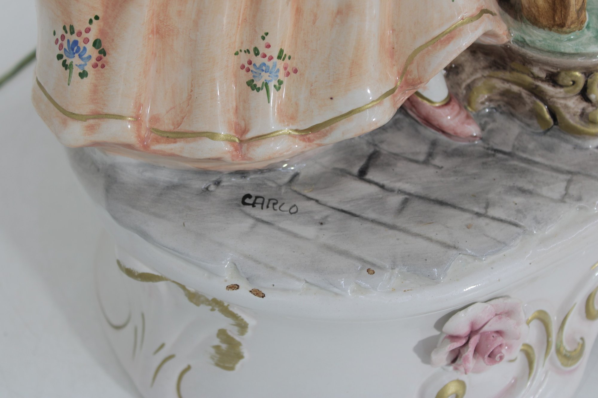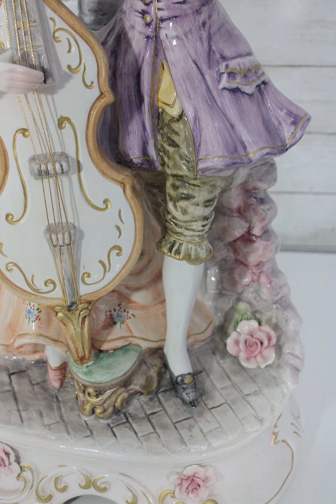 vintage Capodimonte porcelain figural lamp featuring a beautifully detailed courting couple dressed in romantic period attire. The pair stands beside a decorative lute, finished with soft pastel colors, hand-painted floral accents, and gold-tone detailing that highlight the classical European design.