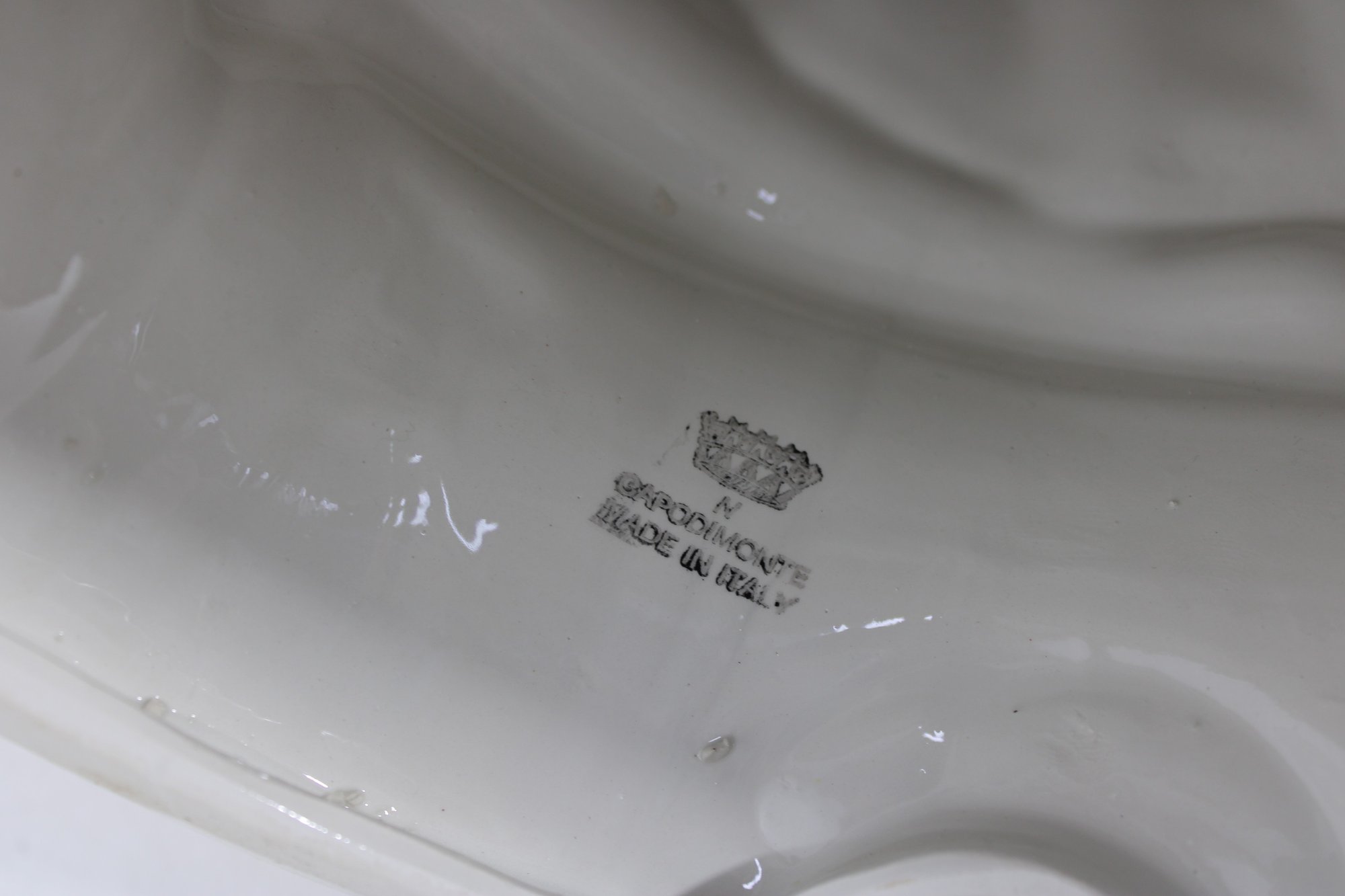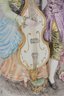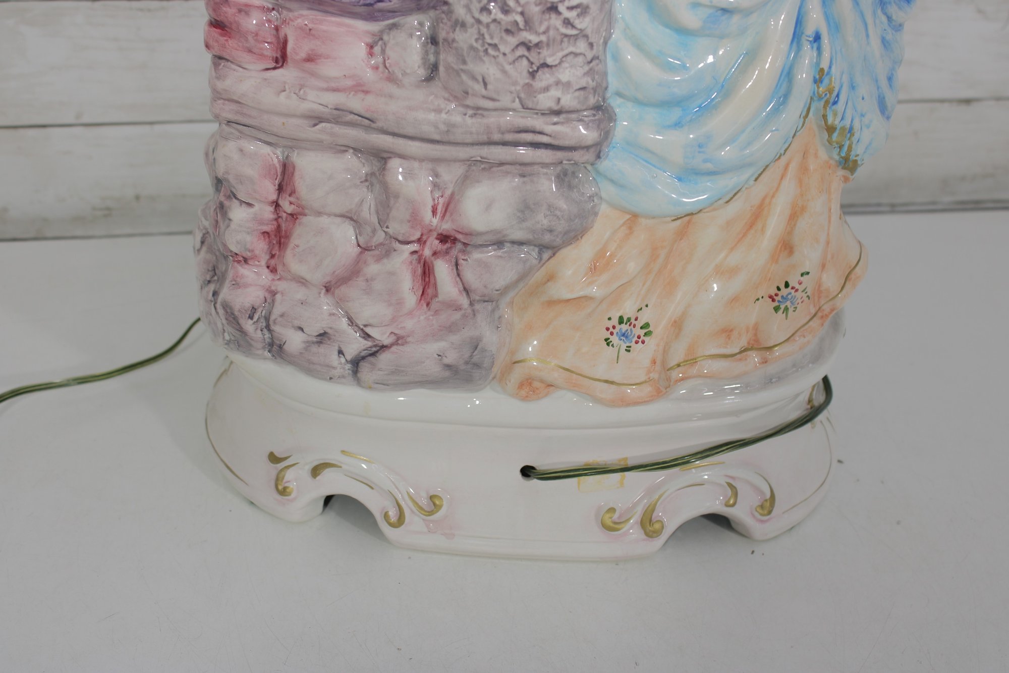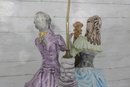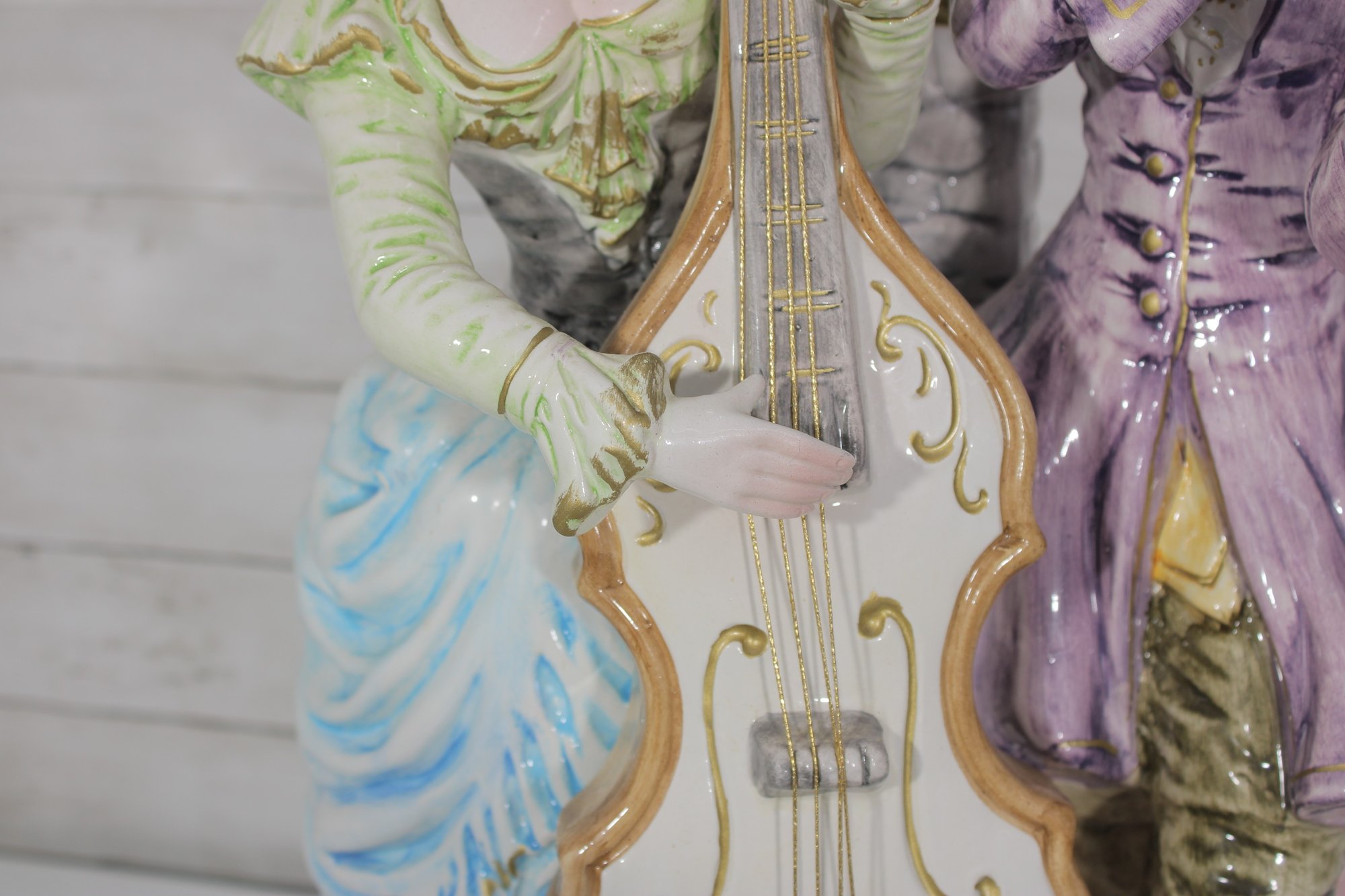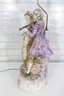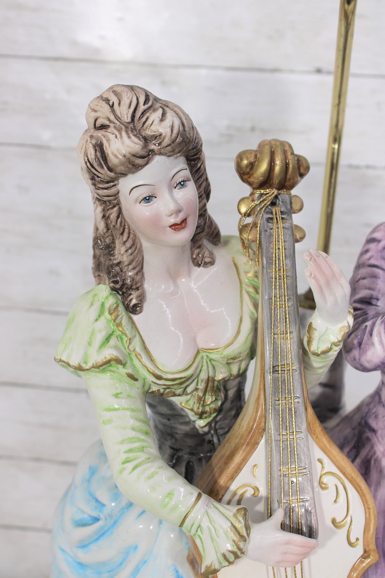 vintage Capodimonte porcelain figural lamp featuring a beautifully detailed courting couple dressed in romantic period attire. The pair stands beside a decorative lute, finished with soft pastel colors, hand-painted floral accents, and gold-tone detailing that highlight the classical European design.