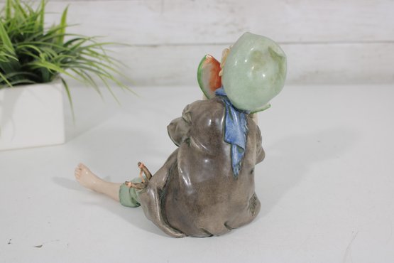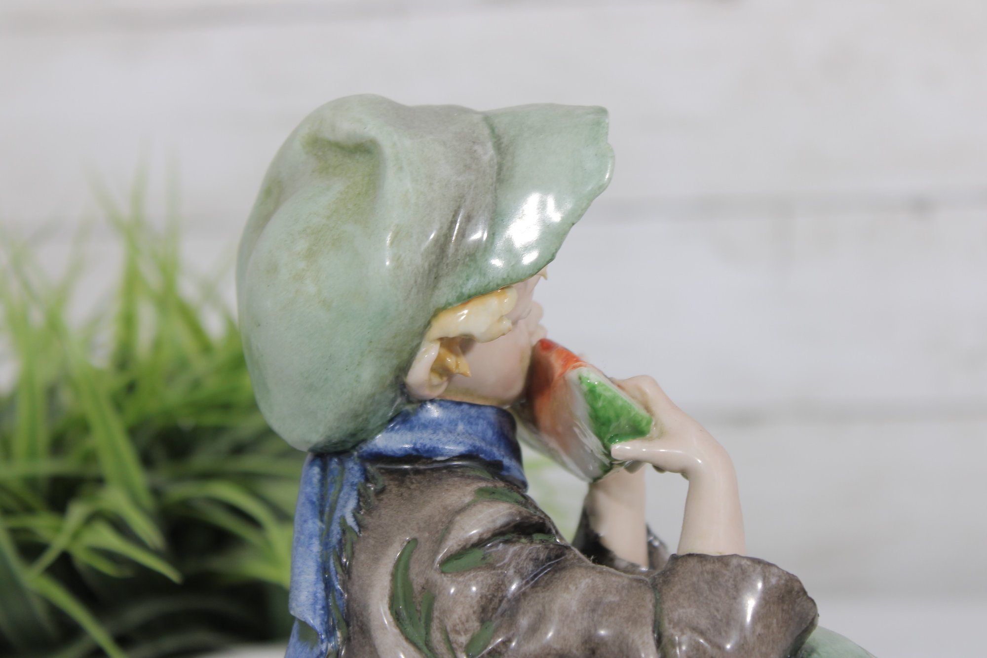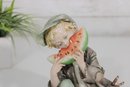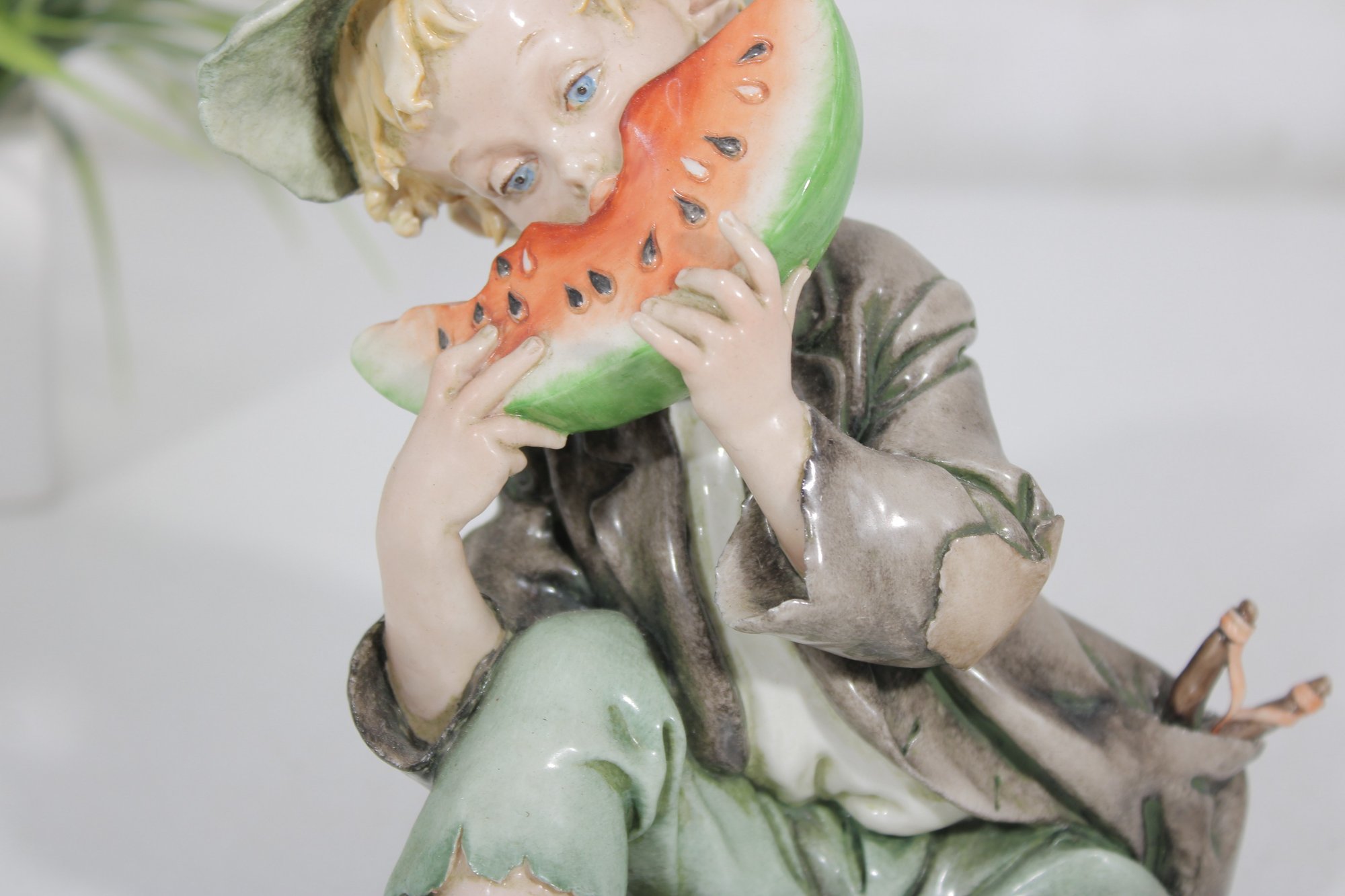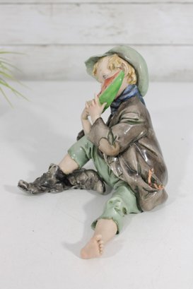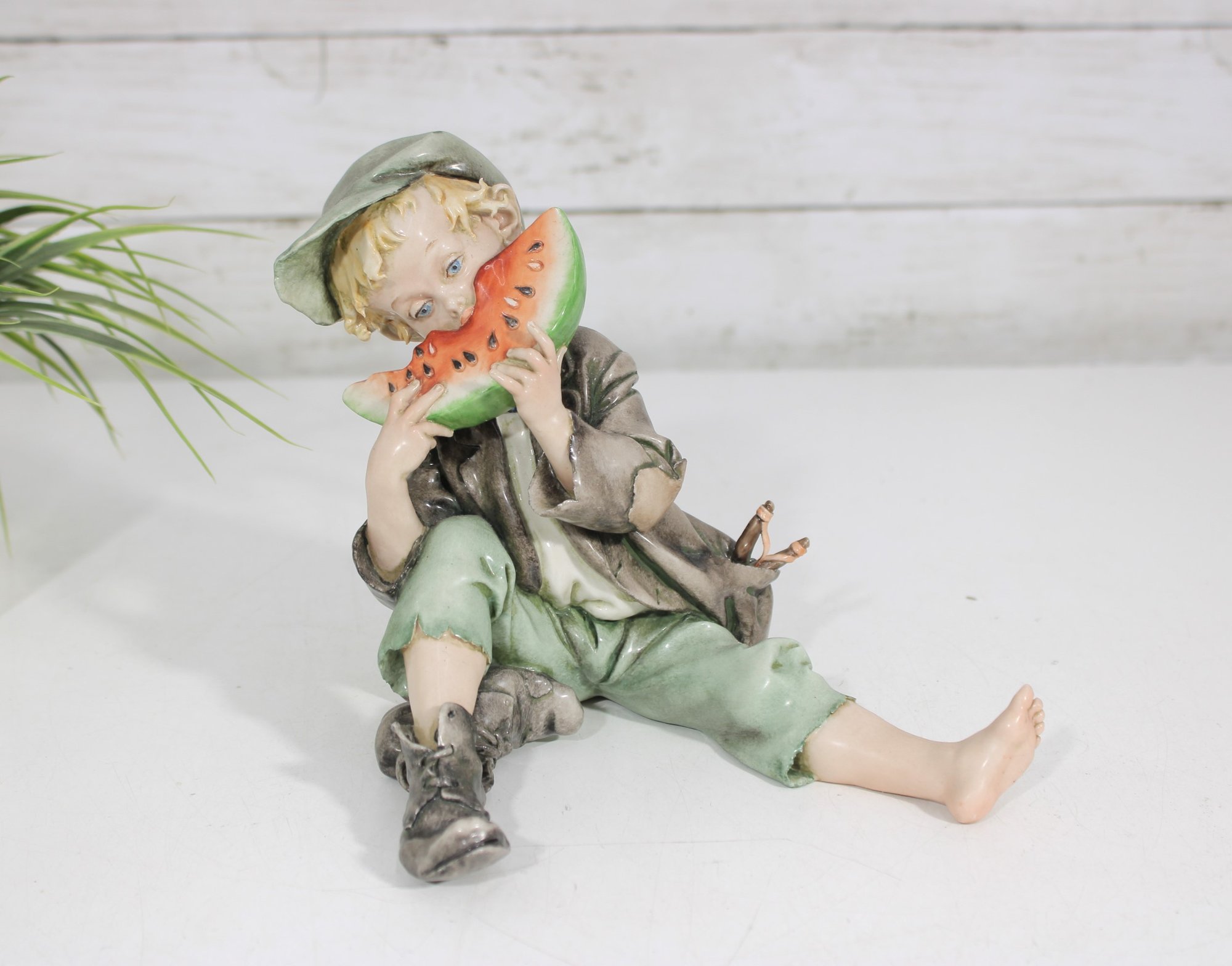 Charming vintage Capodimonte porcelain figurine depicting a young boy joyfully eating a slice of watermelon. This delightful piece captures a playful and carefree moment, with expressive facial details and lifelike posture.