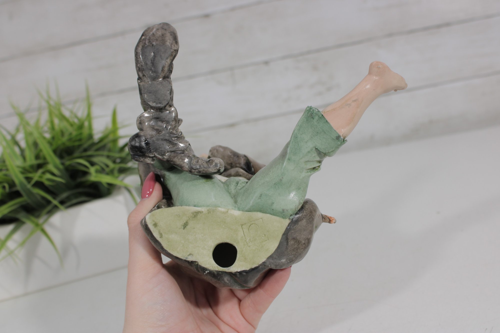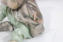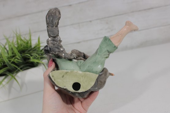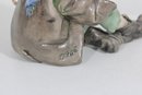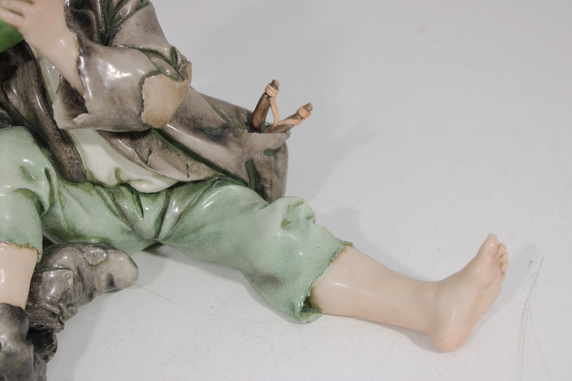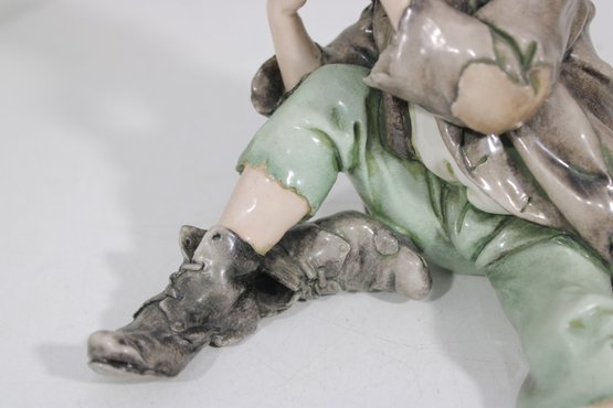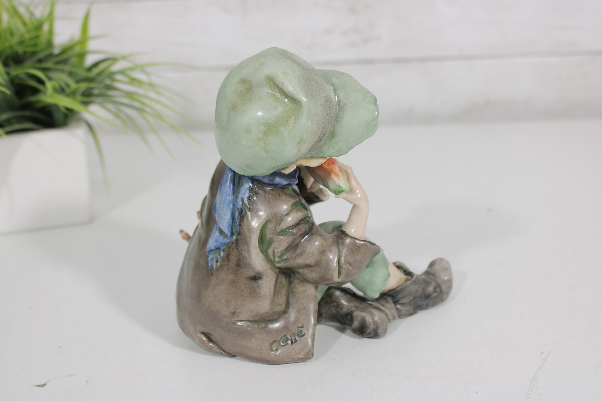 Charming vintage Capodimonte porcelain figurine depicting a young boy joyfully eating a slice of watermelon. This delightful piece captures a playful and carefree moment, with expressive facial details and lifelike posture.