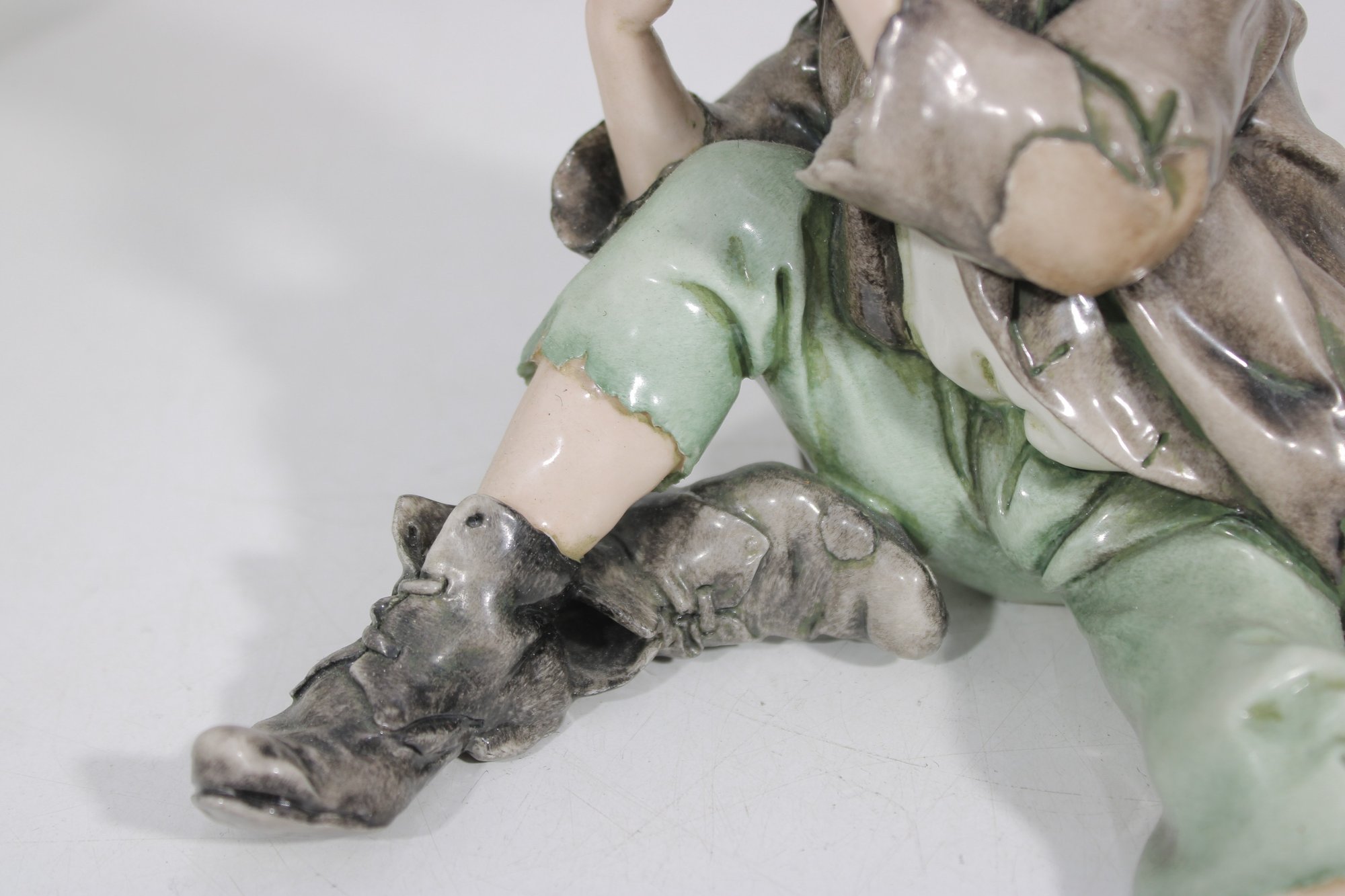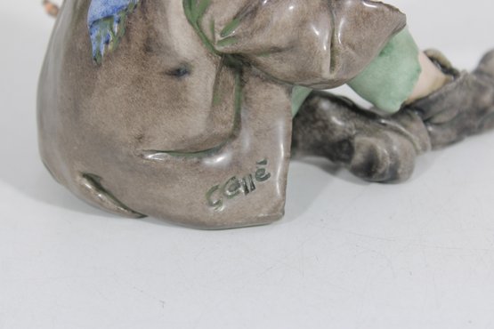Expertly hand-painted, the figurine features soft, natural tones—from the boy’s green clothing and rustic jacket to the vibrant red and green of the watermelon. Fine detailing such as the textured clothing, shoelaces, and the boy’s tousled hair highlight the craftsmanship typical of Capodimonte artistry.