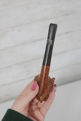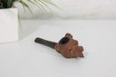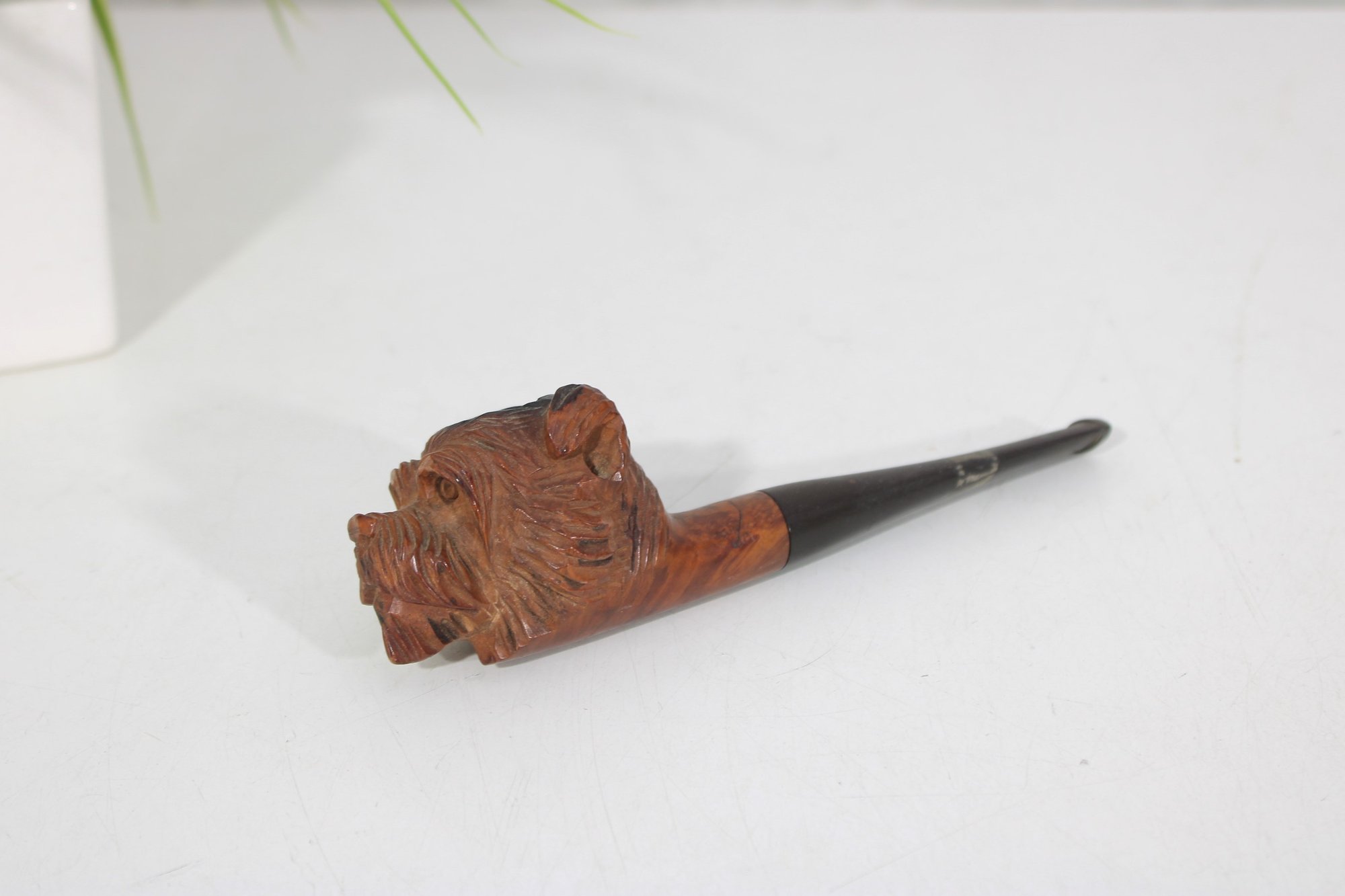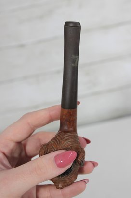 The pipe appears to be crafted in a carved wood or briar-style material, with a darker tapered stem. The figural design adds character and makes this piece appealing not only as a functional pipe but also as a collectible display item for pipe collectors or dog enthusiasts.