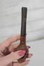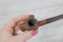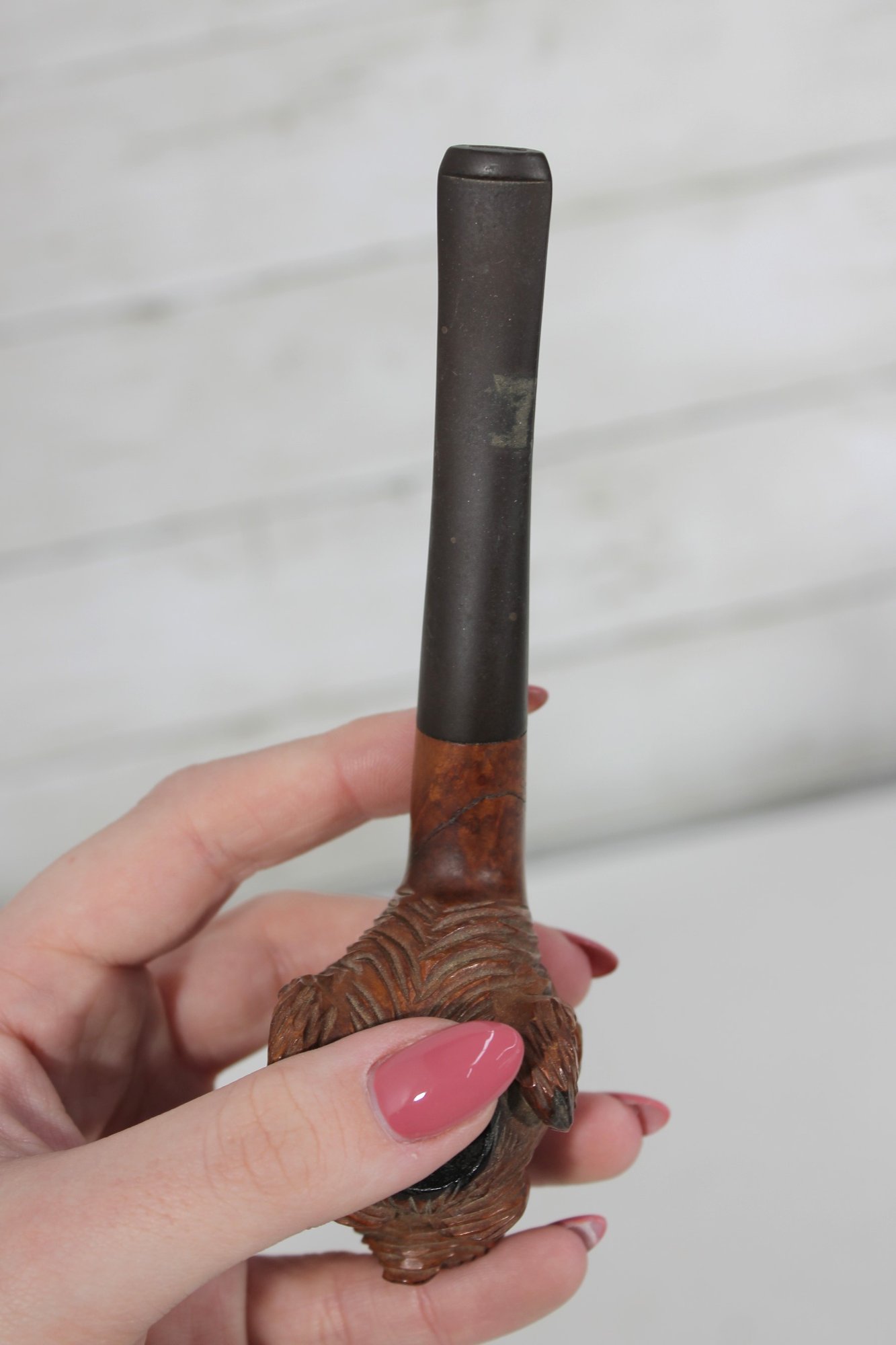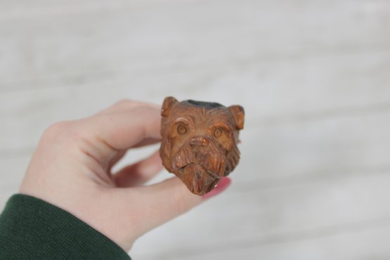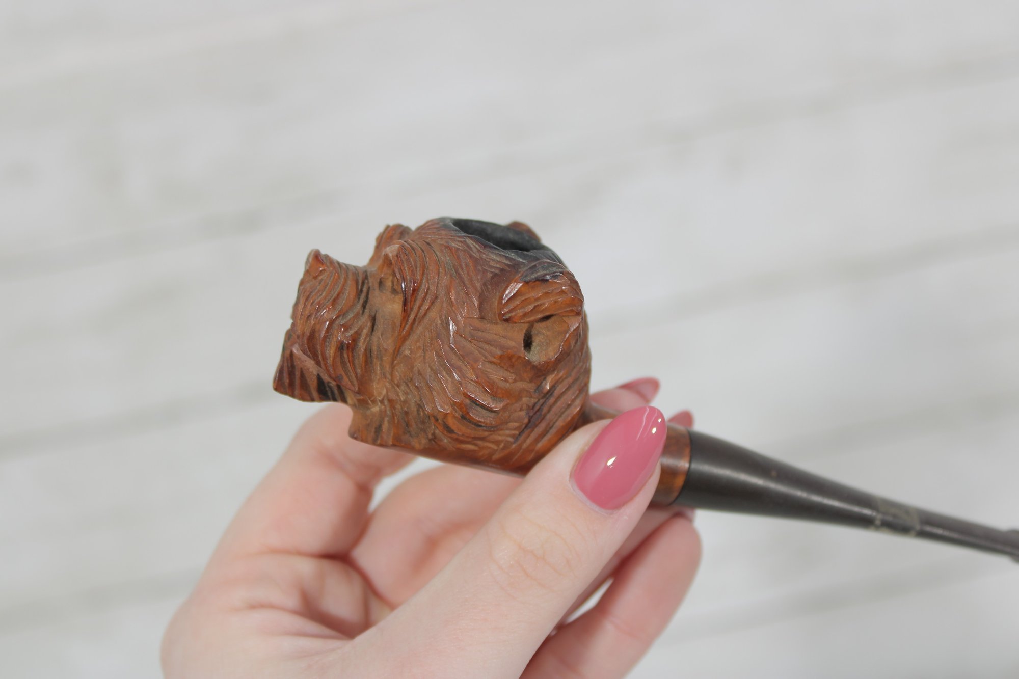 vintage figural smoking pipe measuring approximately 6 inches long. The bowl is carved in the form of a dog’s head, featuring detailed fur texture, expressive eyes, and sculpted facial features.