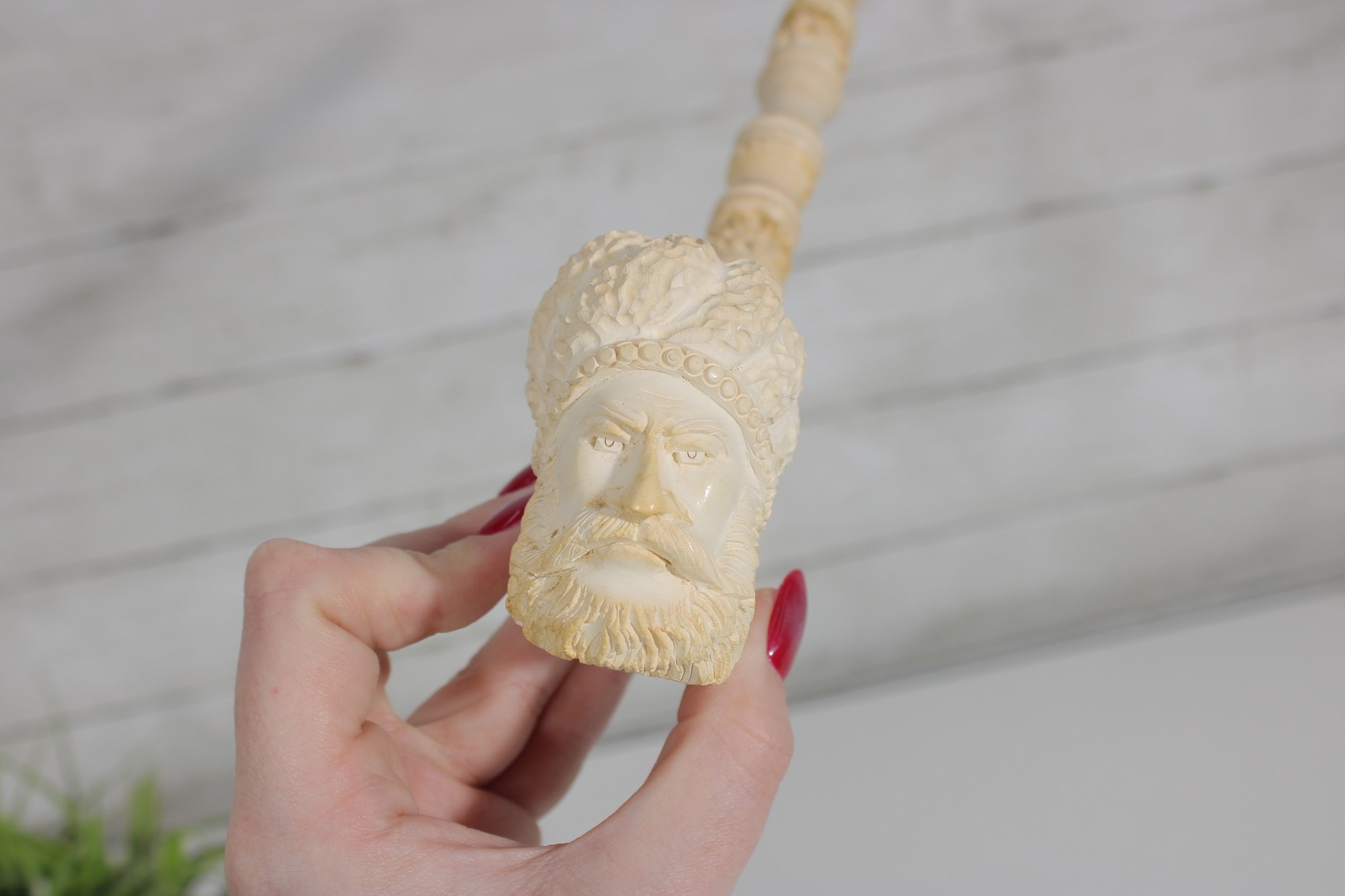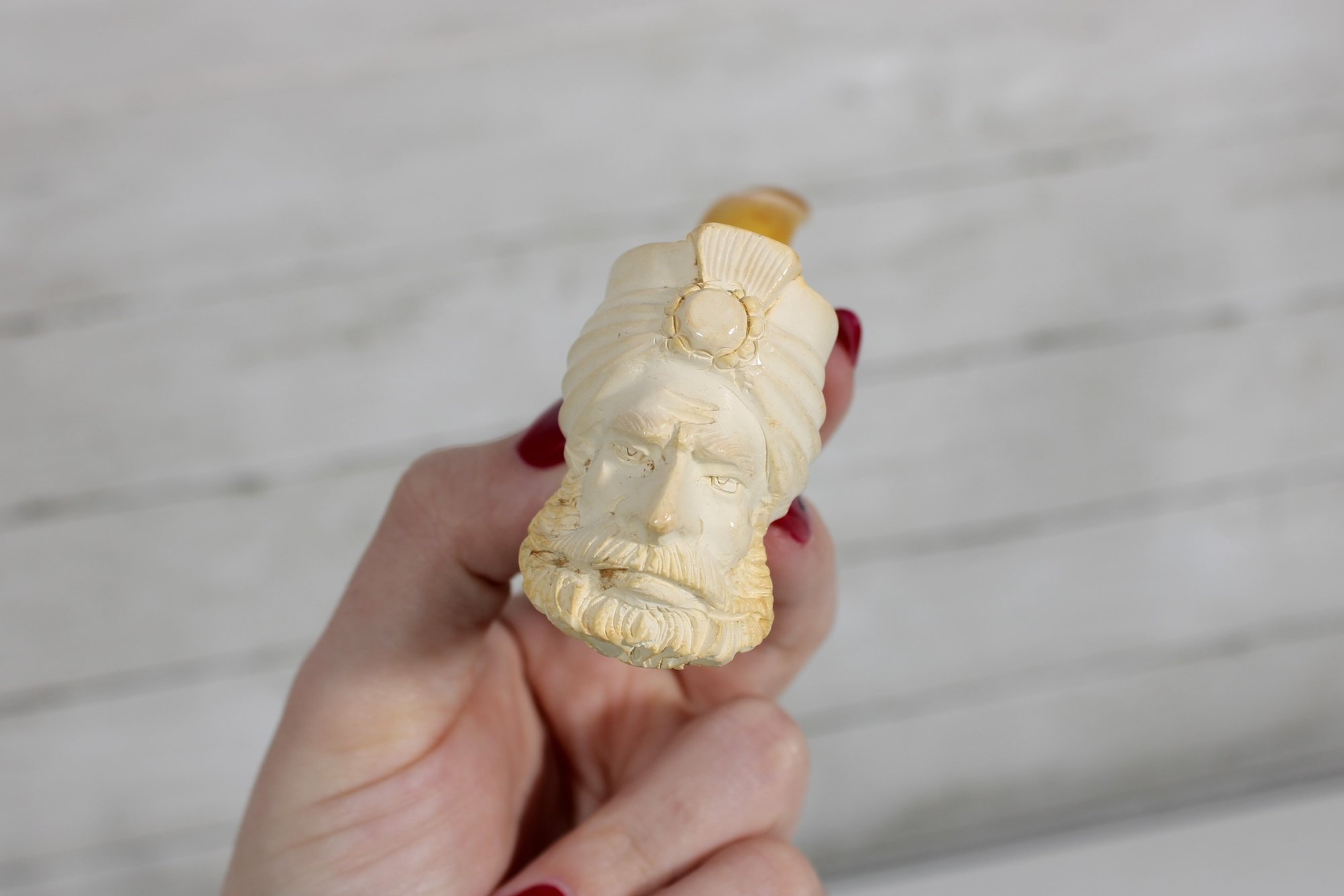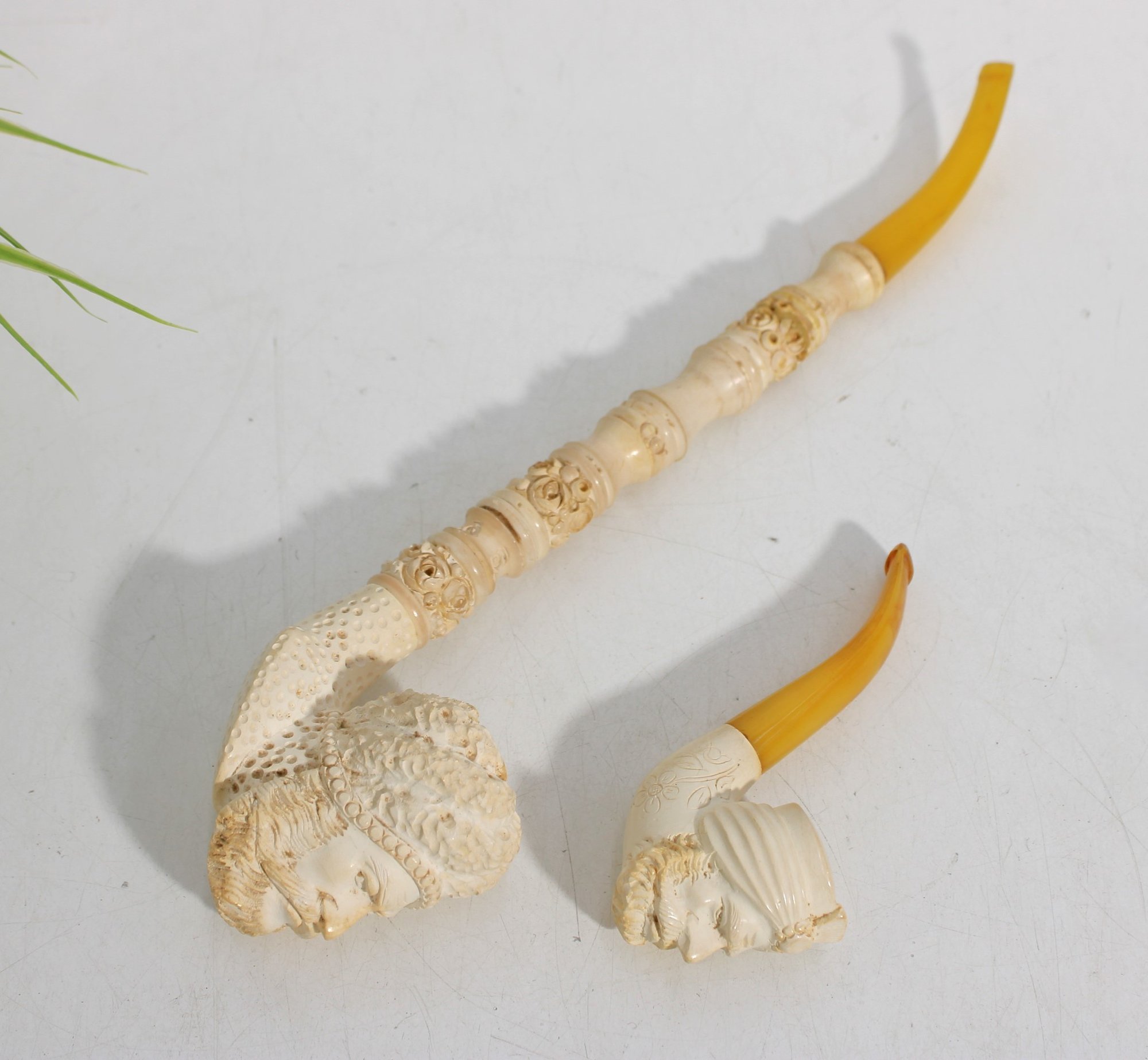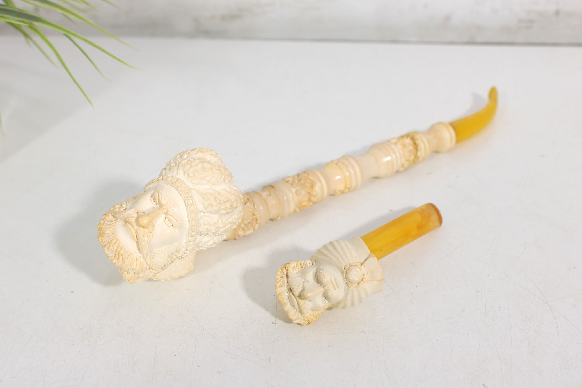 Unique set of two vintage carved figural pipes featuring detailed craftsmanship and striking character designs. Each pipe showcases a sculpted bearded figure wearing a turban, with intricate carved patterns along the stems and bowls.