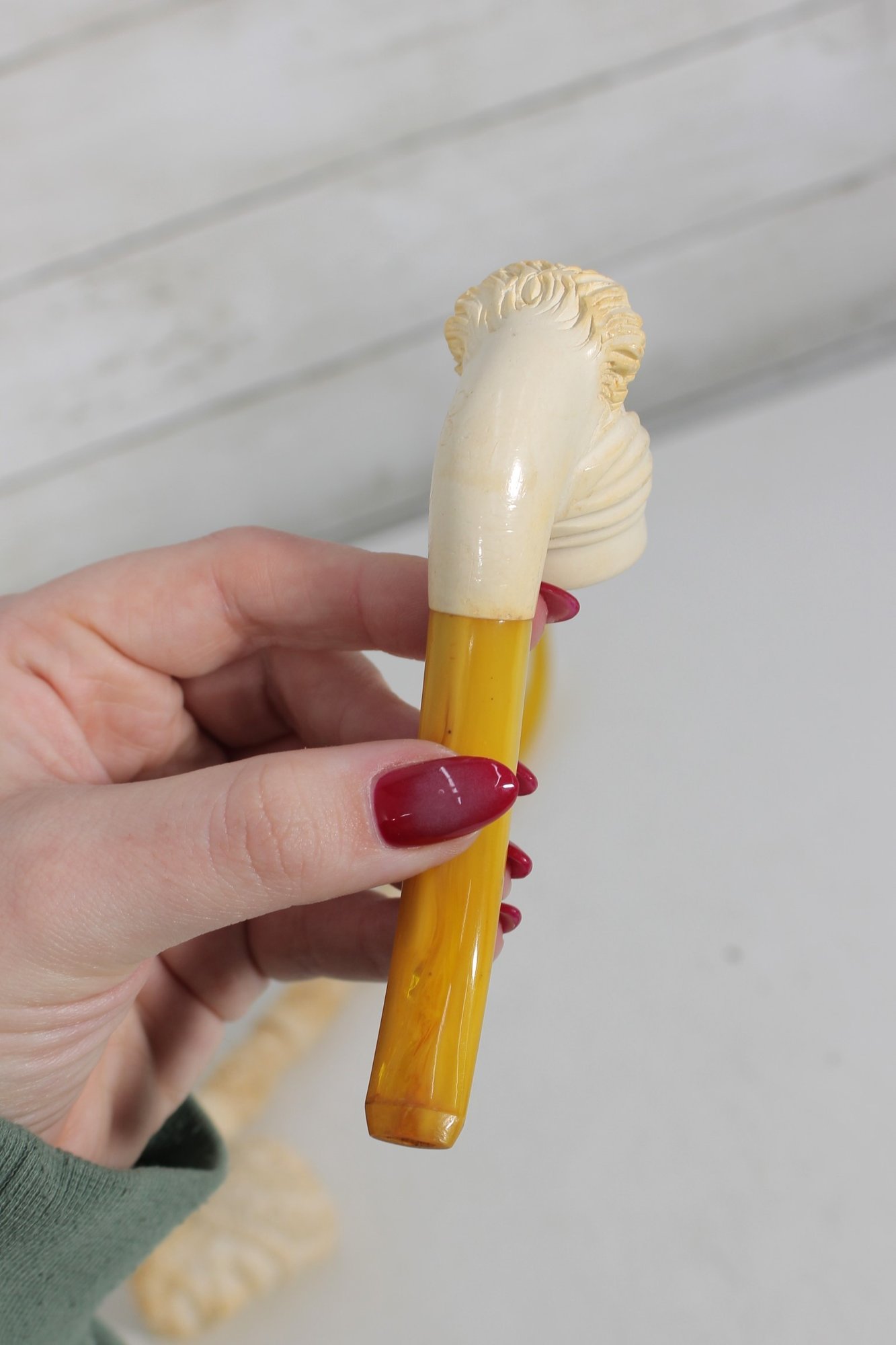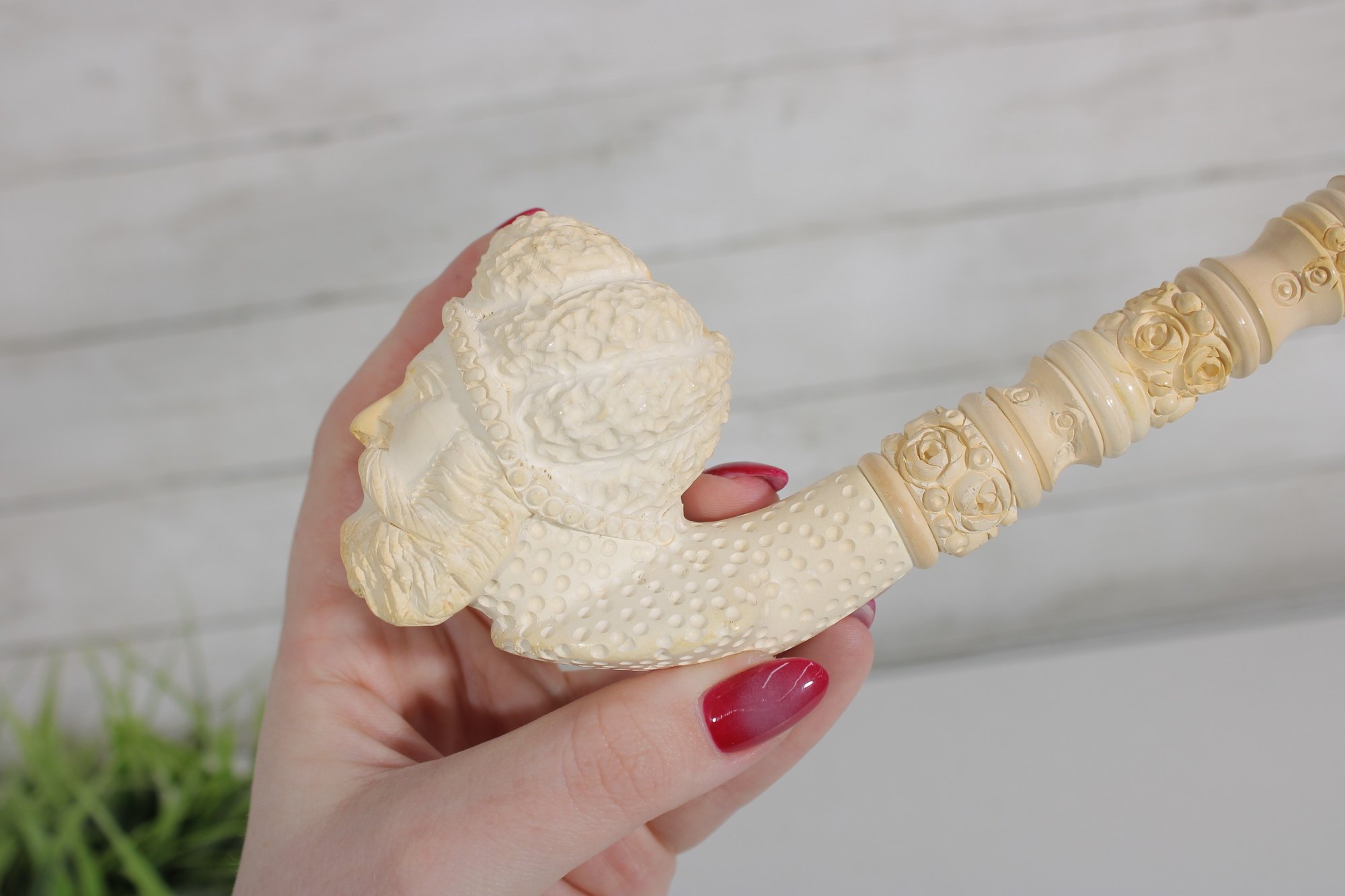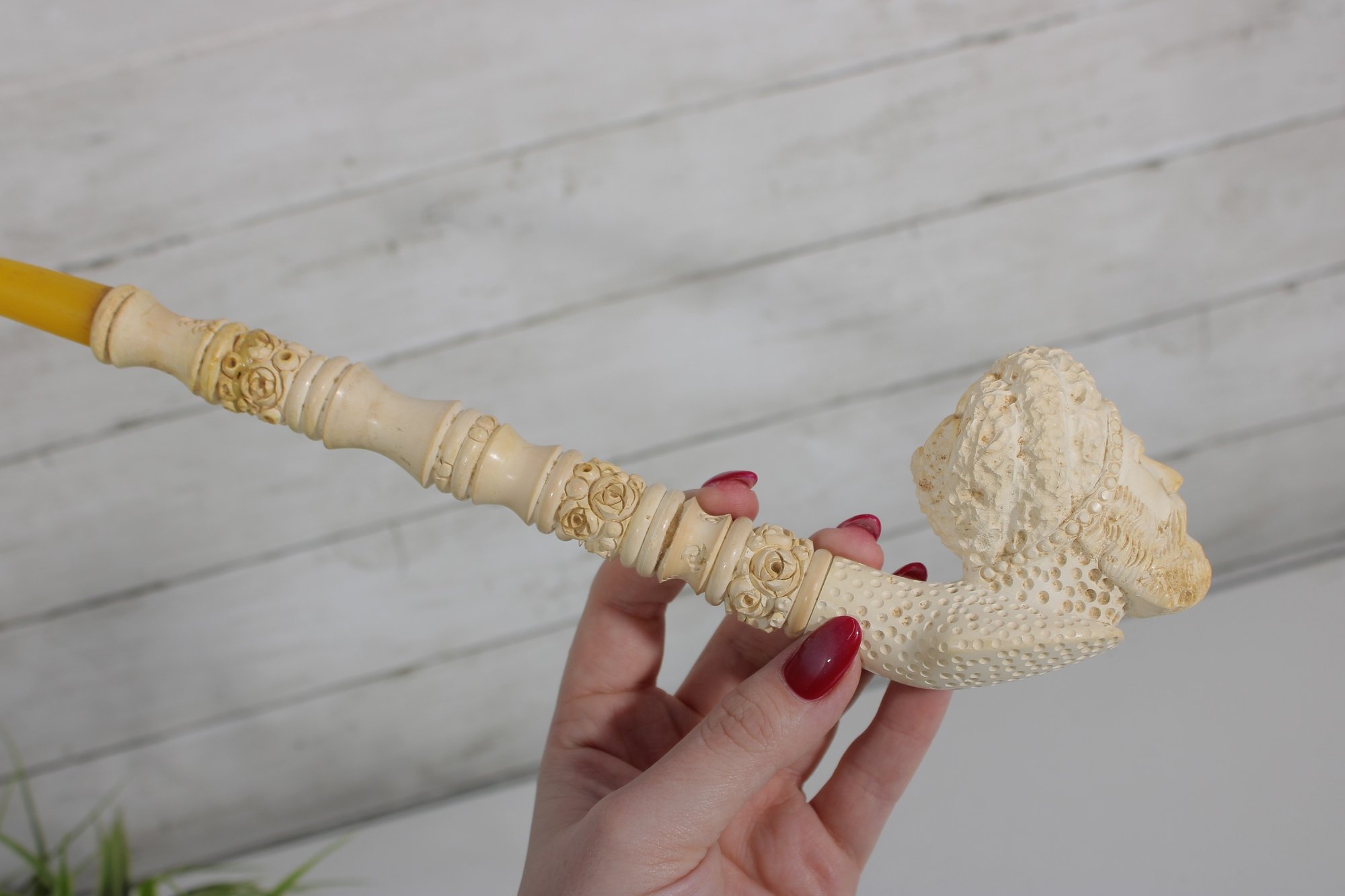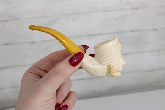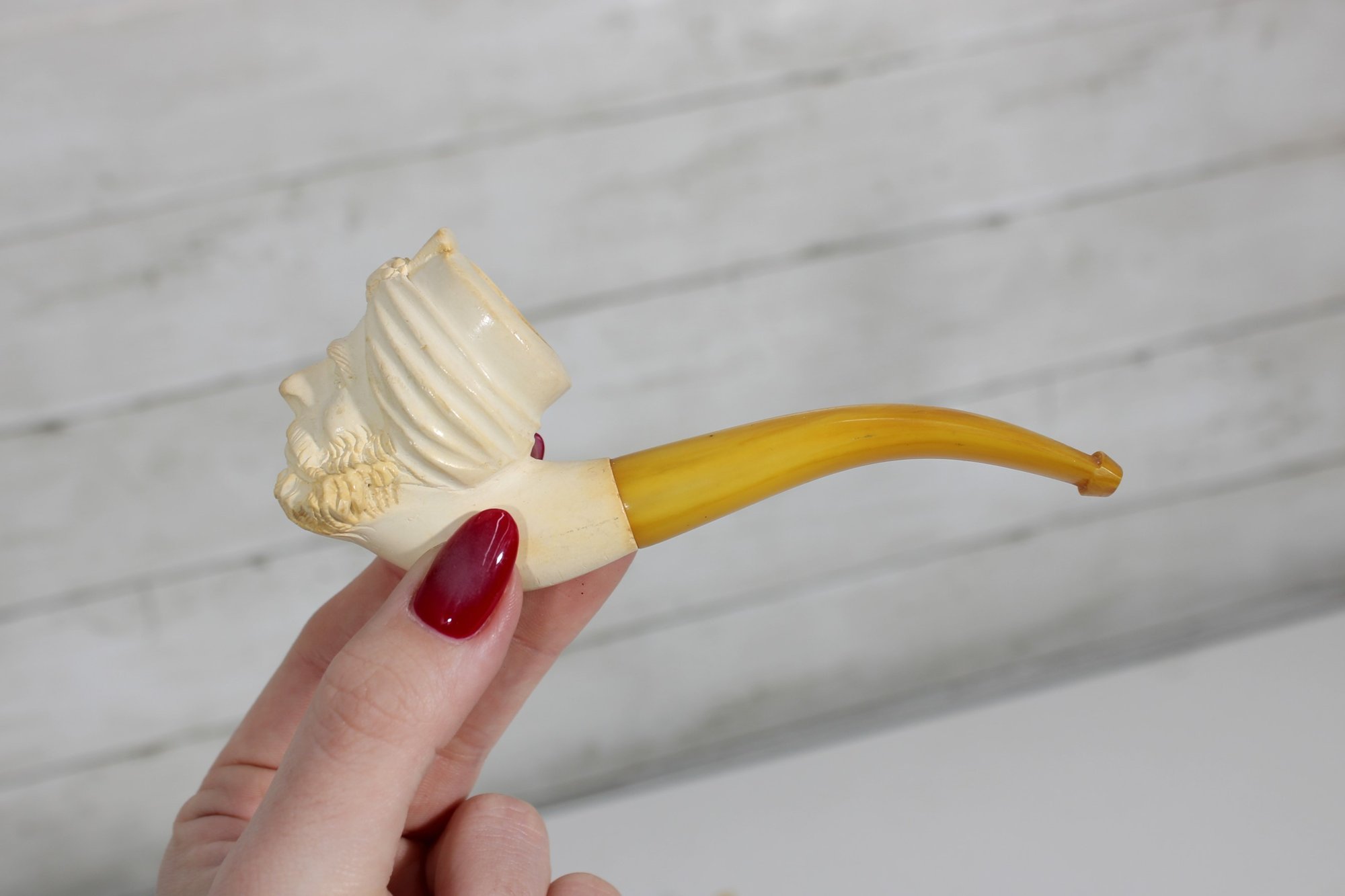 Unique set of two vintage carved figural pipes featuring detailed craftsmanship and striking character designs. Each pipe showcases a sculpted bearded figure wearing a turban, with intricate carved patterns along the stems and bowls.
