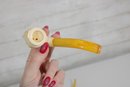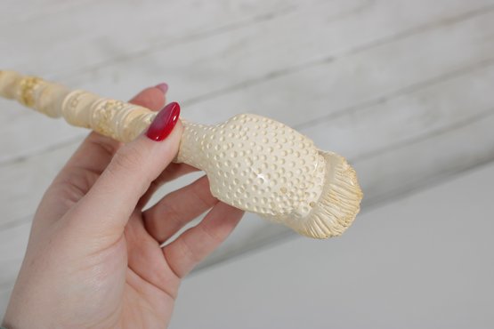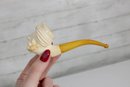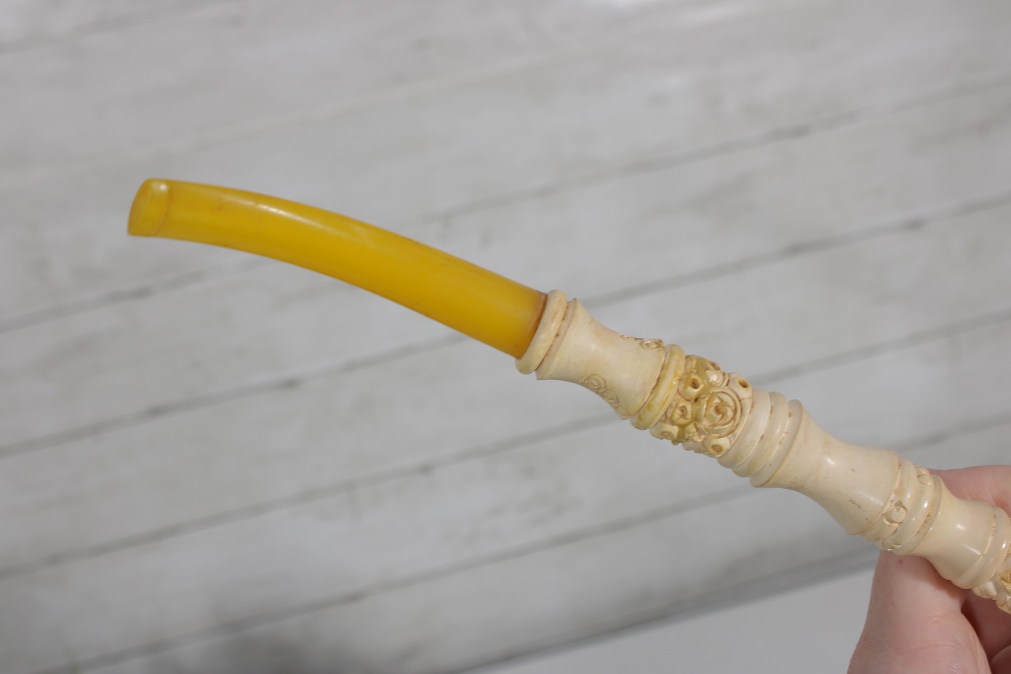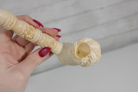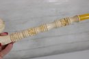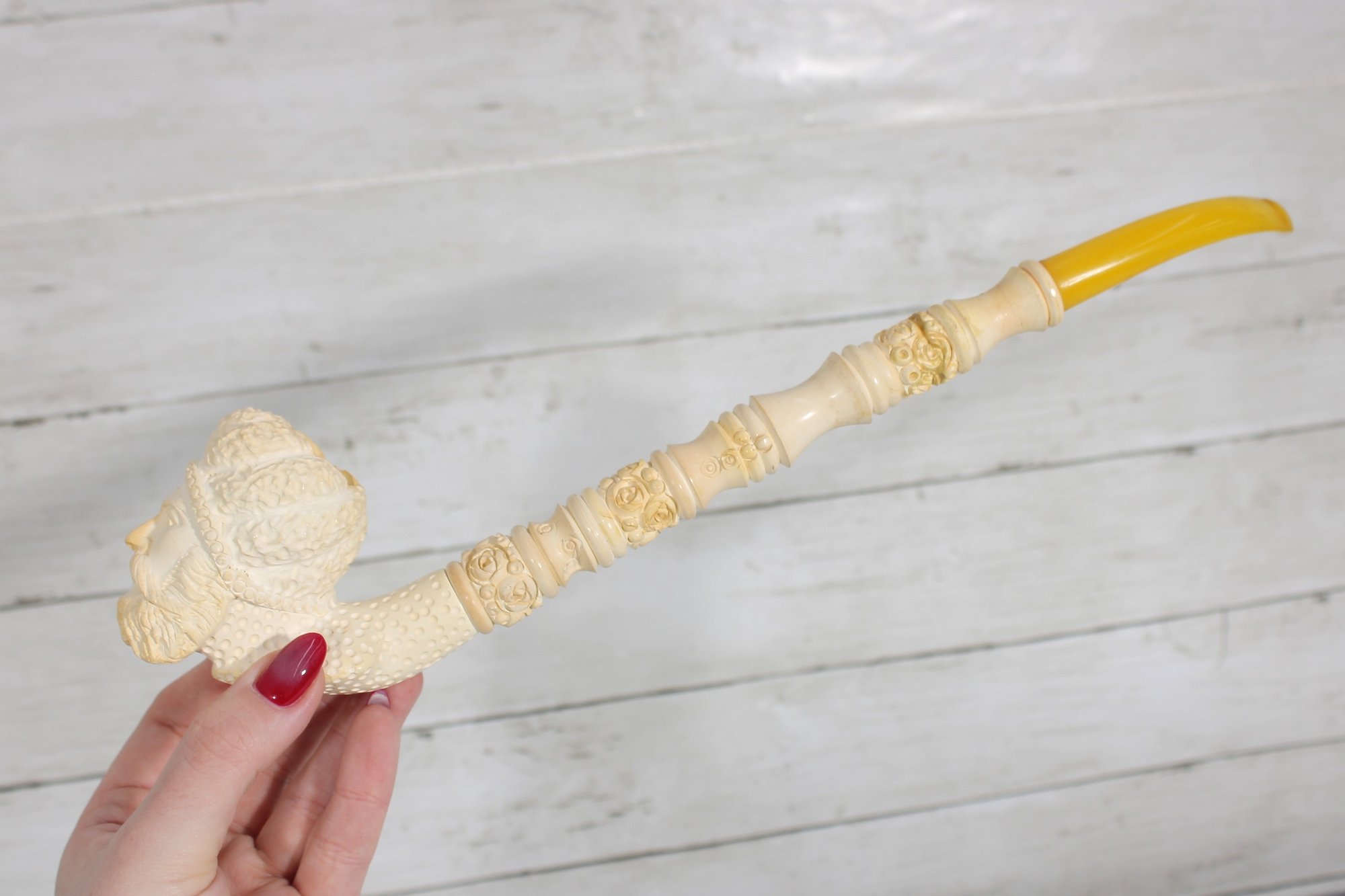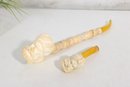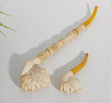 The larger pipe (13") is especially impressive, with multiple decorative sections and a long curved amber-tone mouthpiece, while the smaller pipe (5") mirrors the design in a compact form. Both display fine textural detail and an eye-catching antique-style finish, making them great conversation pieces.