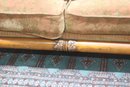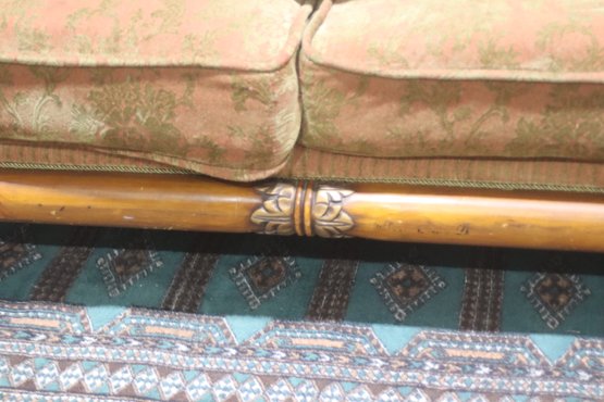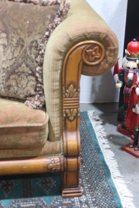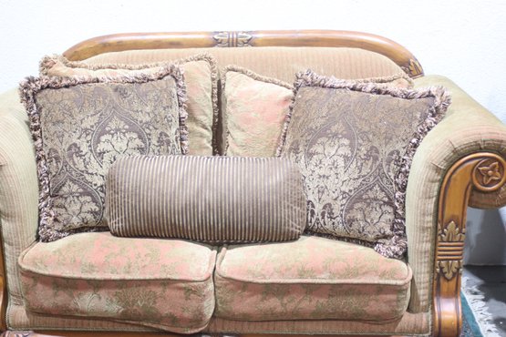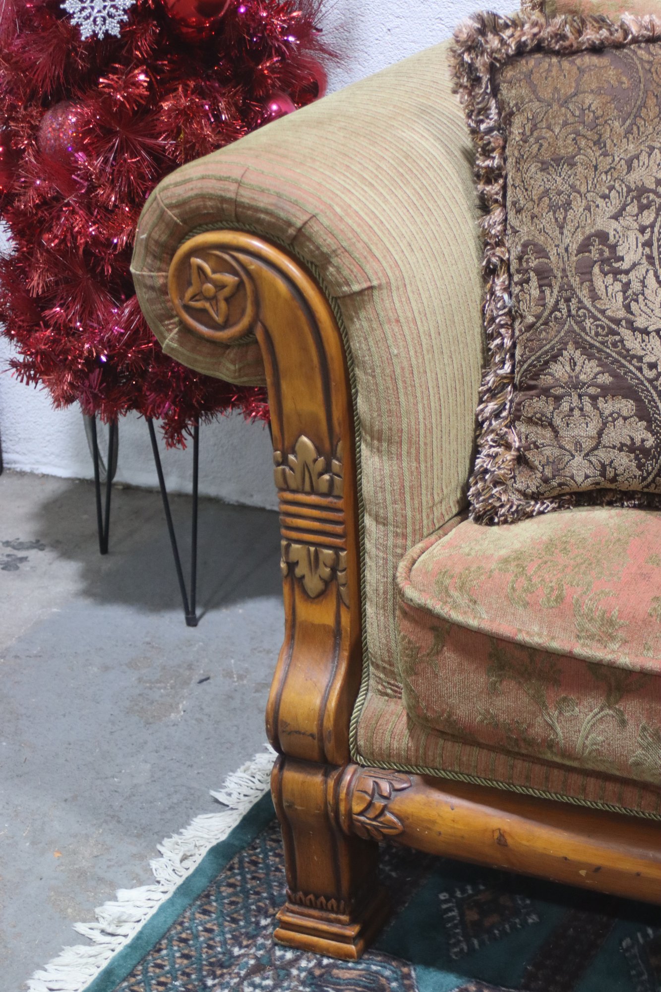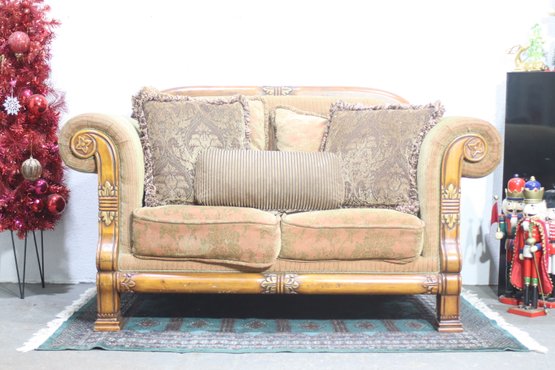 This beautiful vintage loveseat combines ornate wooden craftsmanship with plush comfort. The frame features intricately carved wood detailing along the arms, base, and back, exuding timeless elegance. Upholstered in soft, textured fabric with a subtle striped pattern, the loveseat comes with matching decorative cushions for added comfort and style.