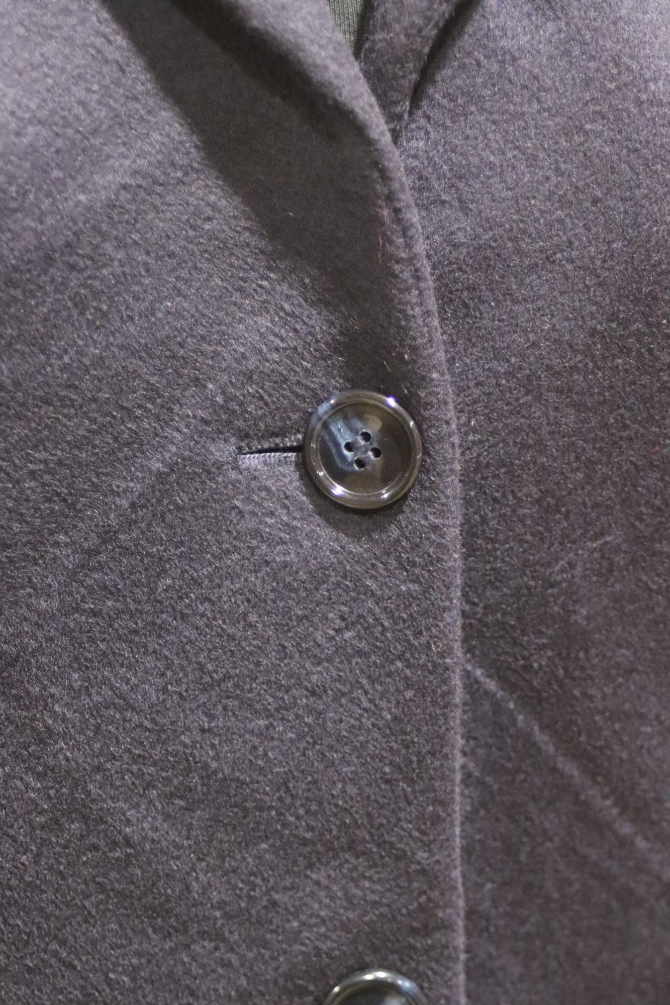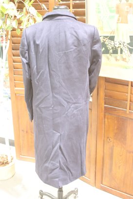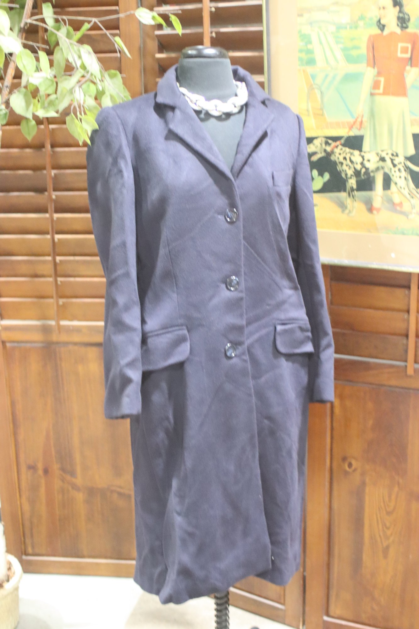 this sophisticated vintage navy cashmere blend coat. With its tailored silhouette and luxuriously soft fabric, this coat is perfect for both formal and casual occasions, offering timeless style and warmth.