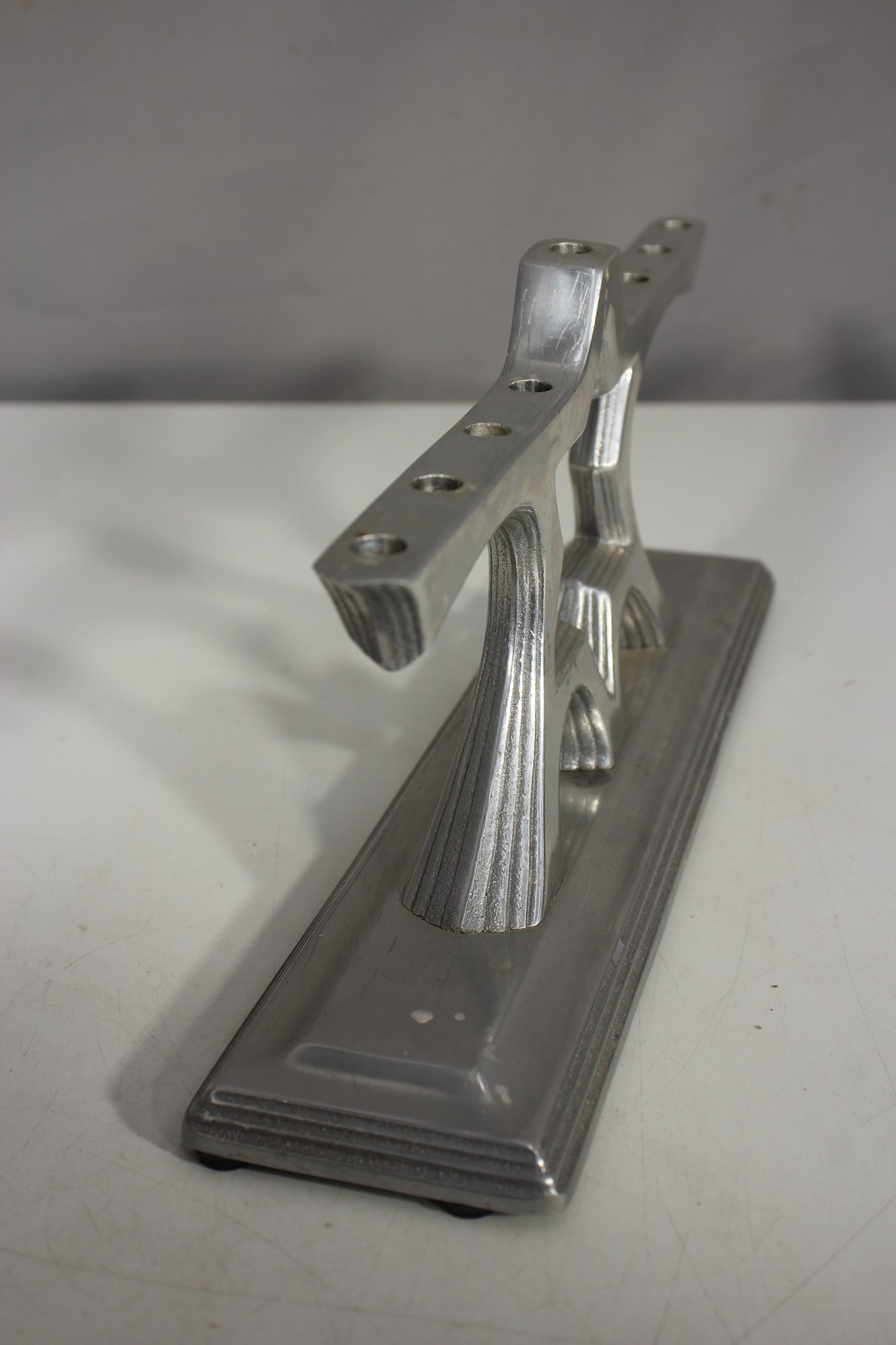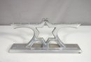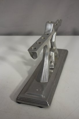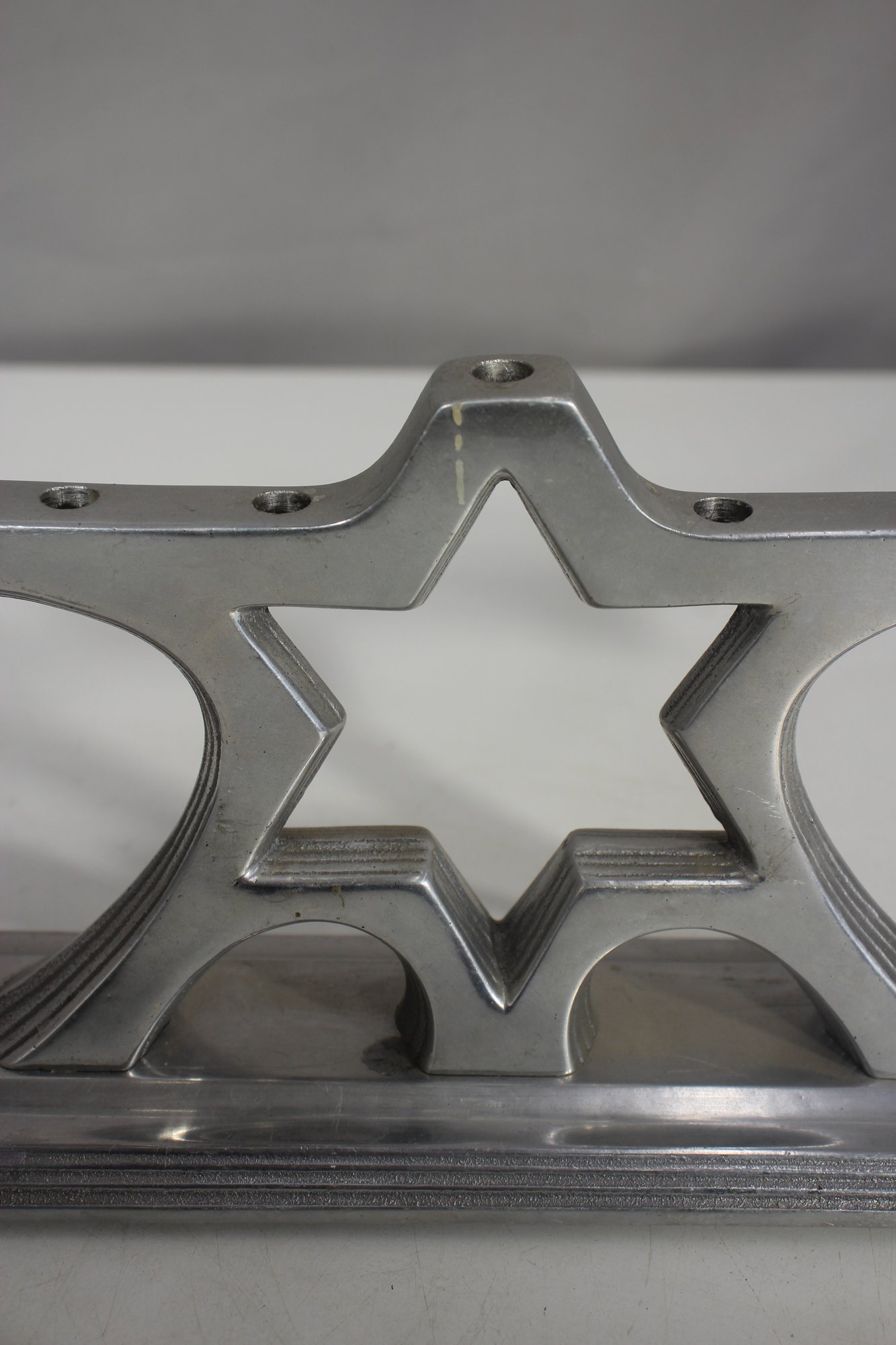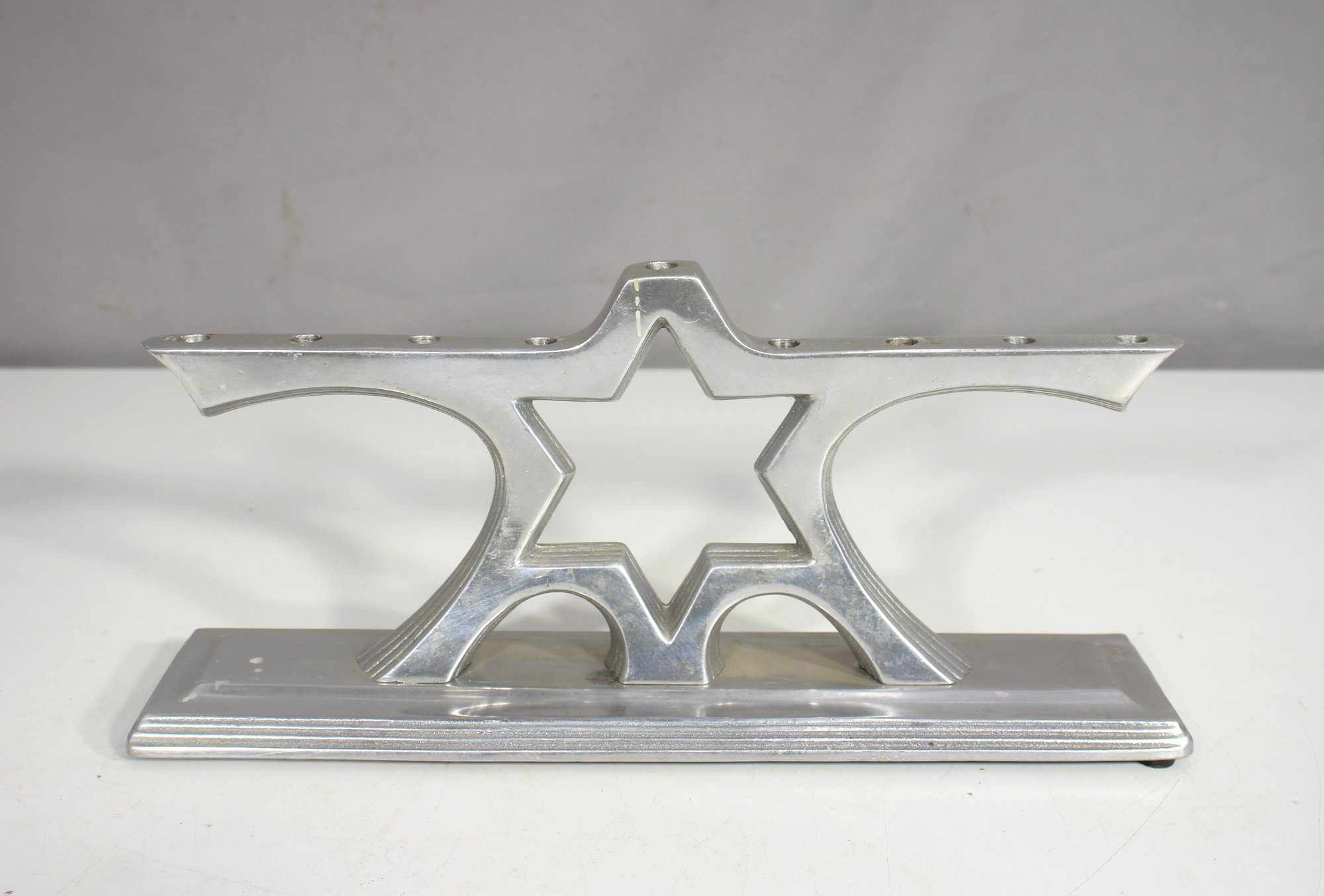 This vintage cast aluminum Hanukkah menorah features a sleek, modernist design with a striking Star of David centerpiece. The symmetrical structure and polished aluminum finish give it a stylish and contemporary aesthetic while maintaining its traditional significance.