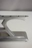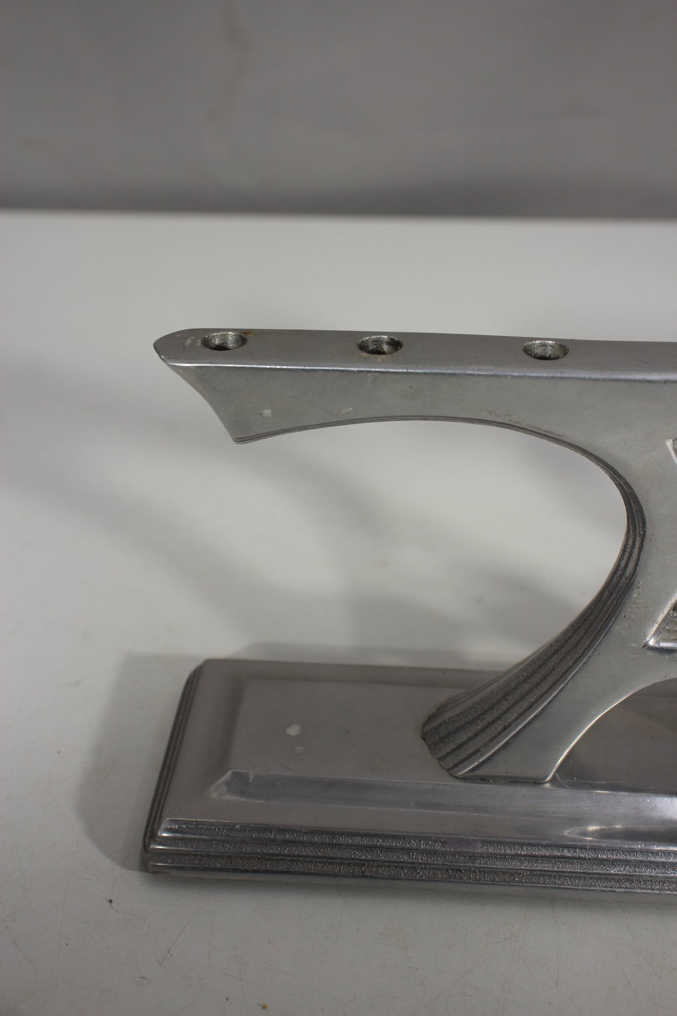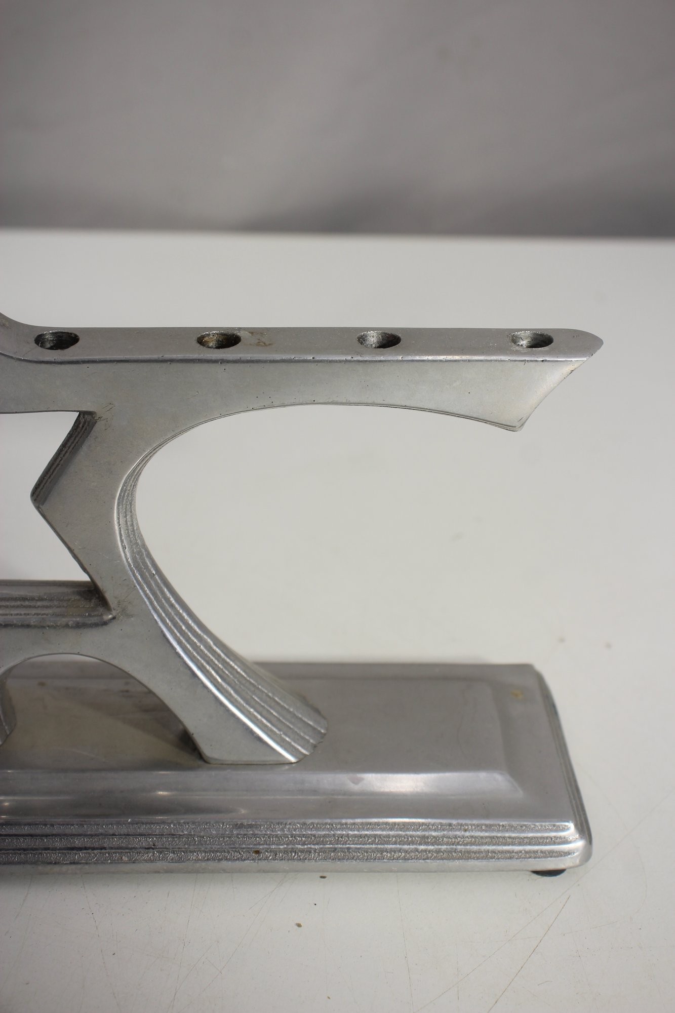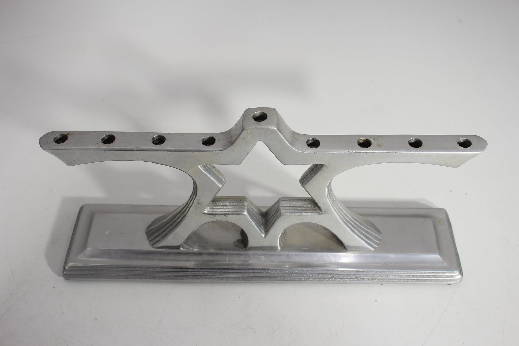 This vintage cast aluminum Hanukkah menorah features a sleek, modernist design with a striking Star of David centerpiece. The symmetrical structure and polished aluminum finish give it a stylish and contemporary aesthetic while maintaining its traditional significance.