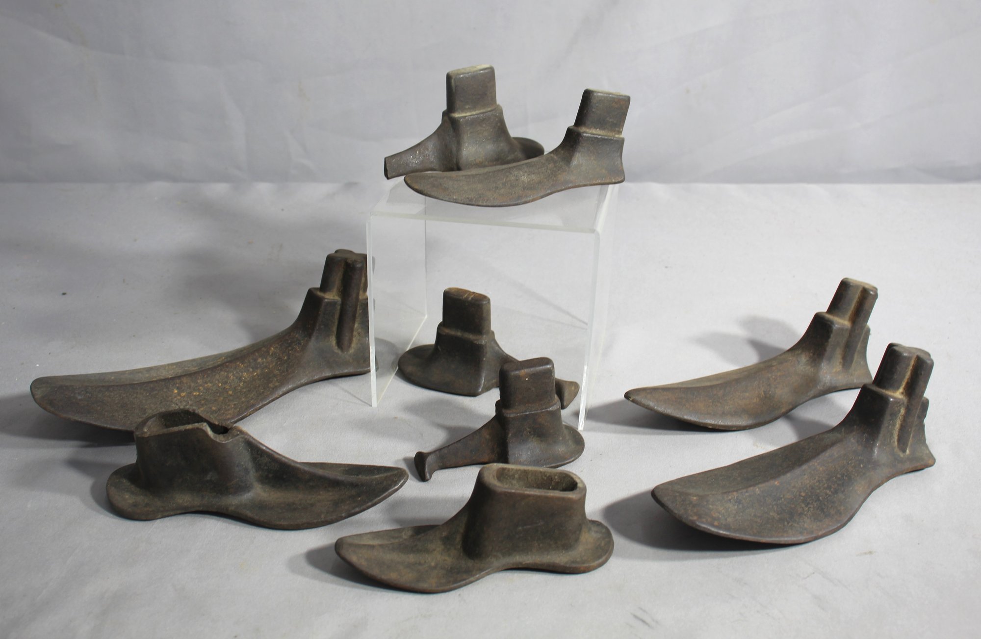 The lot includes various sizes and shapes, representing the different molds used to construct and repair footwear. The forms showcase a range of styles and sizes, indicative of the diverse footwear that cobblers would have worked on. Some are designed for adult shoes, while smaller forms indicate use for children's footwear.