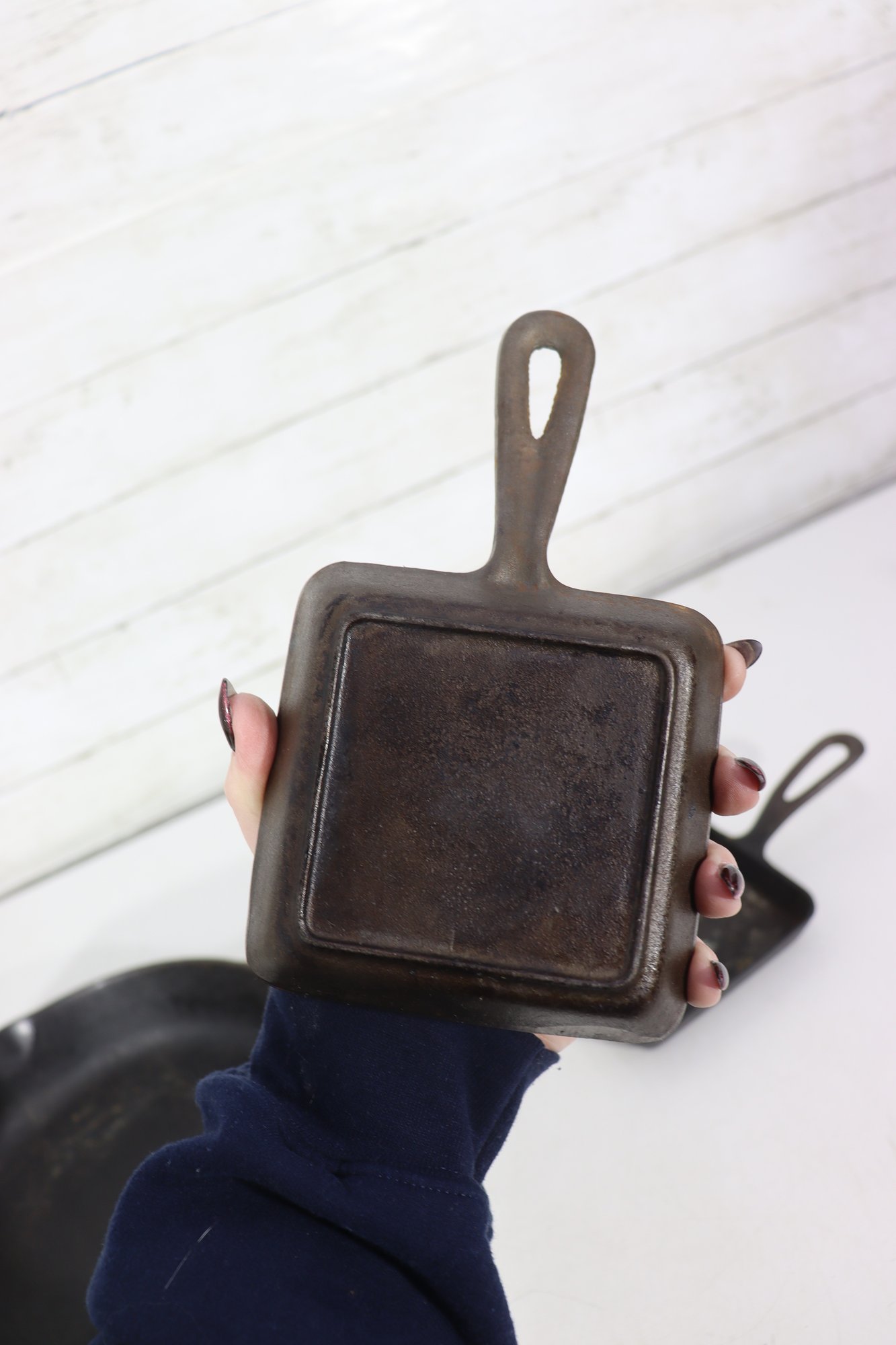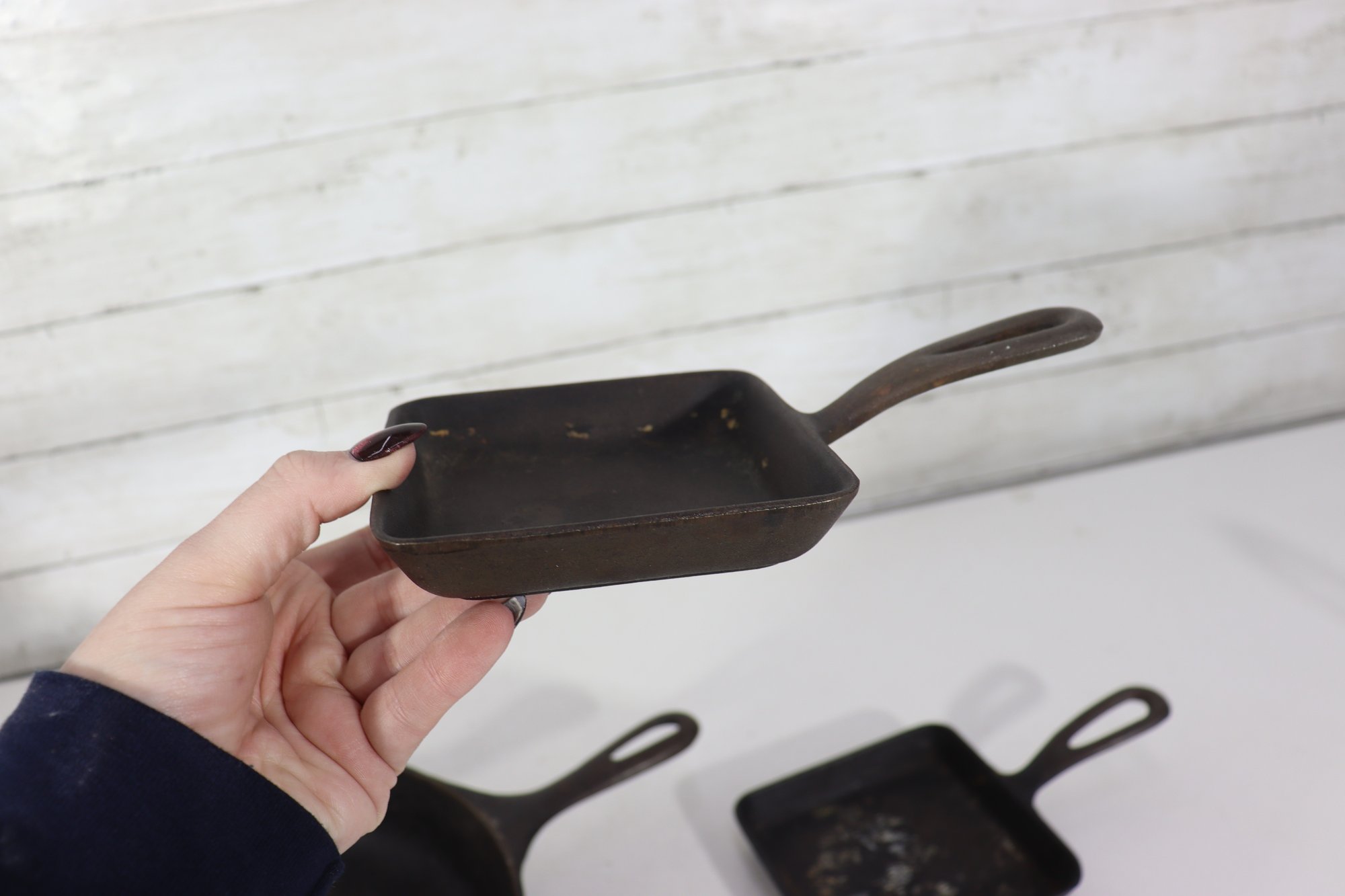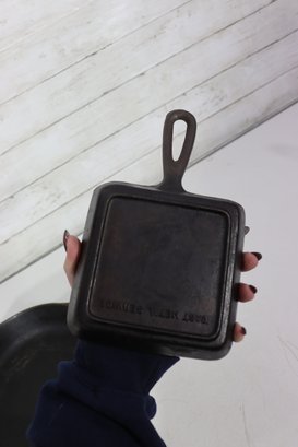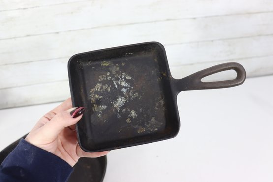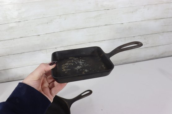 Two small cast iron pans measuring approximately 5.5” x 4.5” each