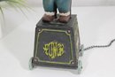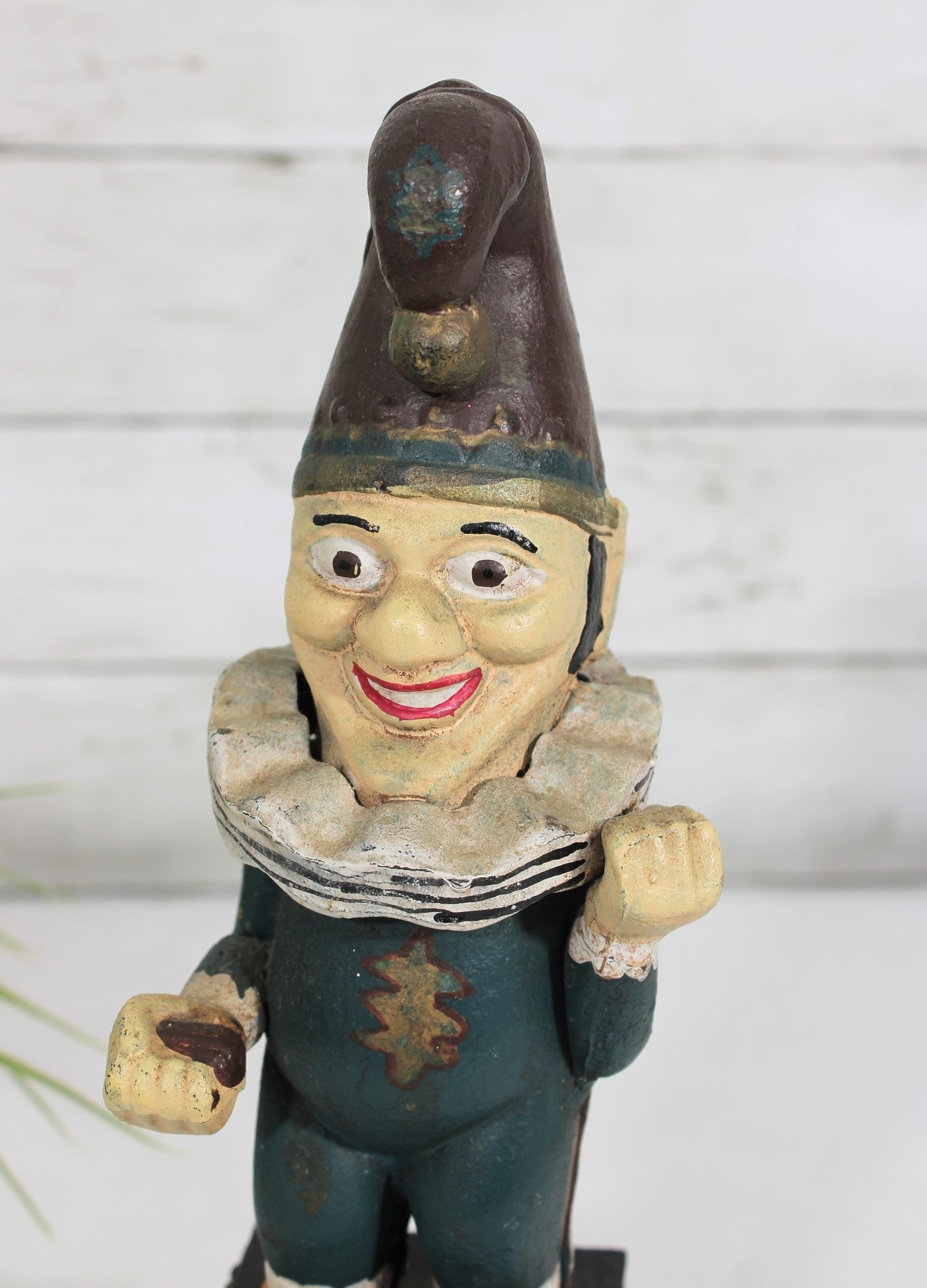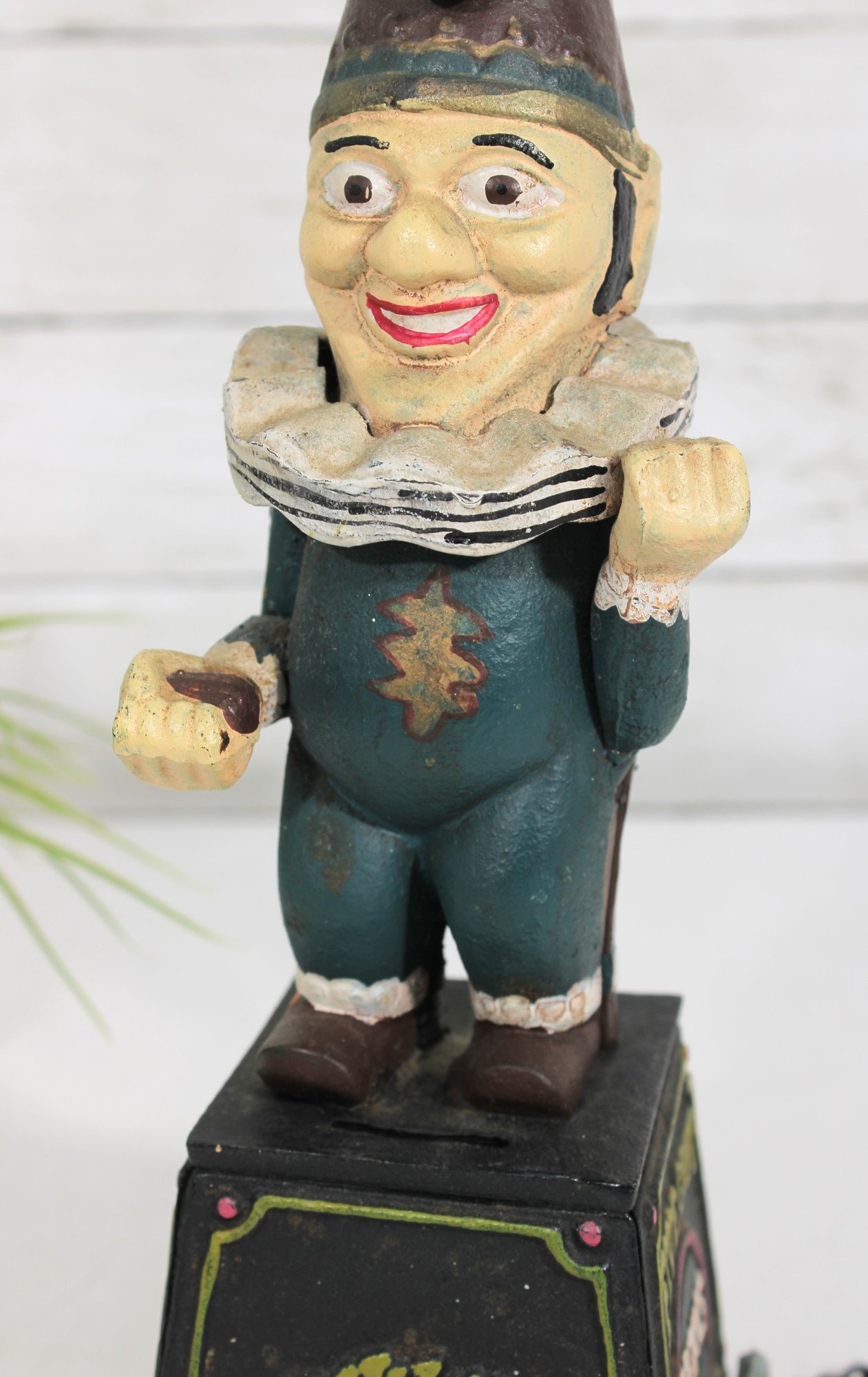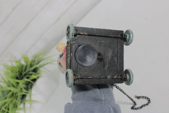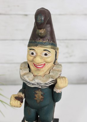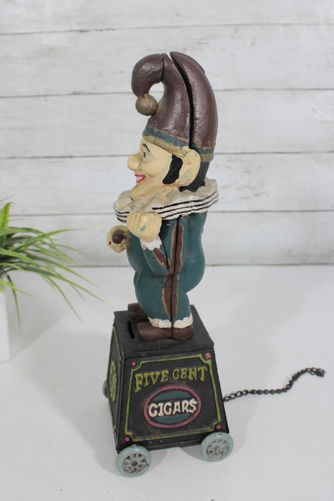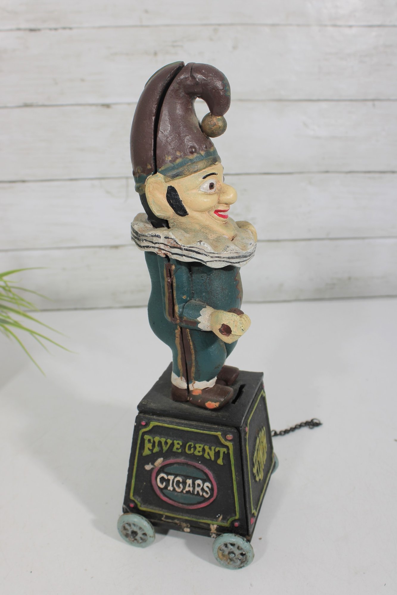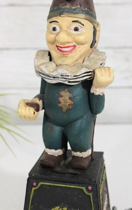 Wonderful vintage cast iron mechanical bank featuring a whimsical clown/jester figure standing atop a wheeled base. The base is decorated with classic “Five Cent Cigars” advertising graphics, giving this piece strong antique charm and collectible appeal.