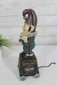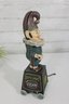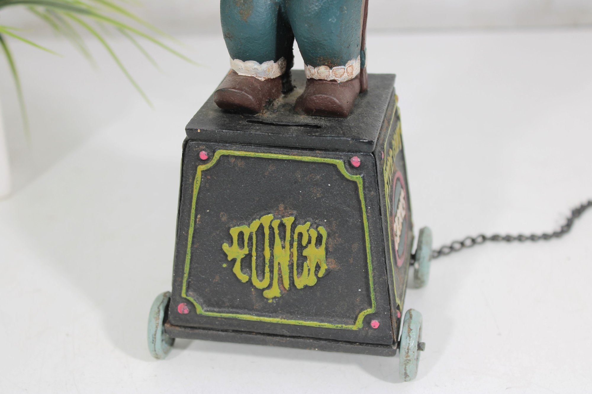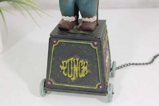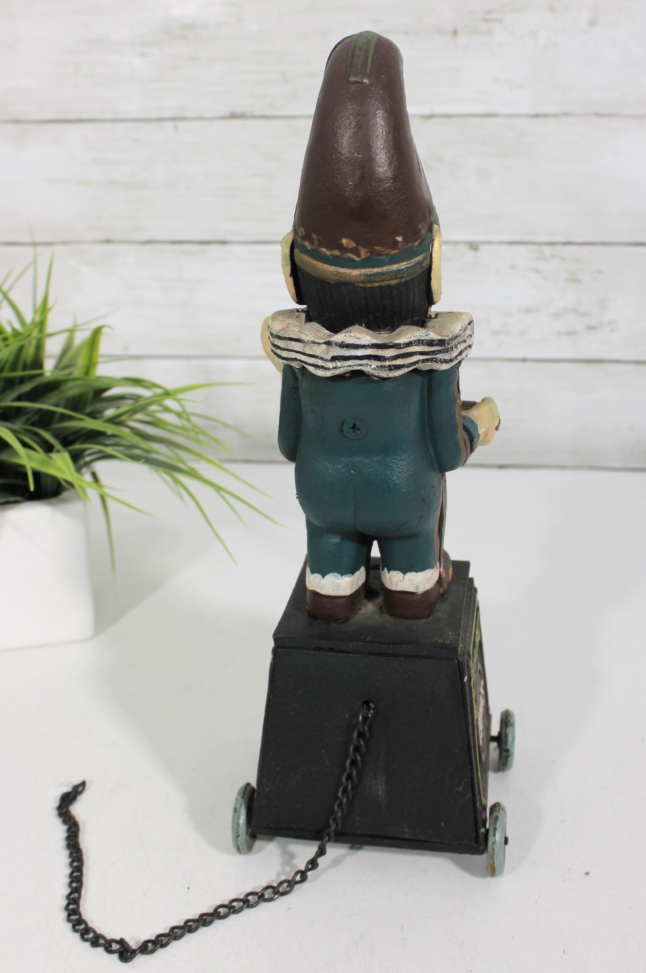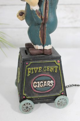 The figure is hand-painted with vibrant colors and expressive detail, holding a cigar and posed in a playful stance. The bank sits on four small wheels and includes a chain pull mechanism (functionality not tested).
