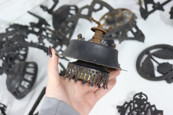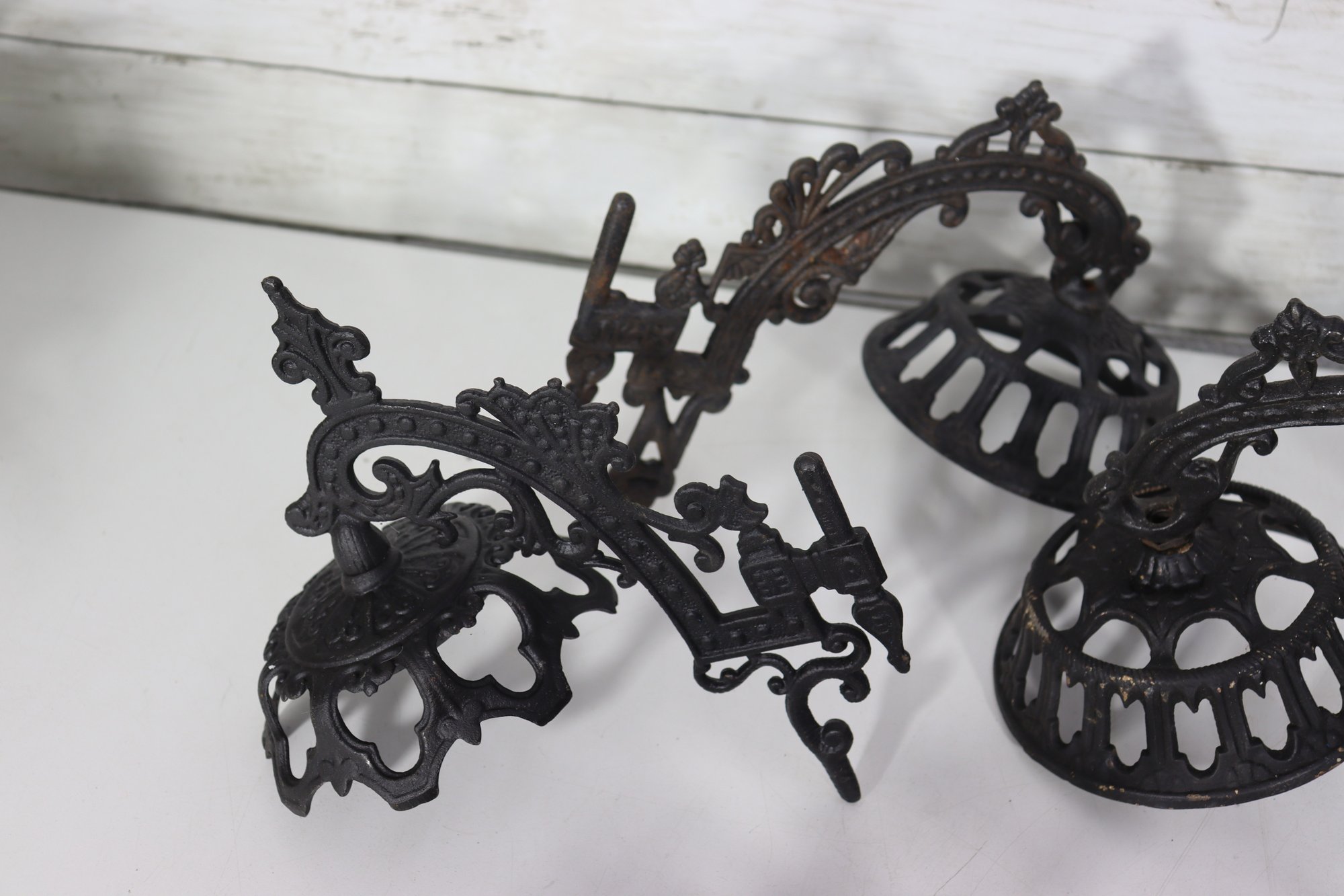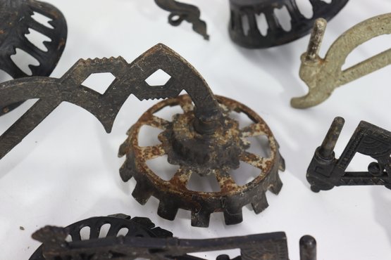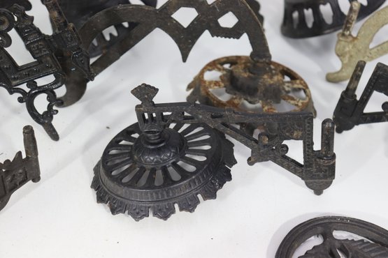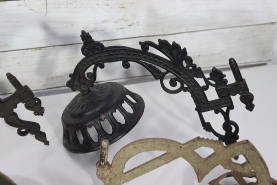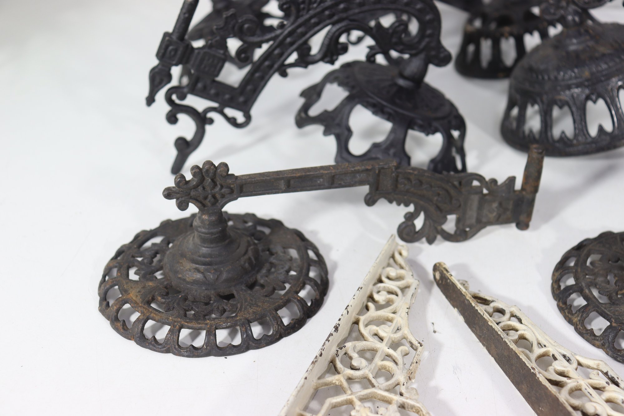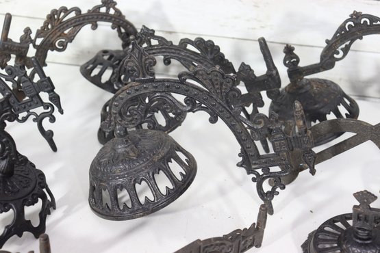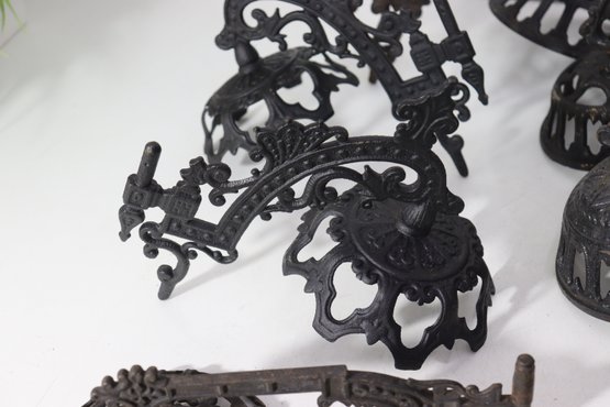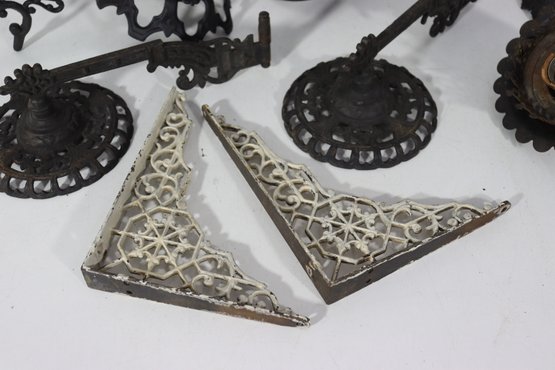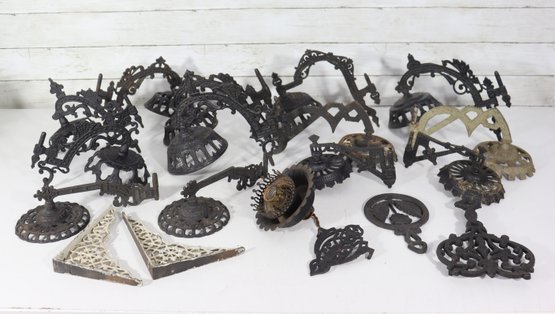 Large mixed group lot of vintage cast iron hardware, featuring an assortment of ornate brackets, wall mounts, lamp or sconce arms, and decorative architectural elements. These pieces showcase beautiful Victorian and industrial-era detailing with rich patina and aged character.