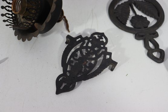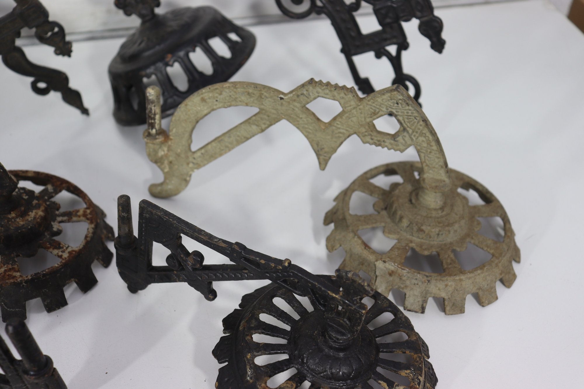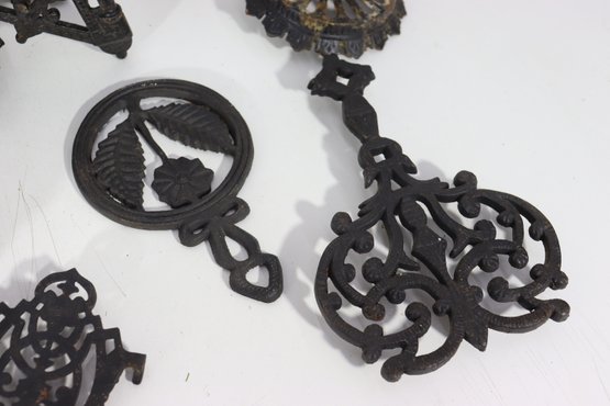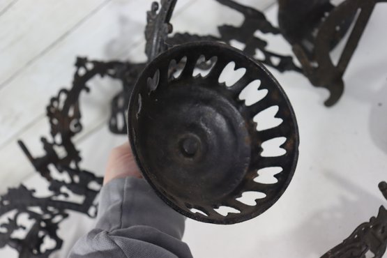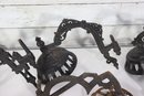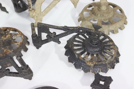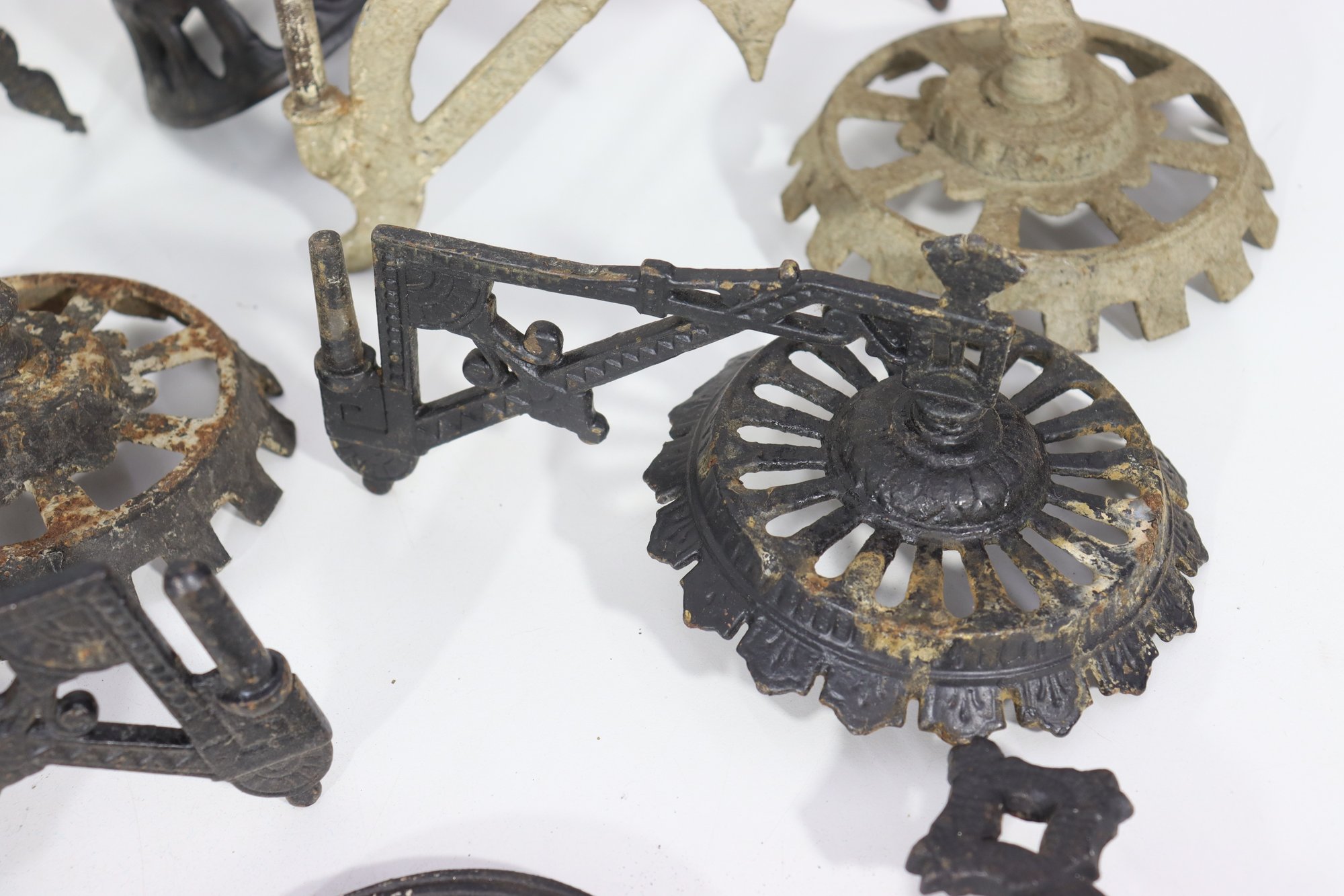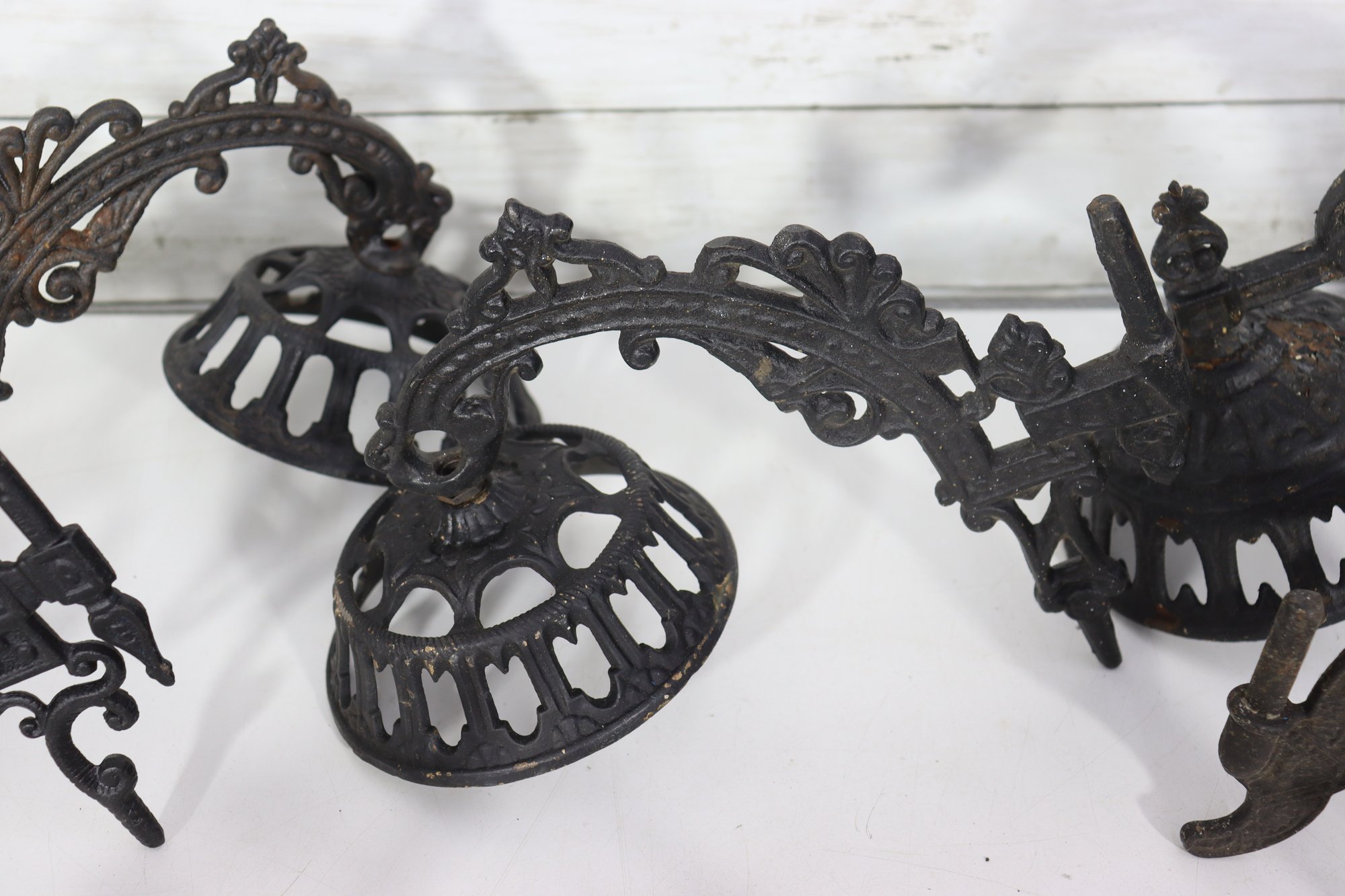 Large mixed group lot of vintage cast iron hardware, featuring an assortment of ornate brackets, wall mounts, lamp or sconce arms, and decorative architectural elements. These pieces showcase beautiful Victorian and industrial-era detailing with rich patina and aged character.