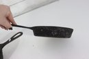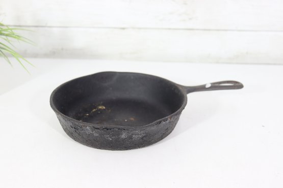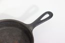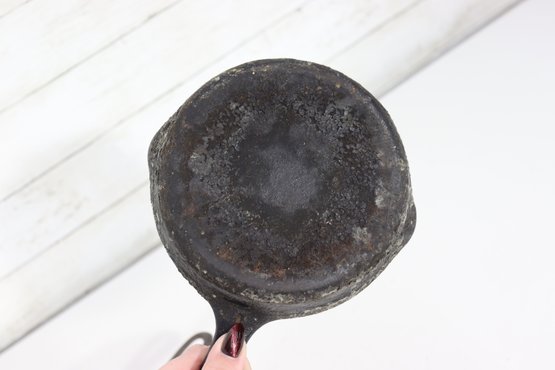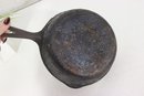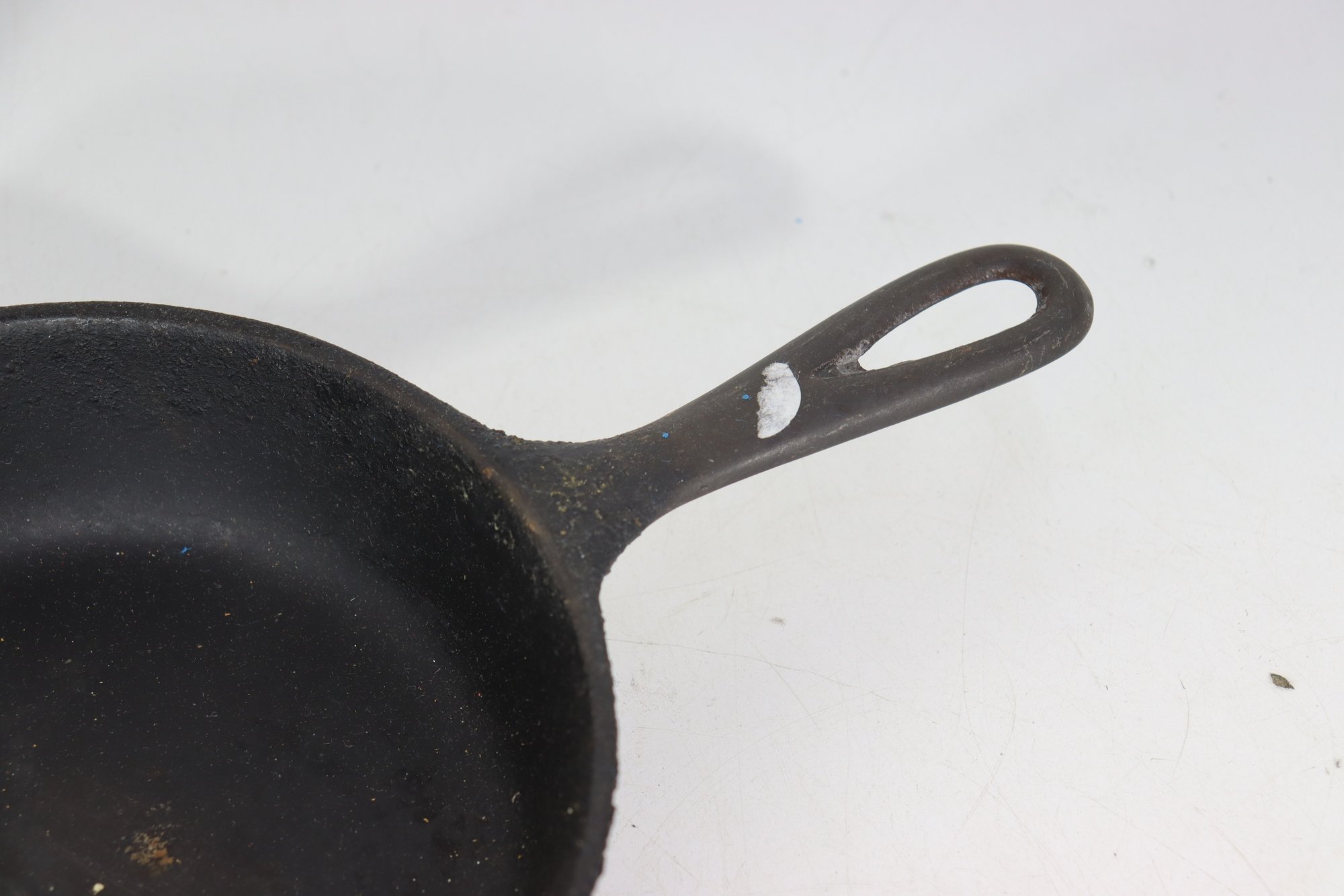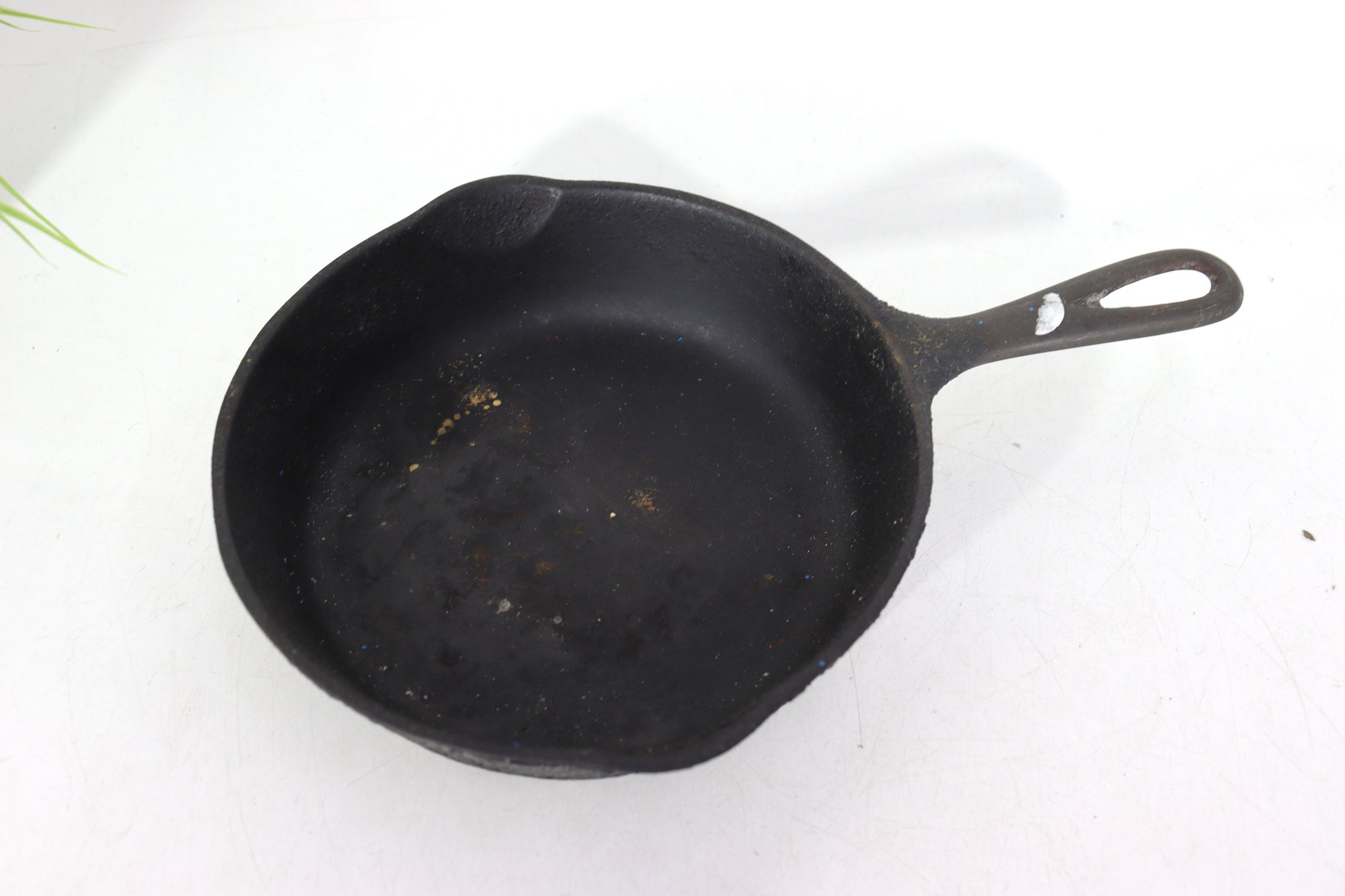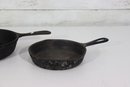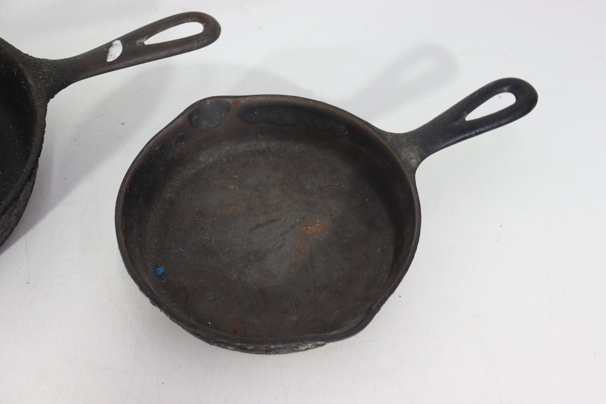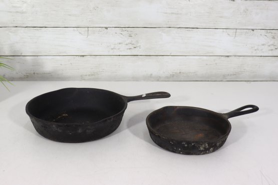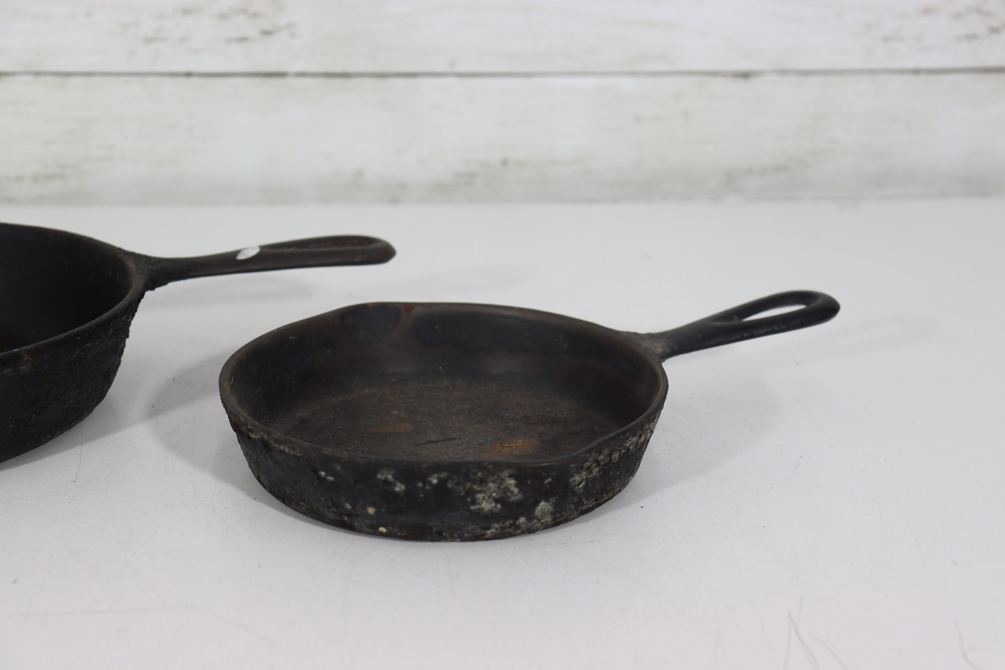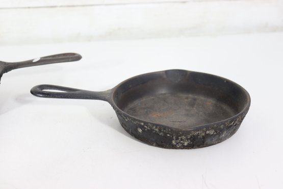 a set of two vintage cast iron skillets, measuring approximately 6.5 inches and 8 inches in diameter. These classic pans feature solid construction, smooth cooking surfaces, and traditional long handles, making them perfect for both cooking and display.