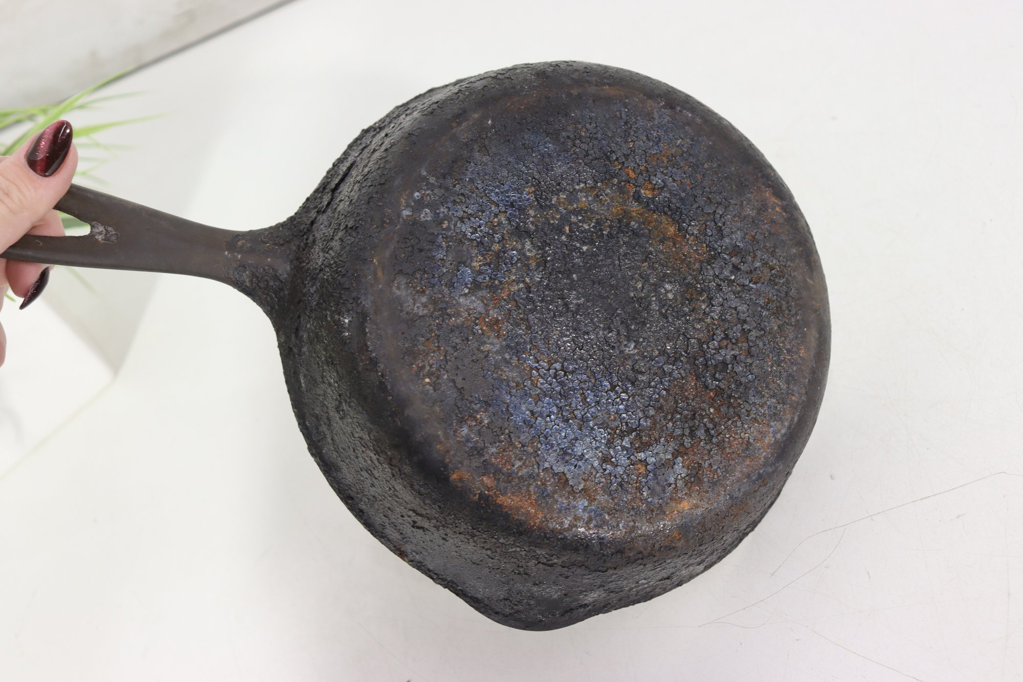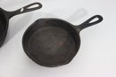 These skillets show honest age and use, with surface patina and seasoning buildup consistent with vintage cookware. They would be excellent candidates for restoration, re-seasoning, or continued everyday use.