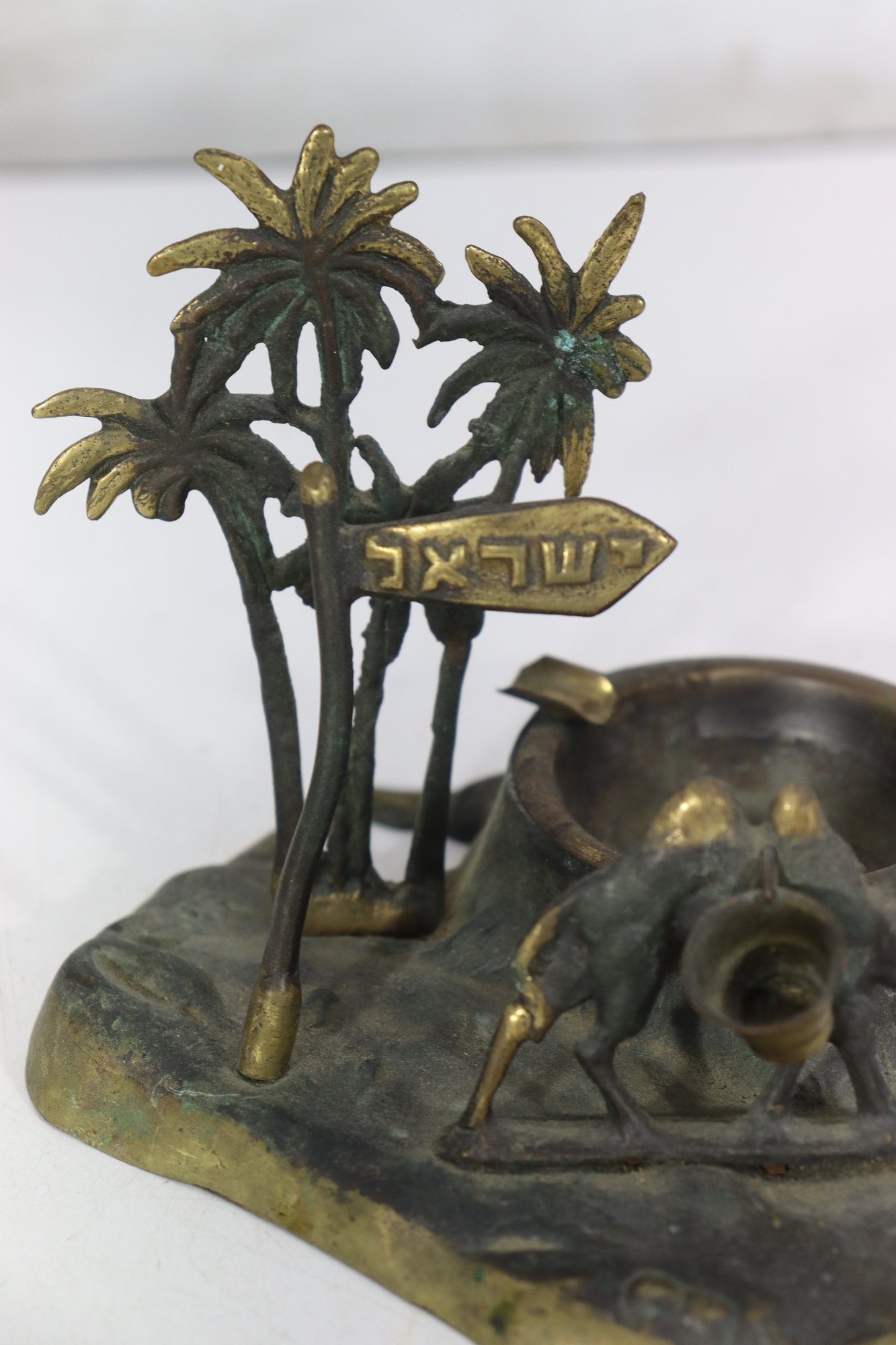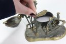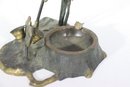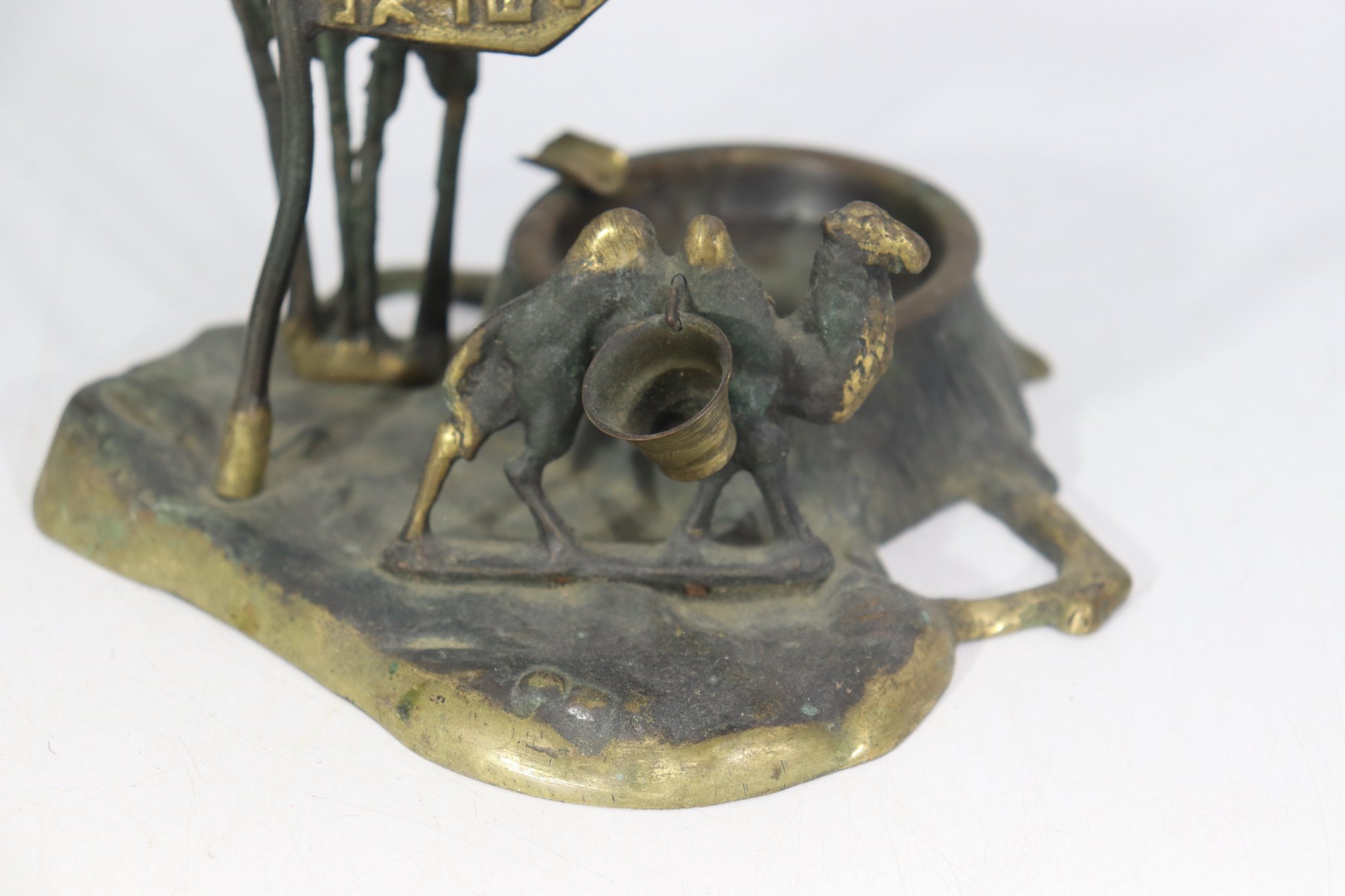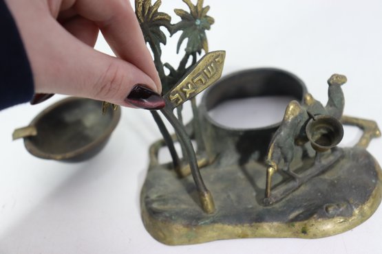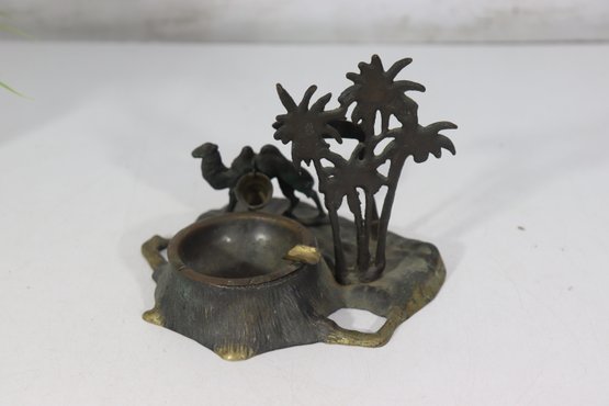 a vintage cast metal ashtray , featuring a Middle Eastern–inspired scene with camels, palm trees, and a desert motif. The piece includes a recessed circular inkwell integrated into the base, along with sculptural details throughout.