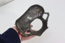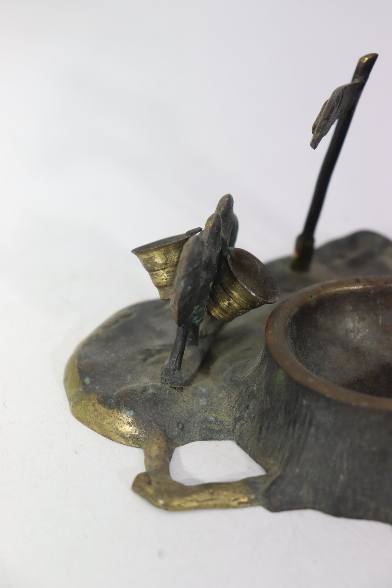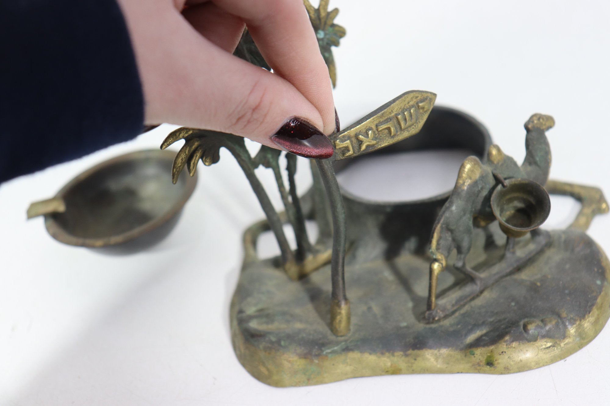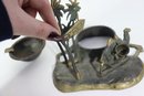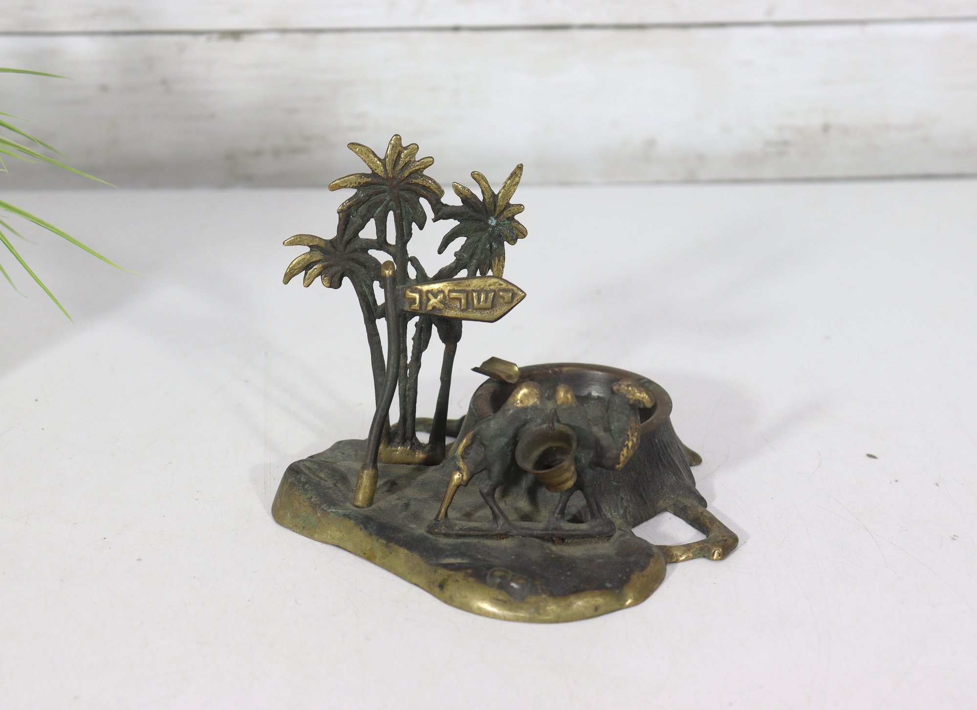 a vintage cast metal ashtray , featuring a Middle Eastern–inspired scene with camels, palm trees, and a desert motif. The piece includes a recessed circular inkwell integrated into the base, along with sculptural details throughout.