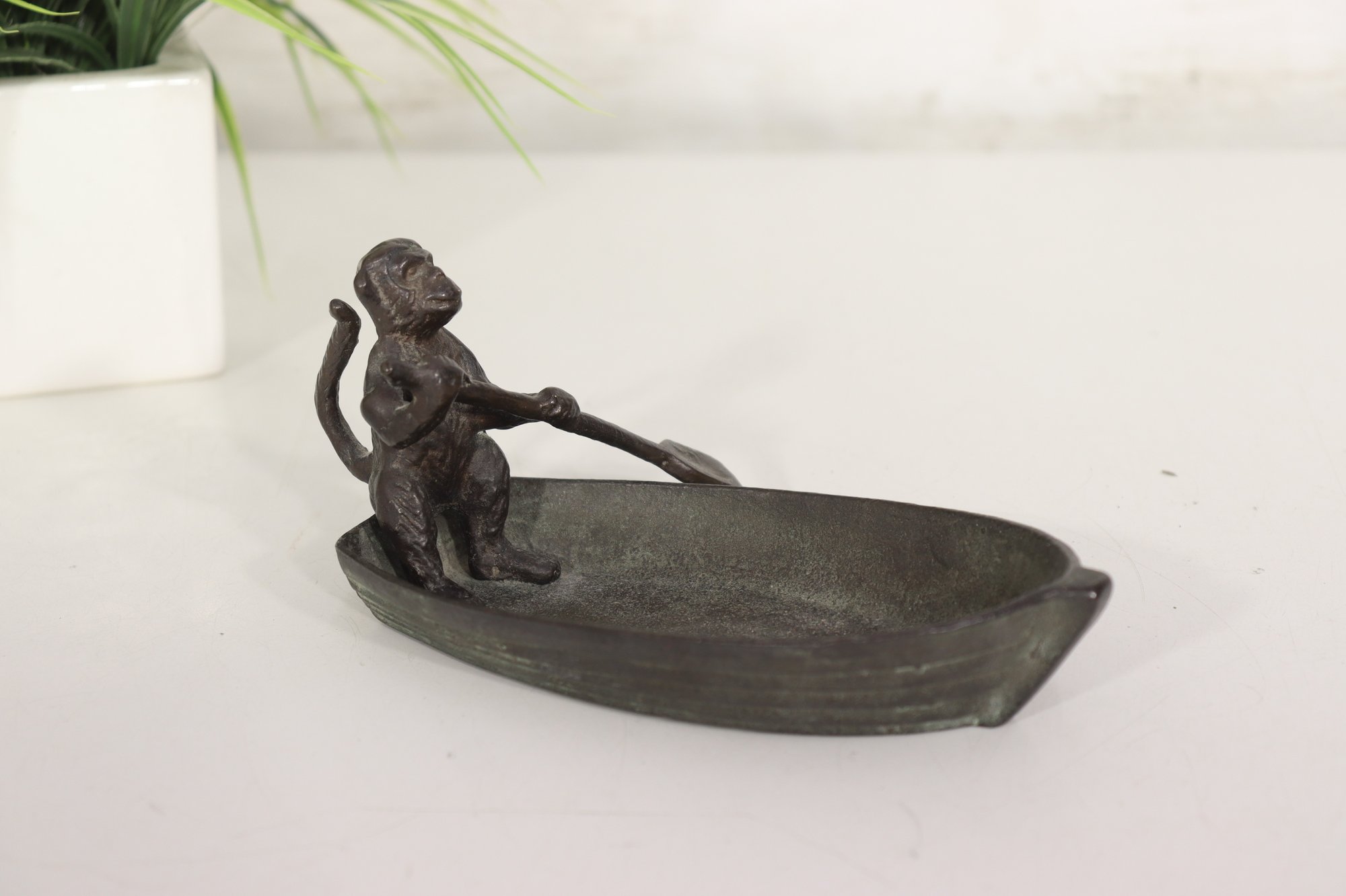 Unique vintage cast metal figural trinket dish featuring a monkey standing and rowing inside a small boat. Great whimsical detail and sculptural character. Heavy cast metal construction with aged patina.