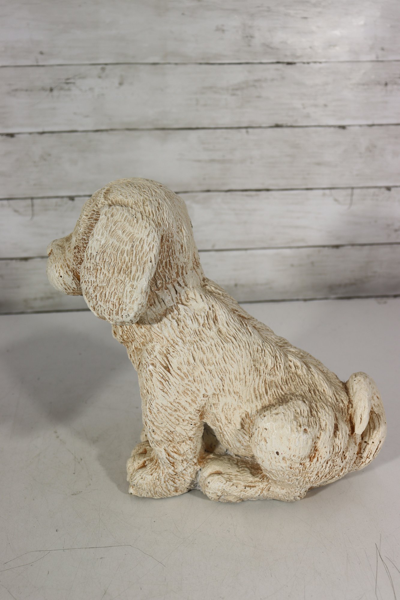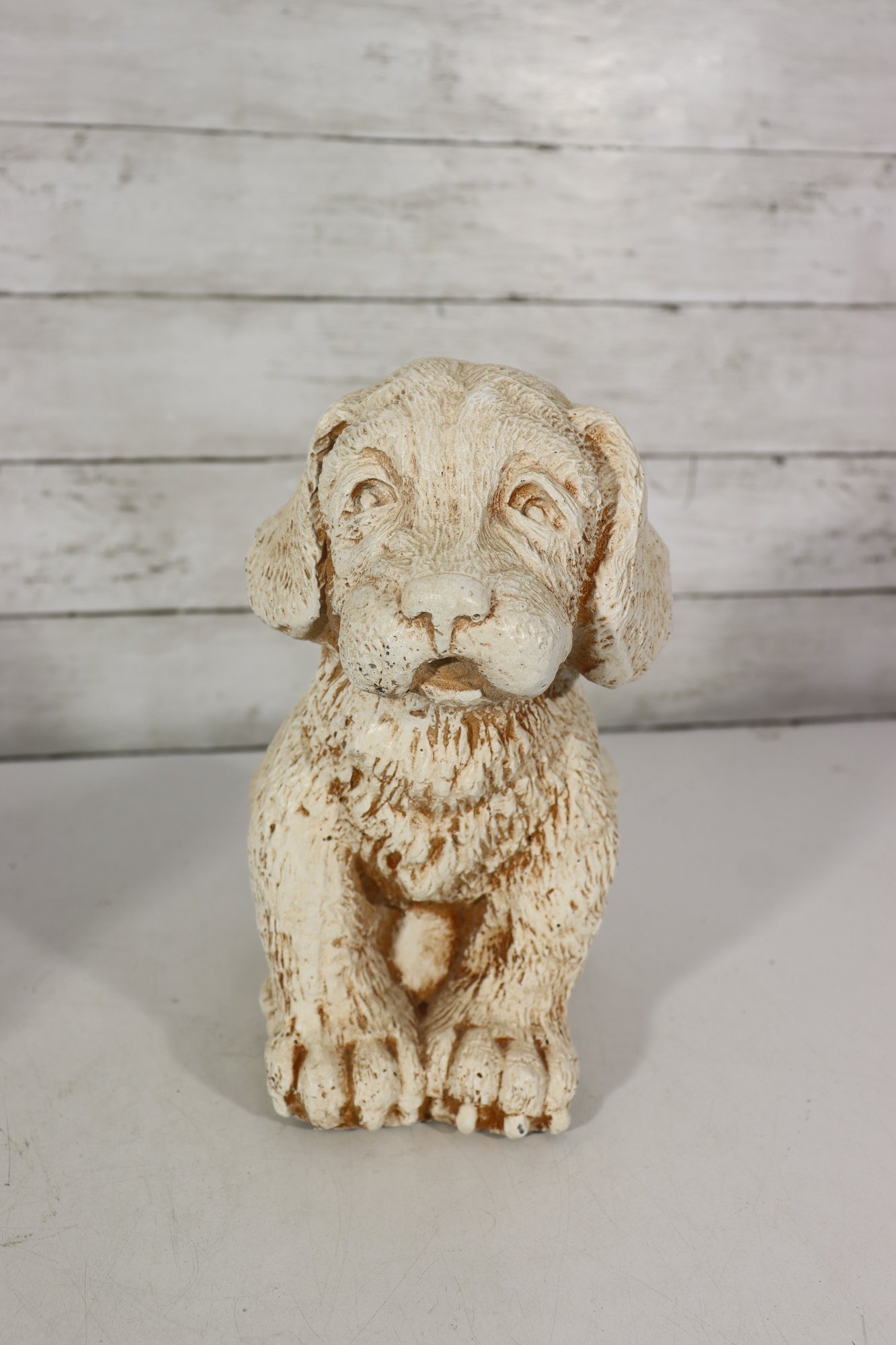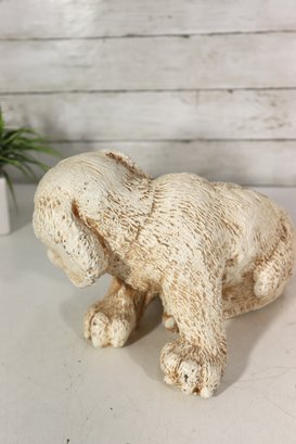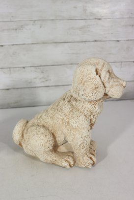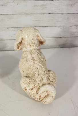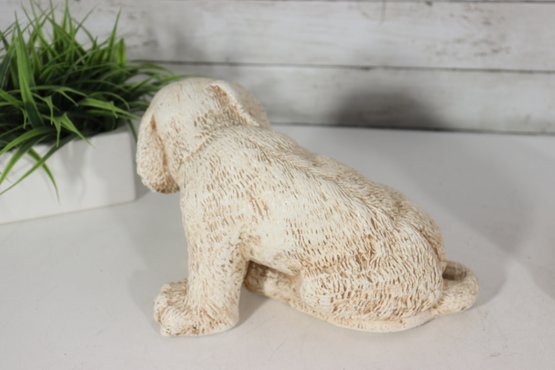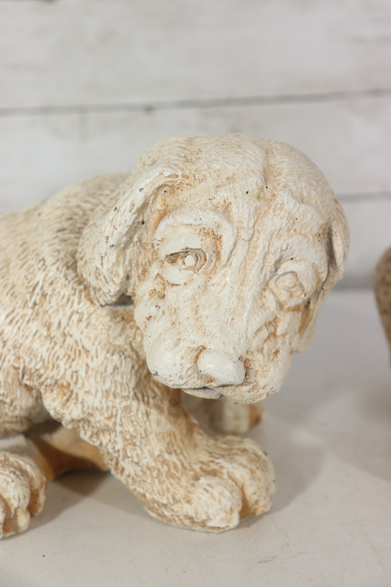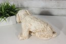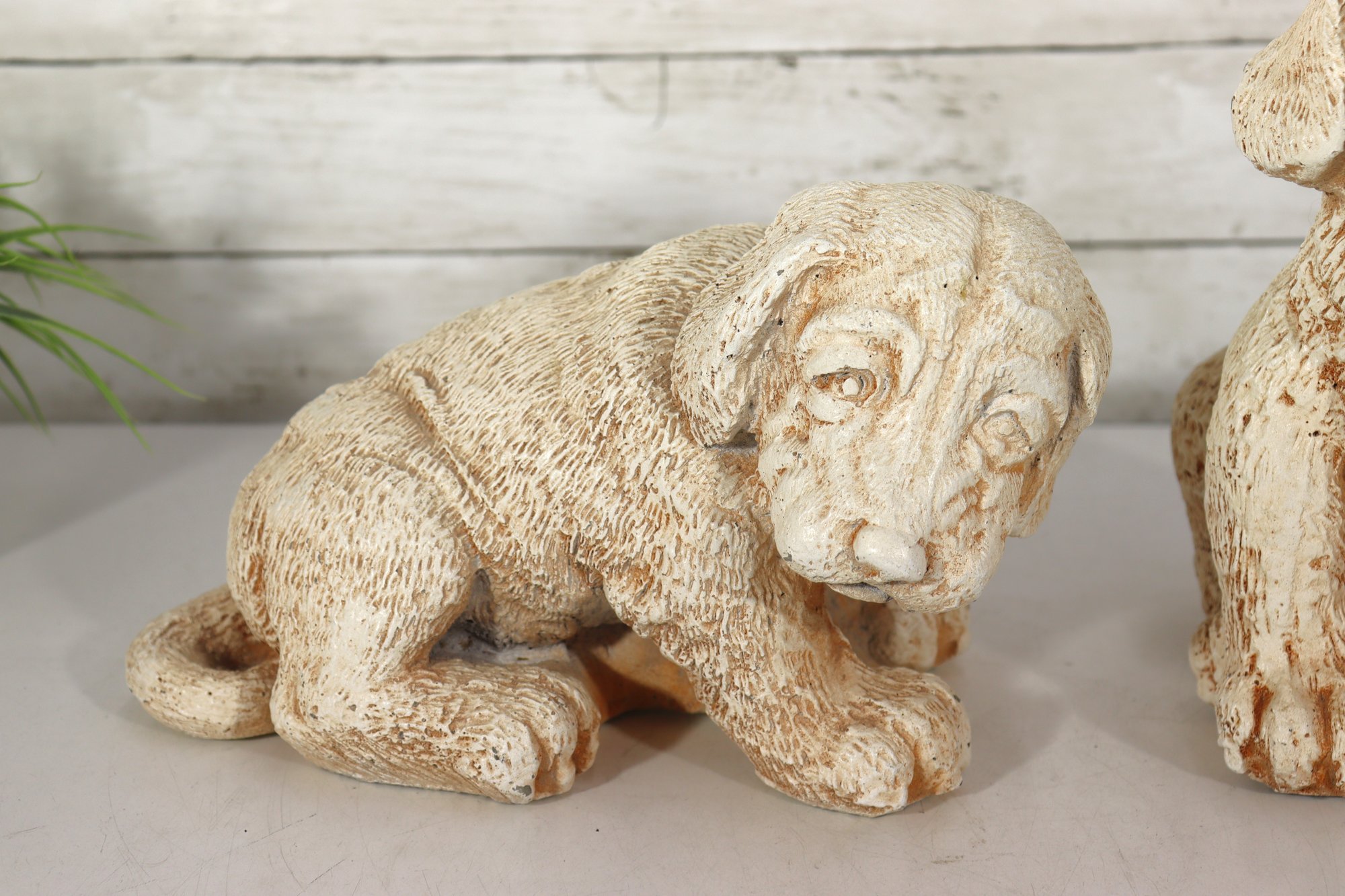 vintage pair of cast stone dog figurines, featuring two sweet puppy designs in complementary poses.