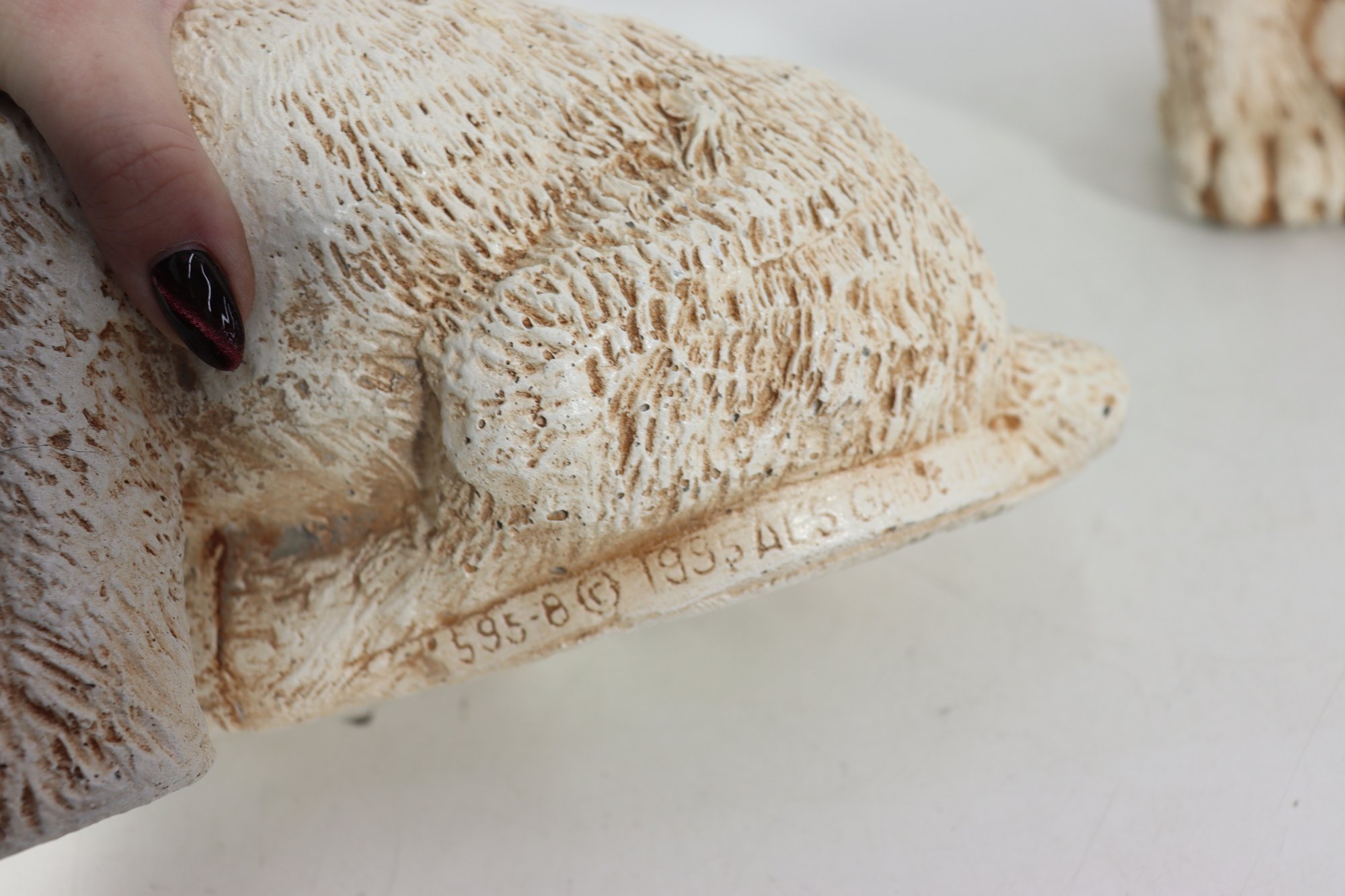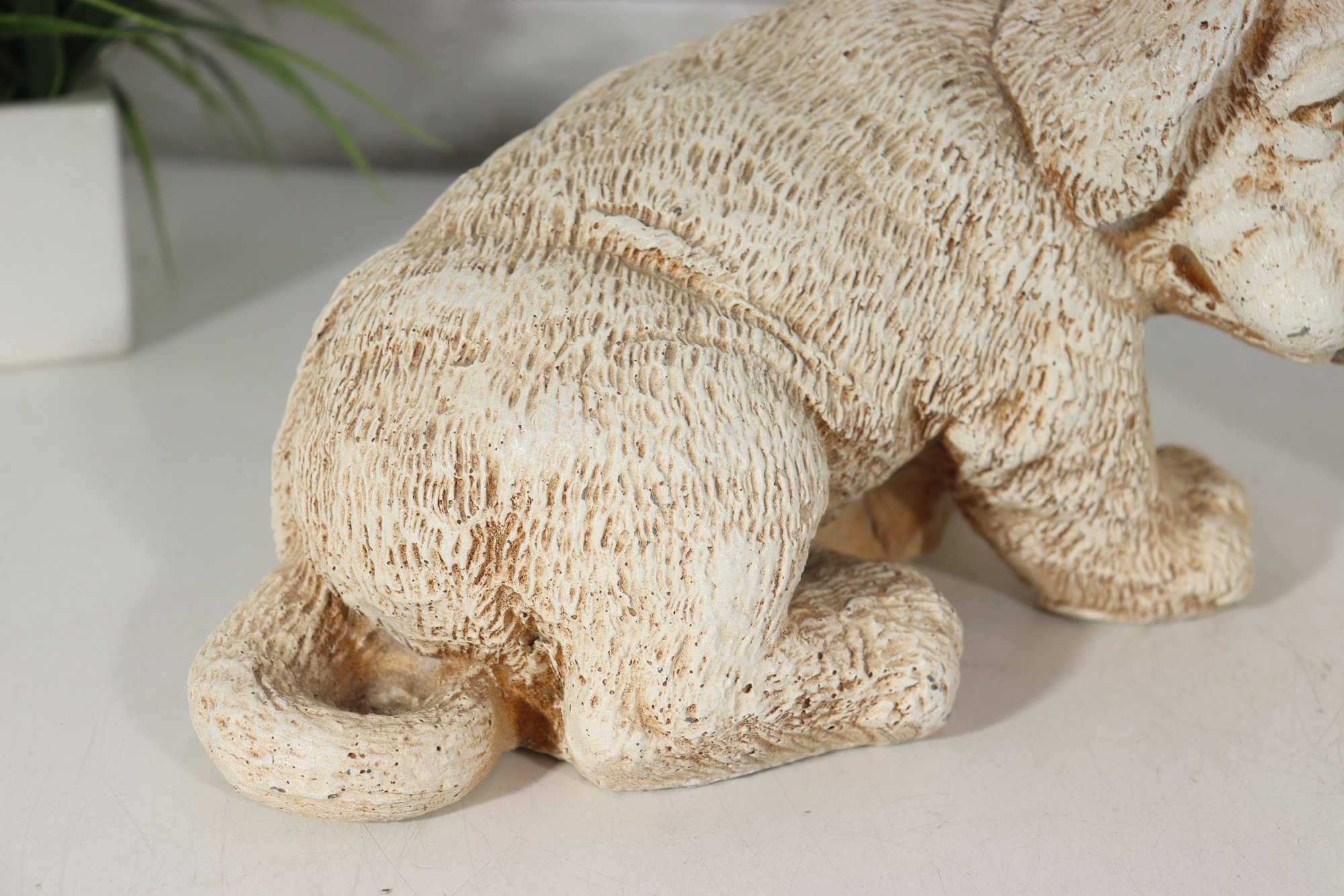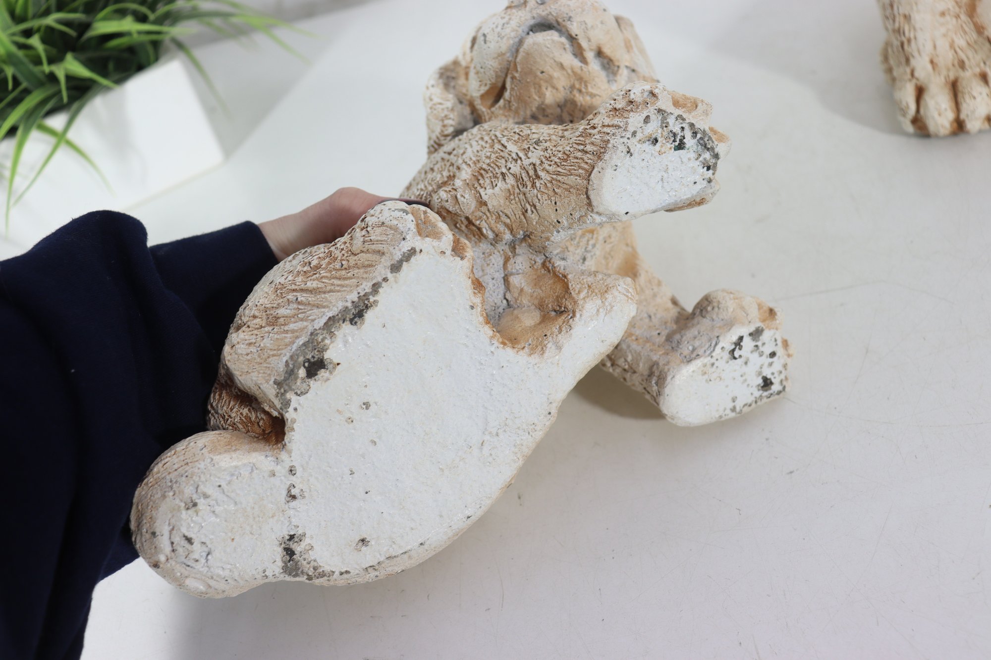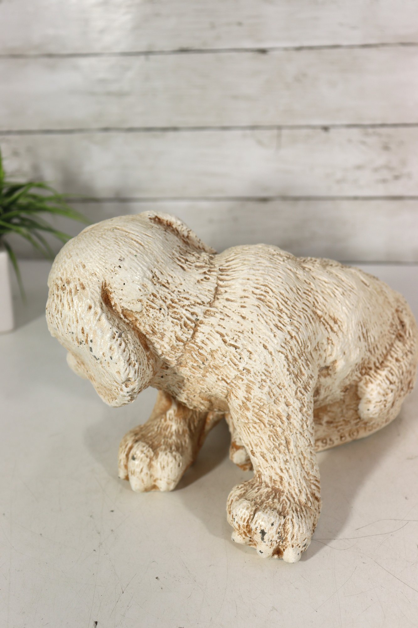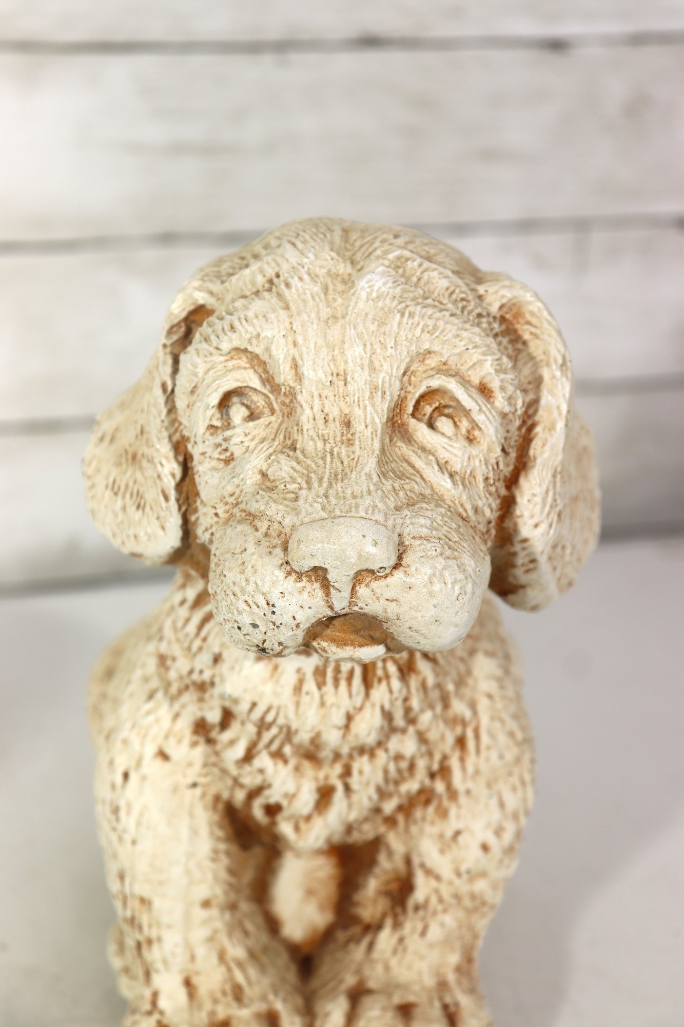 vintage pair of cast stone dog figurines, featuring two sweet puppy designs in complementary poses.